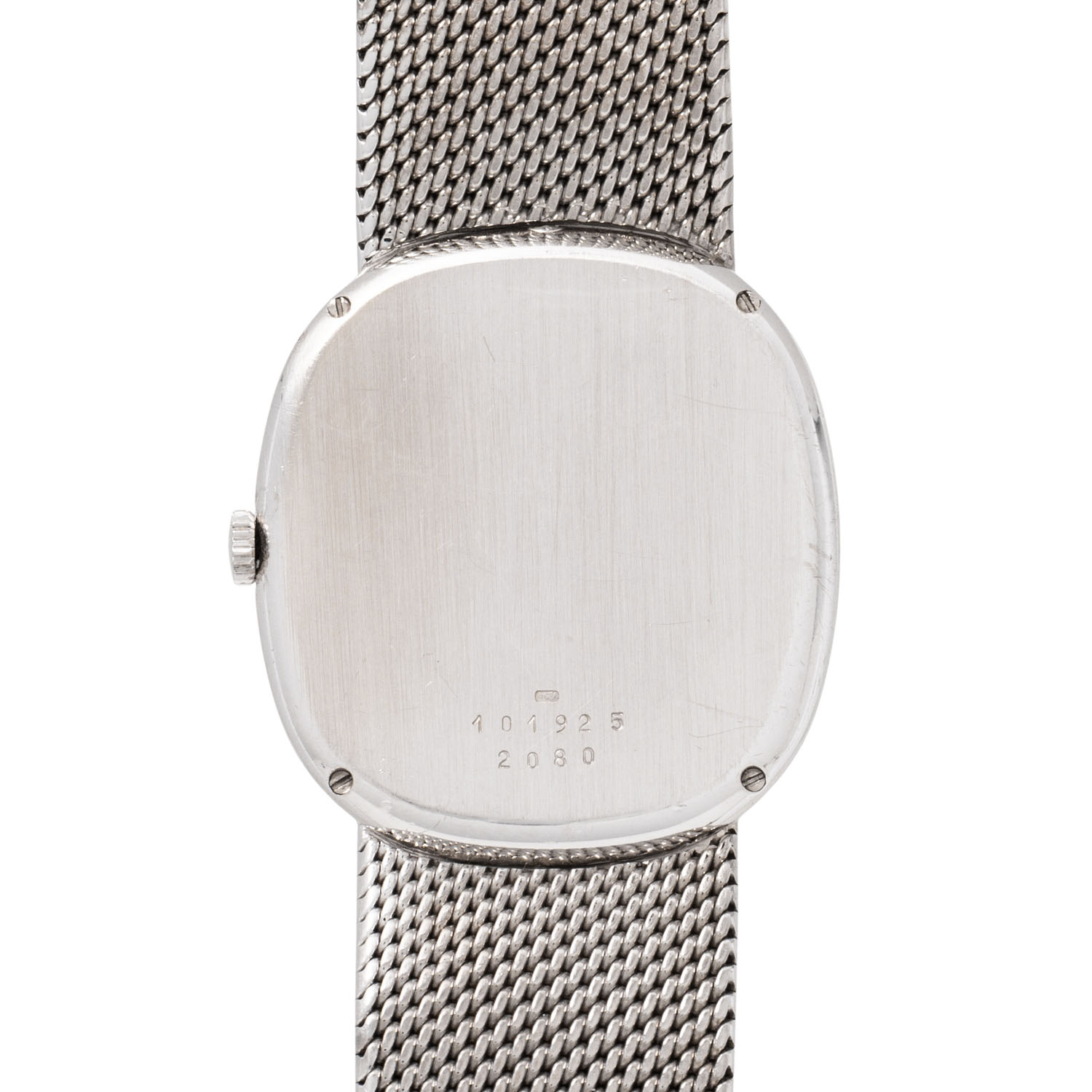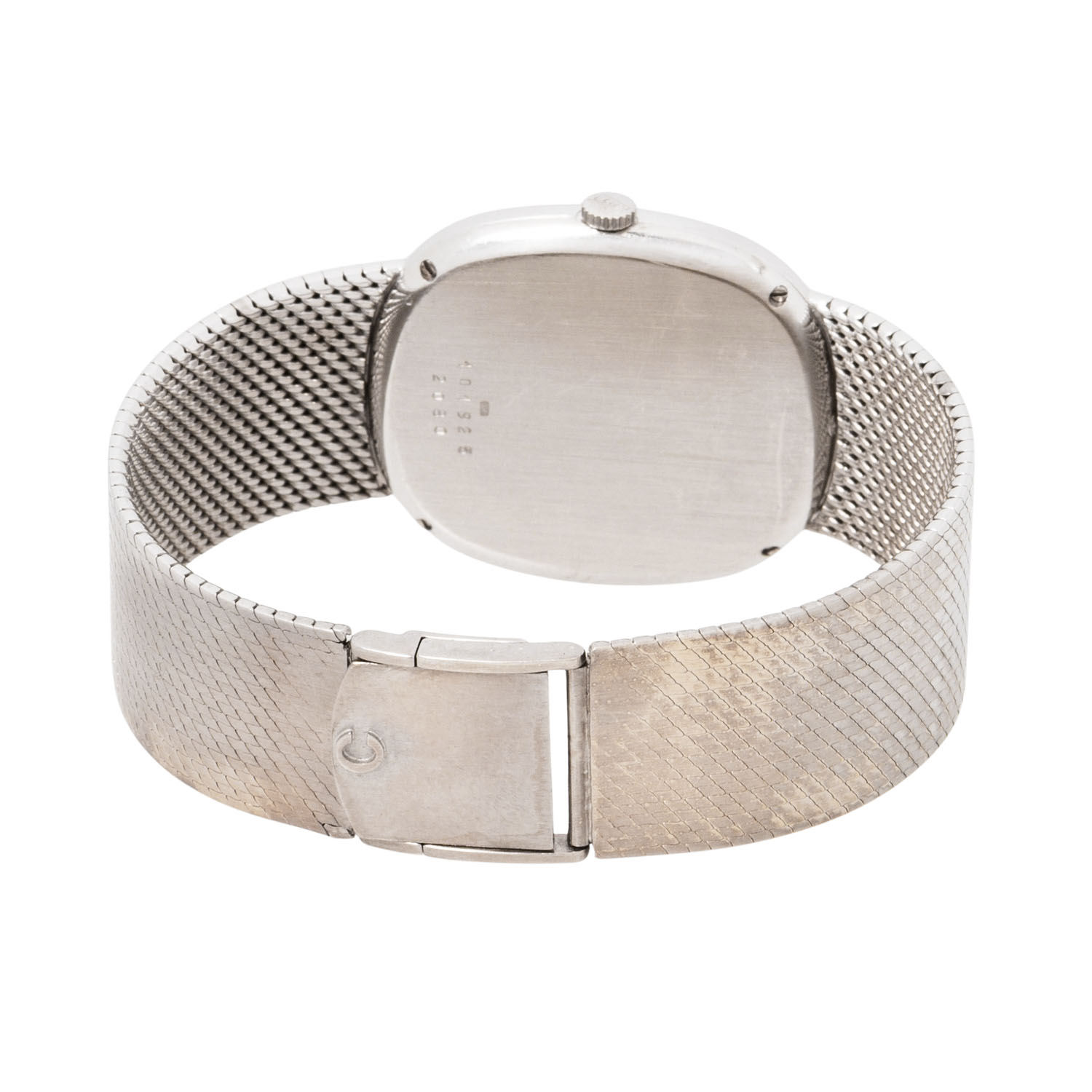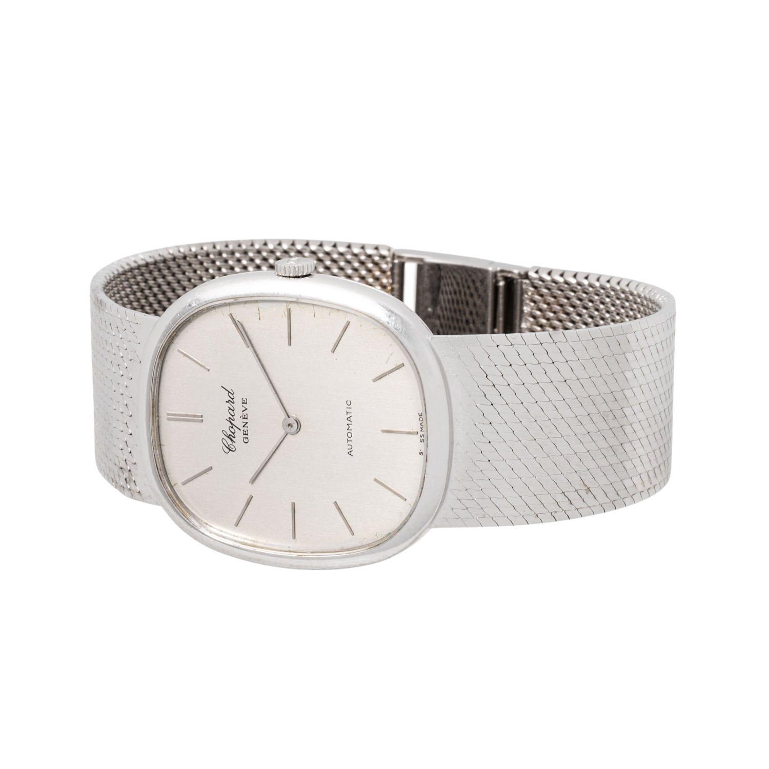 18K Weißgold. Automatik-Werk mit sehr guten Gangwerten (+4 s/d. 265° Amplitude). Graues Zifferblatt mt Stabindizes und feinen Haarrissen zwischen 2 und 5 Uhr. Chopard Milanaise Armband in 18K Weißgold. Guter Vintage Zustand mit sichtbaren Tragespuren am Gehäuse und Armband. Revisionsnachweis vom Mai 2025 anbei. Durchmesser ca. 30 mm (gemessen ohne Krone). Passend bis zu ca. 16,5 cm Handgelenkumfang.