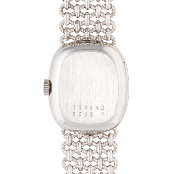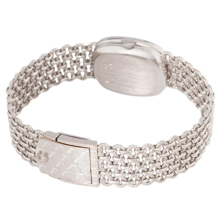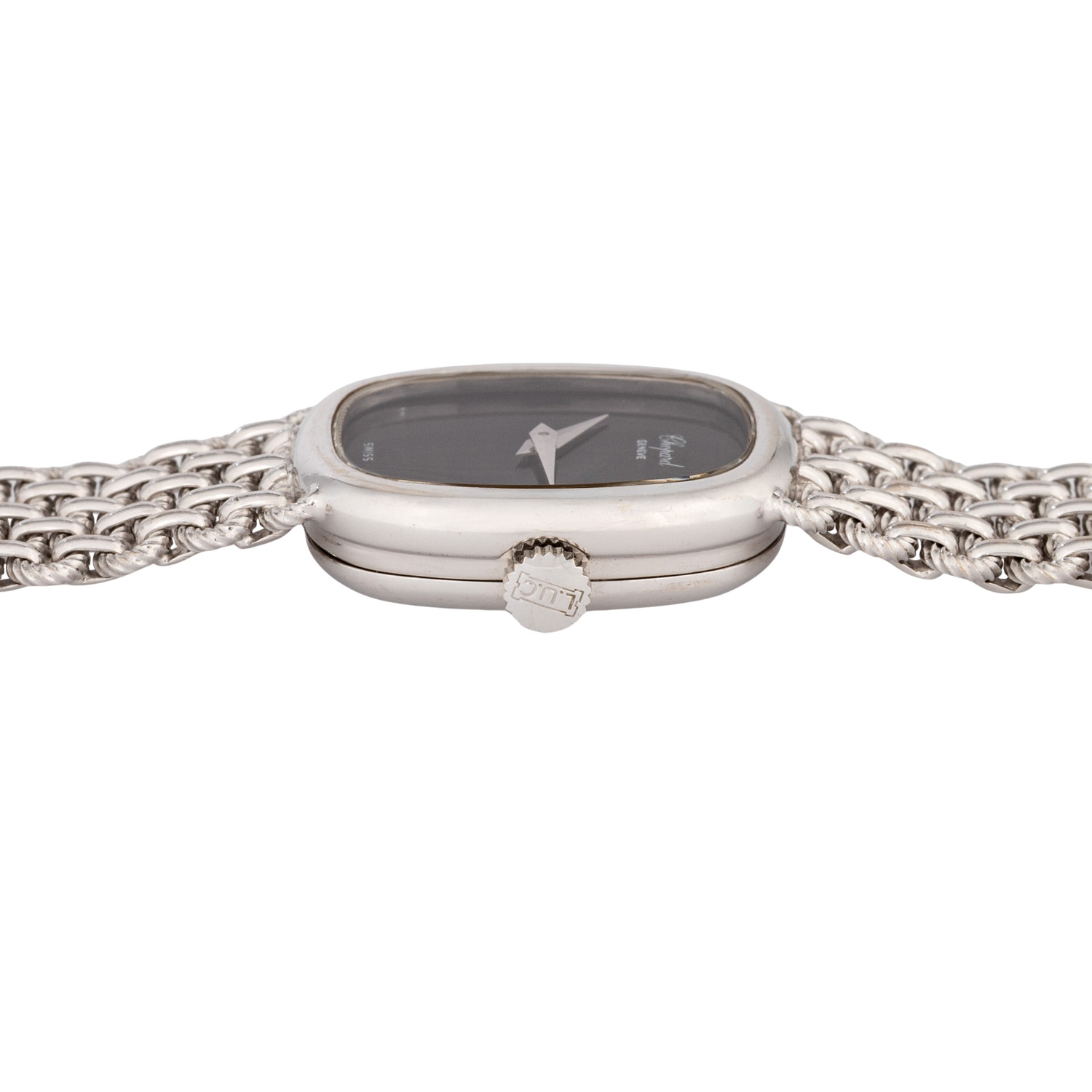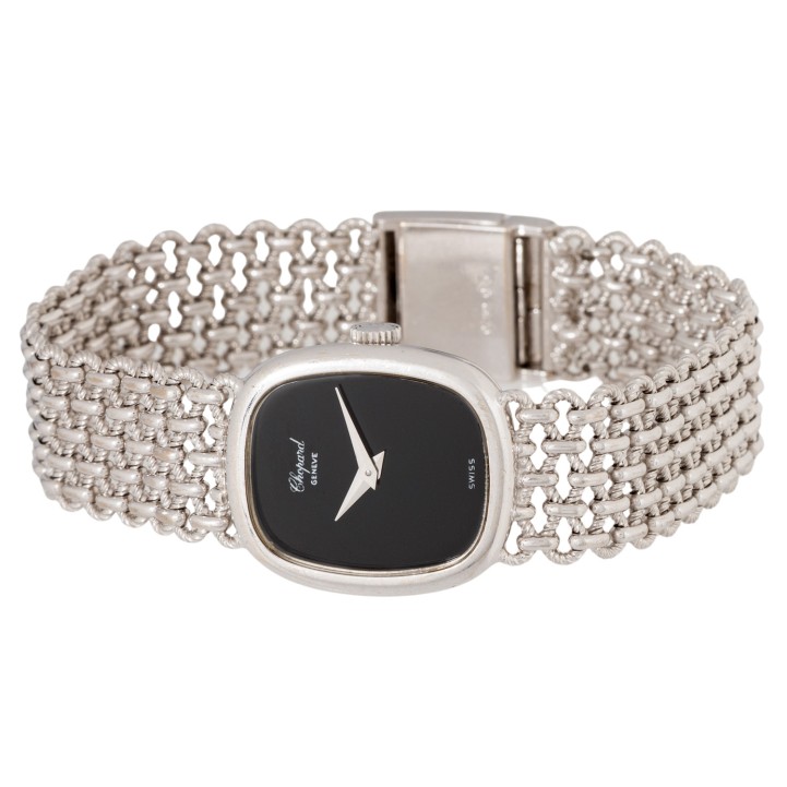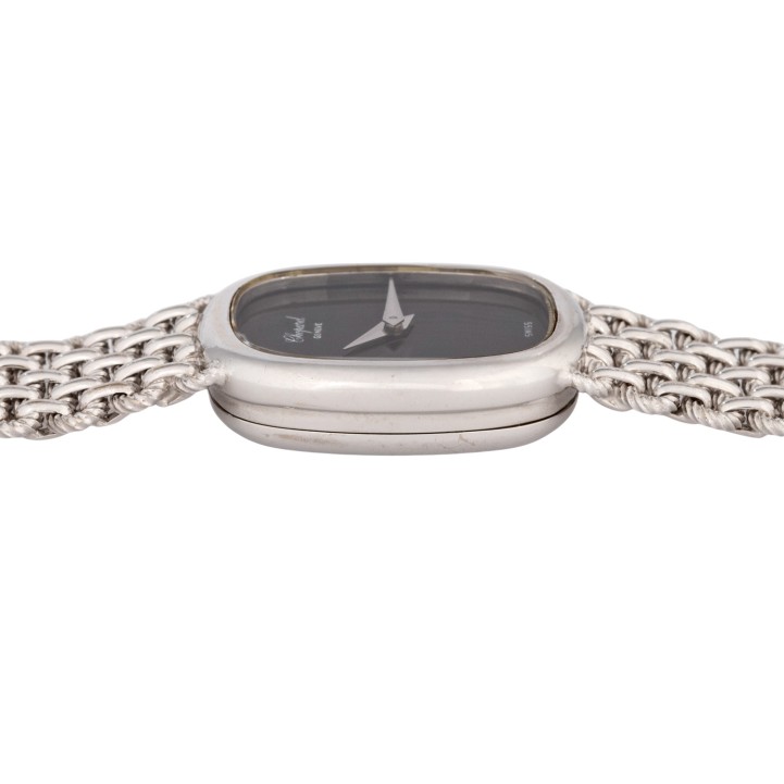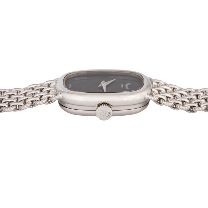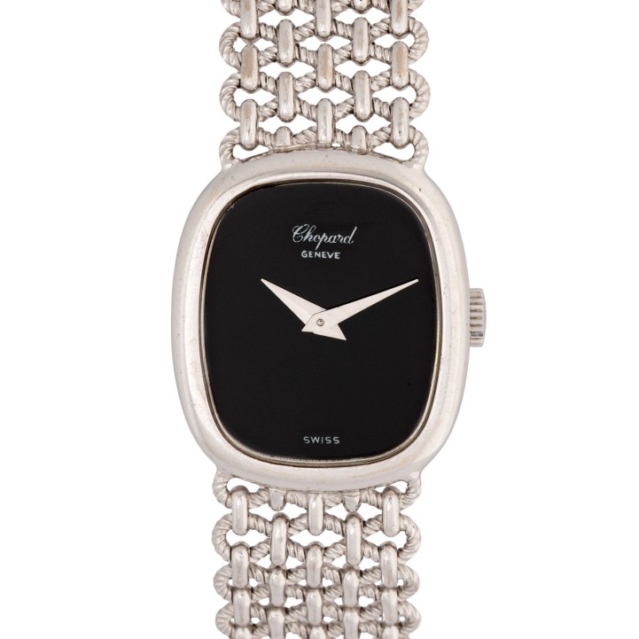 Weißgold 18K. Seriennummer 148342. Handaufzugswerk Kal. 846 mit guten Gangwerten (+7 s/d. 248° Amplitude). Schwarzes Onyx Zifferblatt mit Dauphine Zeigern. Integriertes Chopard Armband aus 18K Weißgold mit Faltschließe. Guter Zustand mit sichtbaren Tragespuren. Durchmesser ca. 20 mm (gemessen ohne Krone). Passend bis zu ca. 16 cm Handgelenkumfang.