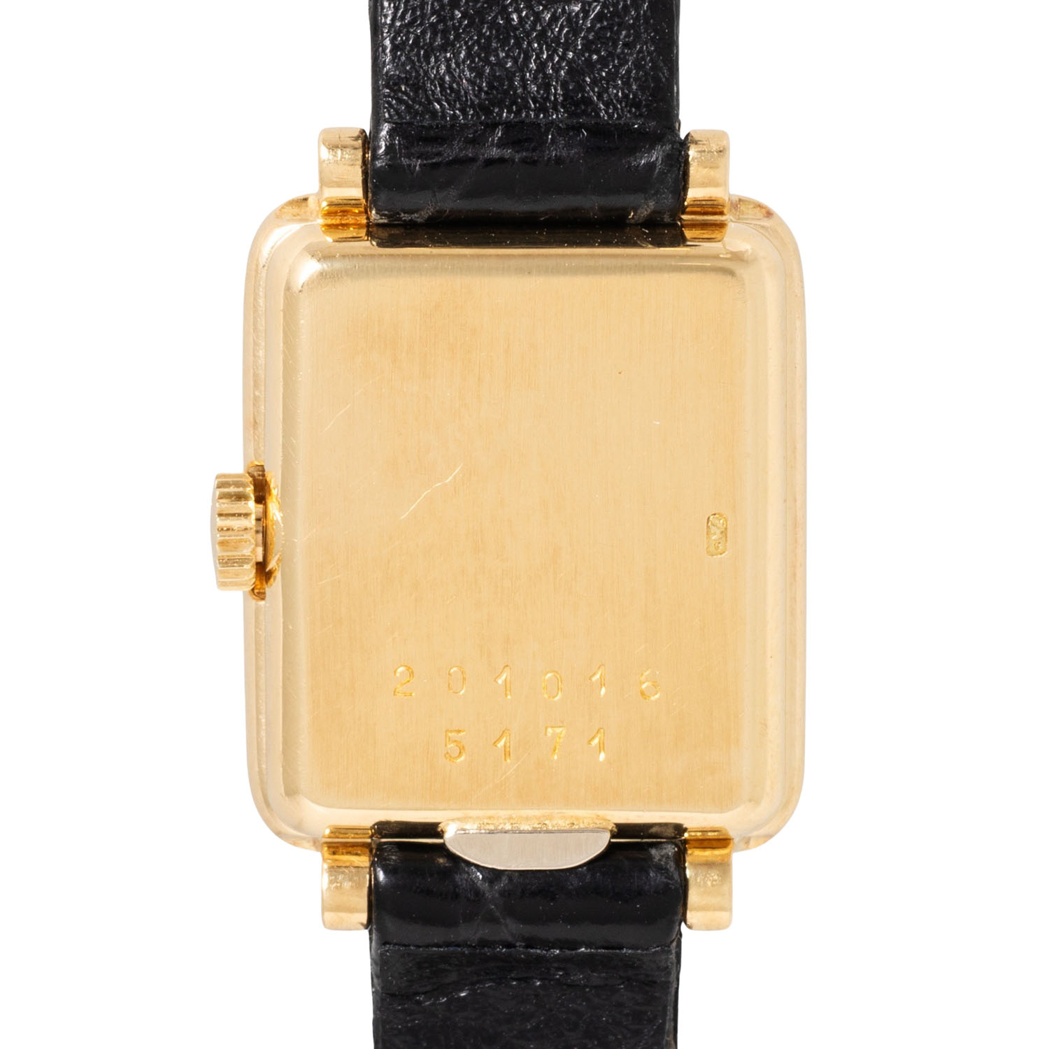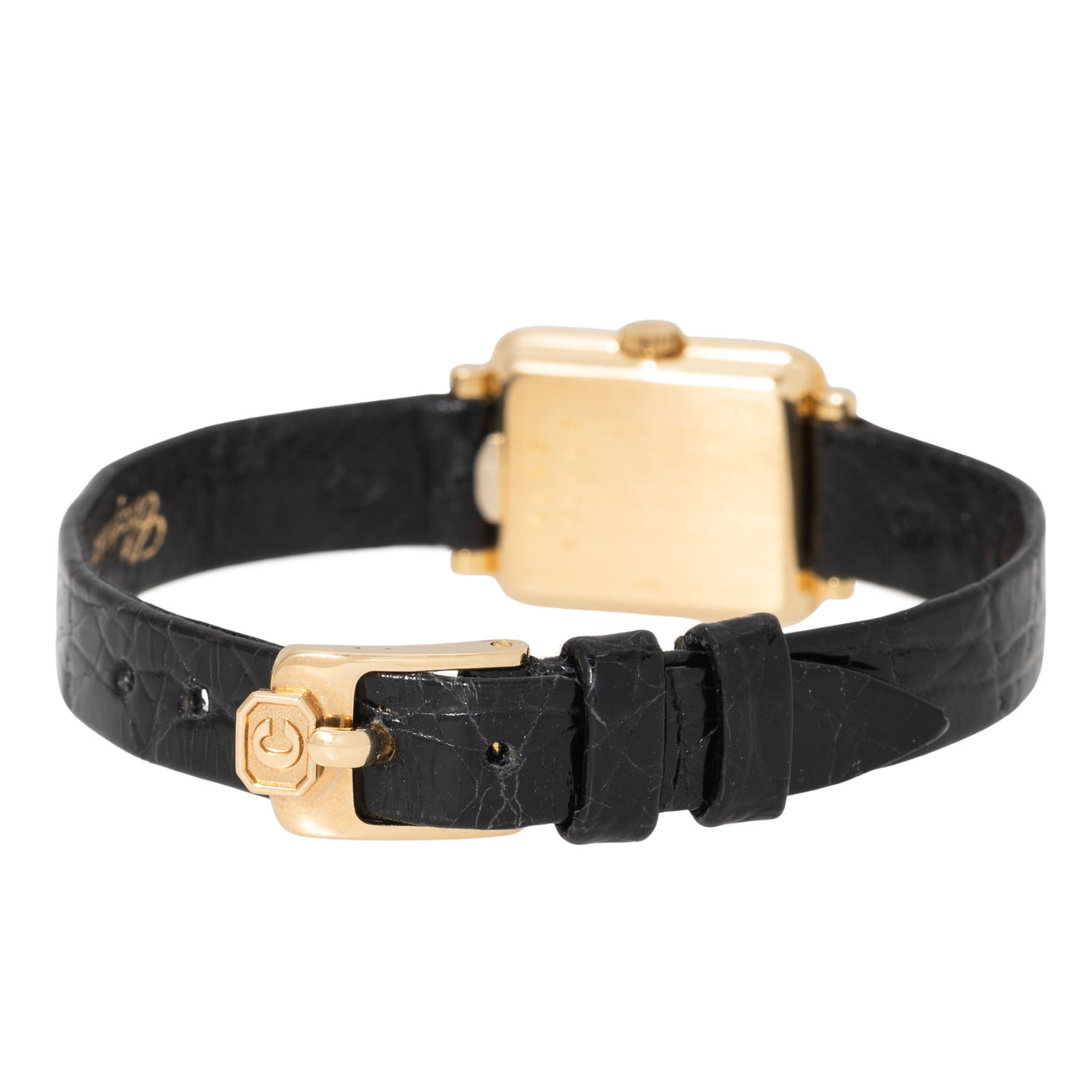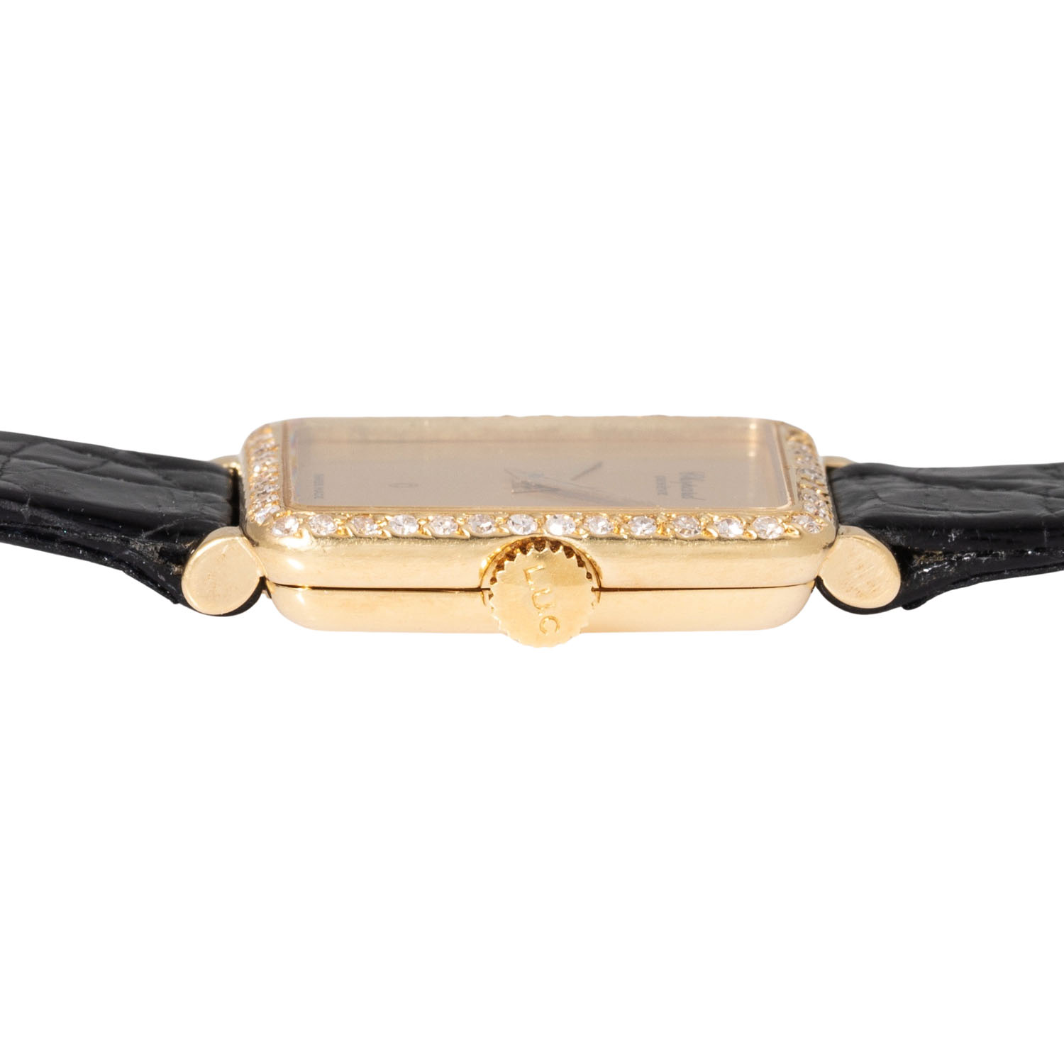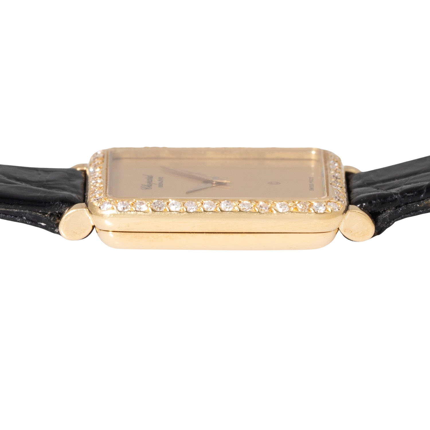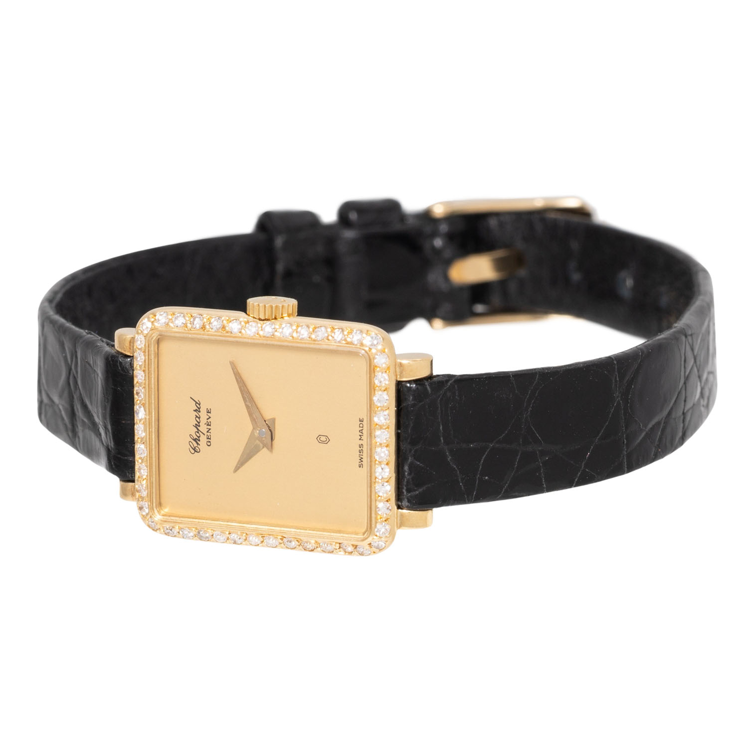 Gelbgold 18K. Quarzwerk Kal. E03001 in funktionsfähigem Zustand. Neue Batterie. Goldfarbenes Zifferblatt mit Daufin Zeiger. Lünette mit Diamantenbesatz. Krone signiert mit L.U.C. Chopard Lederband mit Dornschließe in Gelbgold 18K. Lünette mit Diamantenbesatz. Sehr guter Zustand mit leichten Tragespuren. Durchmesser ca. 16,5 mm (gemessen ohne Krone).