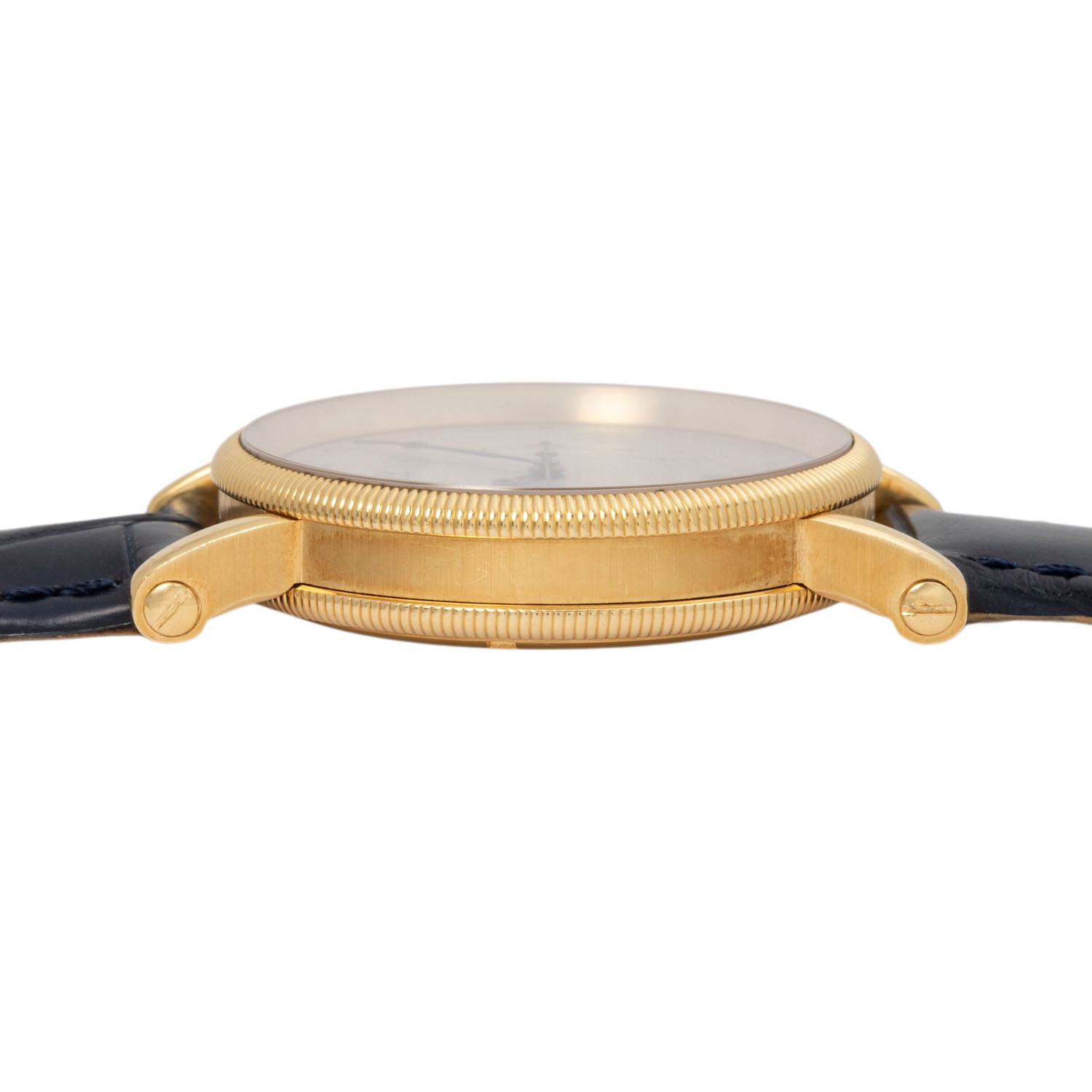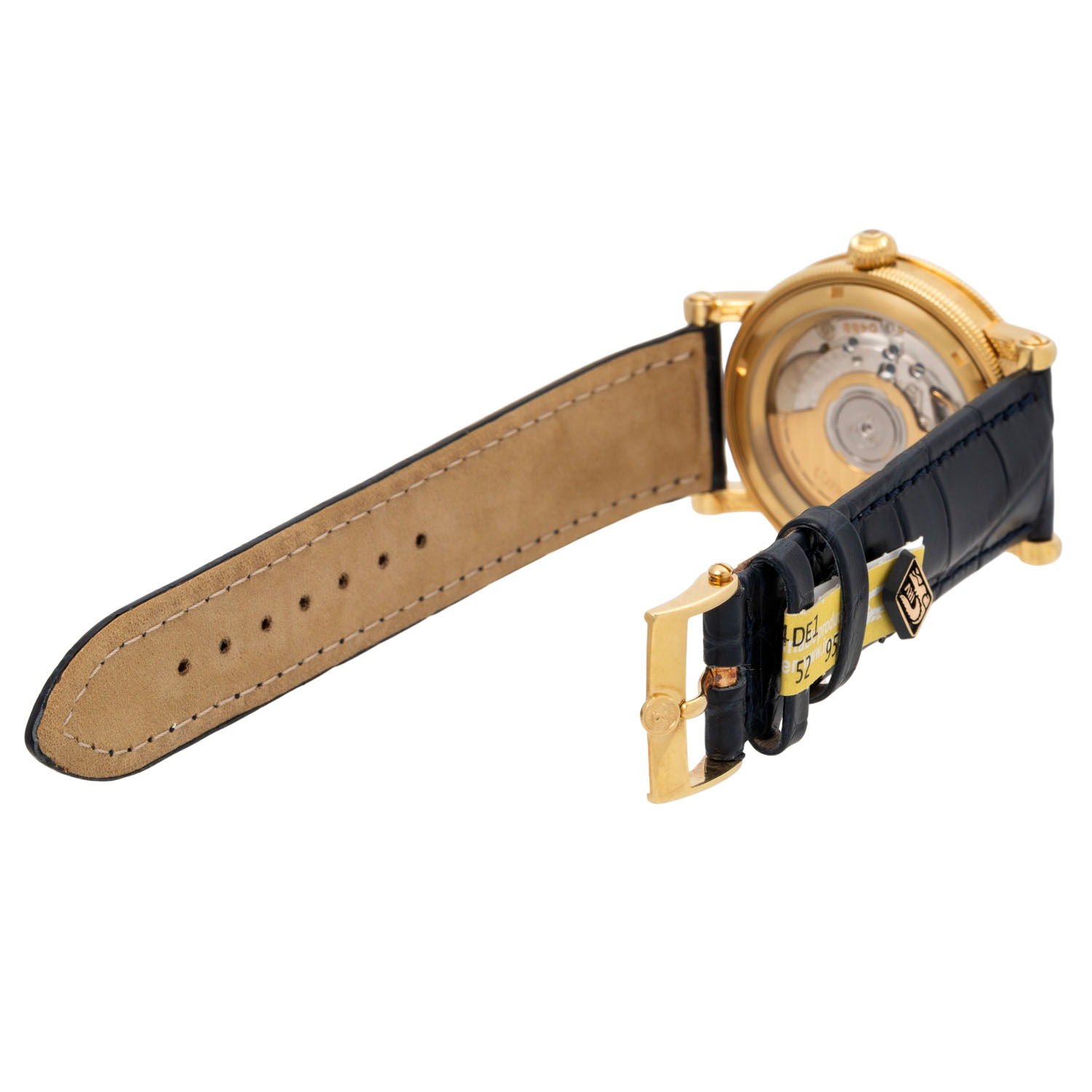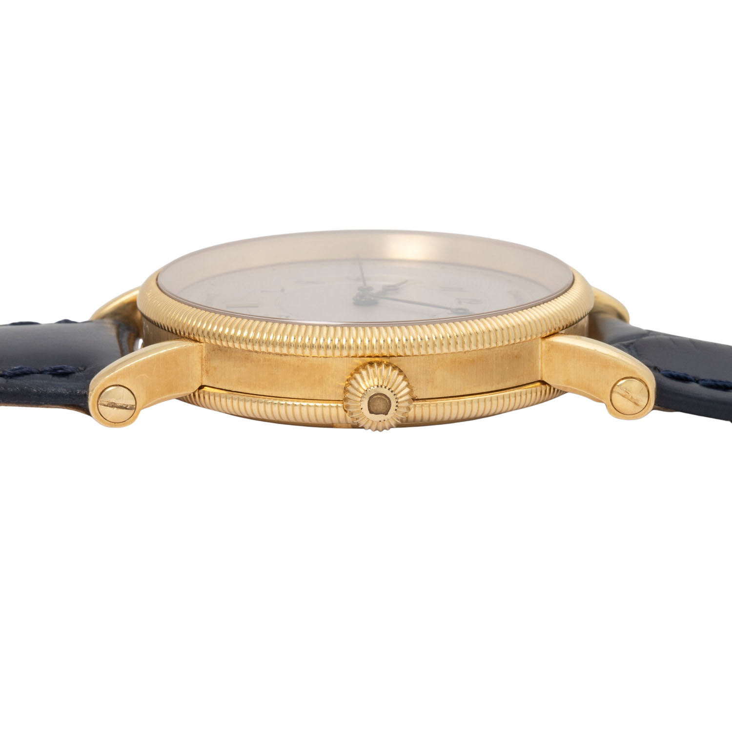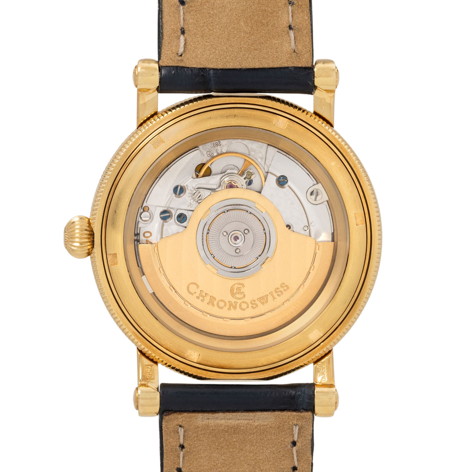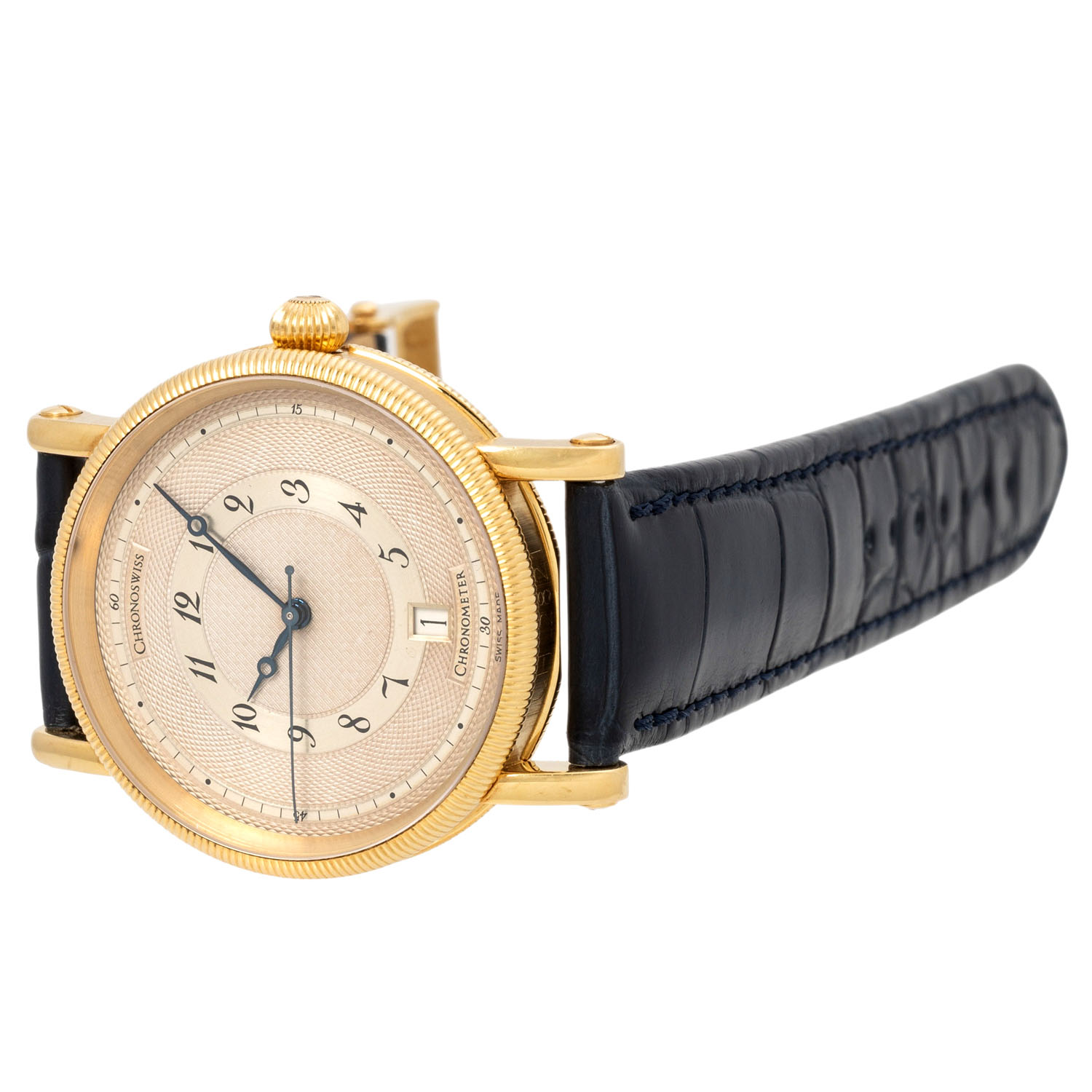 18K Gelbgold, Gehäusenummer 10190. Automatikwerk ETA Kal. 2892-2 mit guten Gangwerten (+3 s/d, 249° Amplitude). Bronzefarbenes Guilloche-Zifferblatt mit arabischen Ziffern, gebläuten Bregeut-Zeigern und Datumsanzeige. Neues, navyfarbenes Alligator-Lederarmband mit Chronoswiss 18K Gelbgold Dornschließe. Guter Zustand, leichte Tragespuren. Durchmesser ca. 38 mm gemessen ohne Krone.