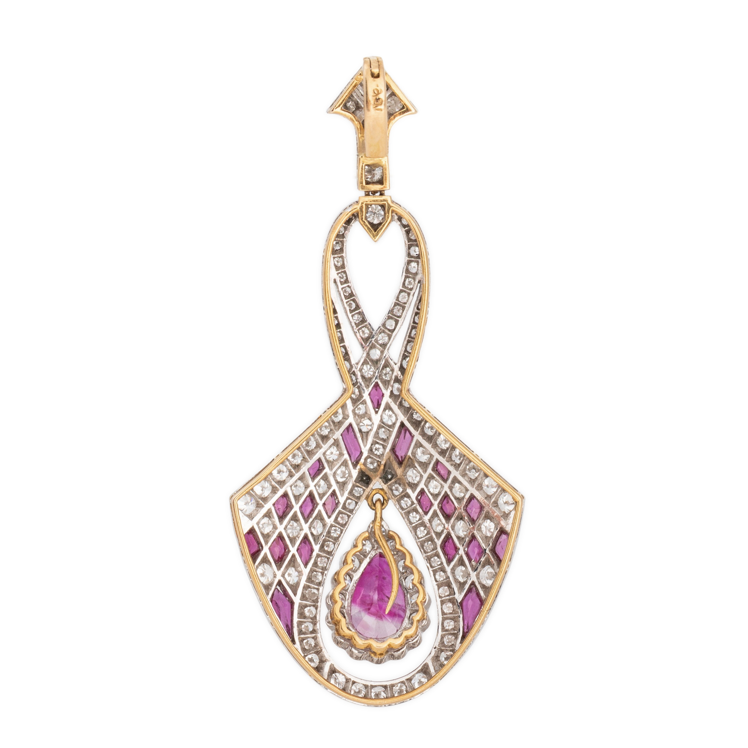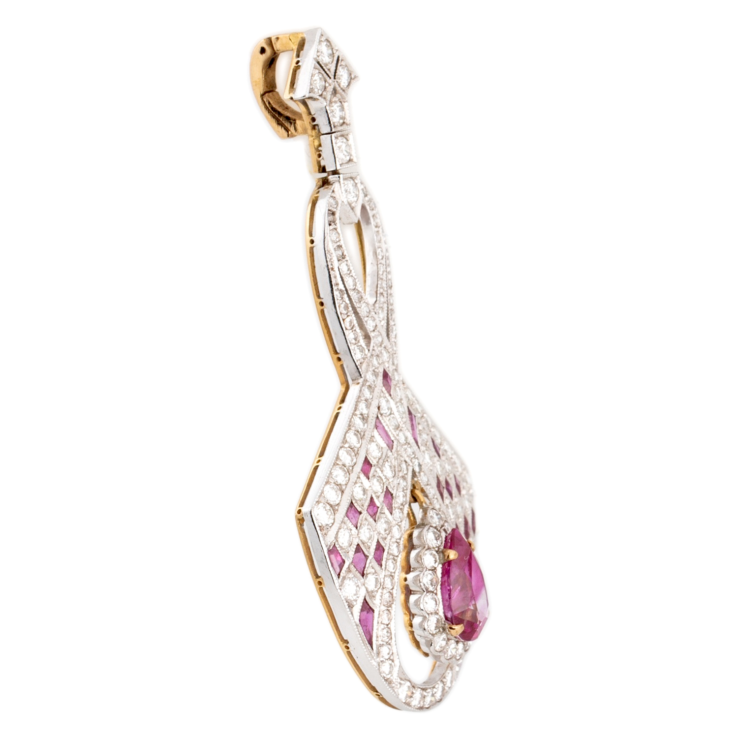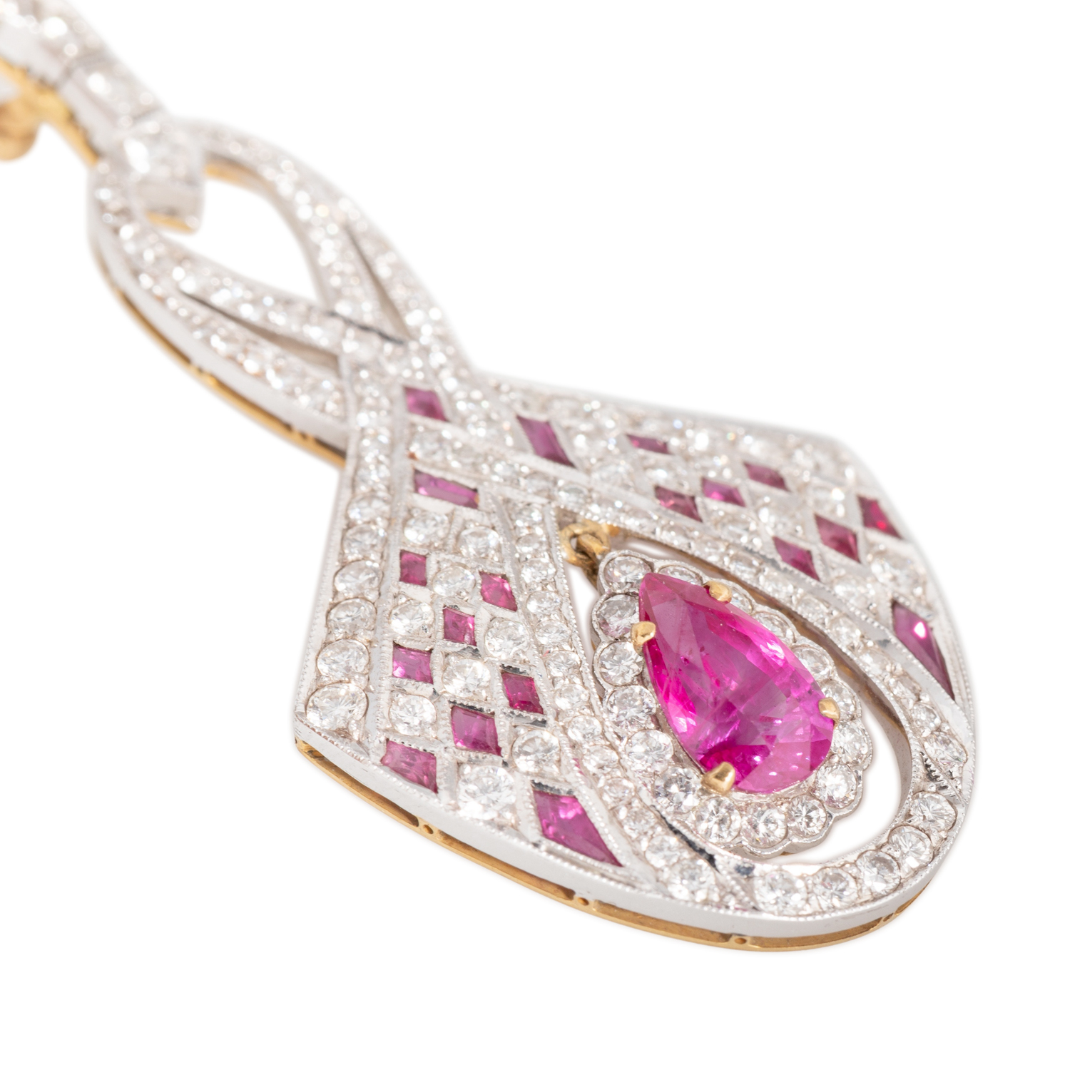 gute Farbe und Reinheit und pinkfarbene Saphire, eingeschliffen und als Tropfen, Unterbau GG 18K, Oberseite WG 14K, 5,6 g, 5x2,2 cm, 20. Jh., guter Erhalt. (5)