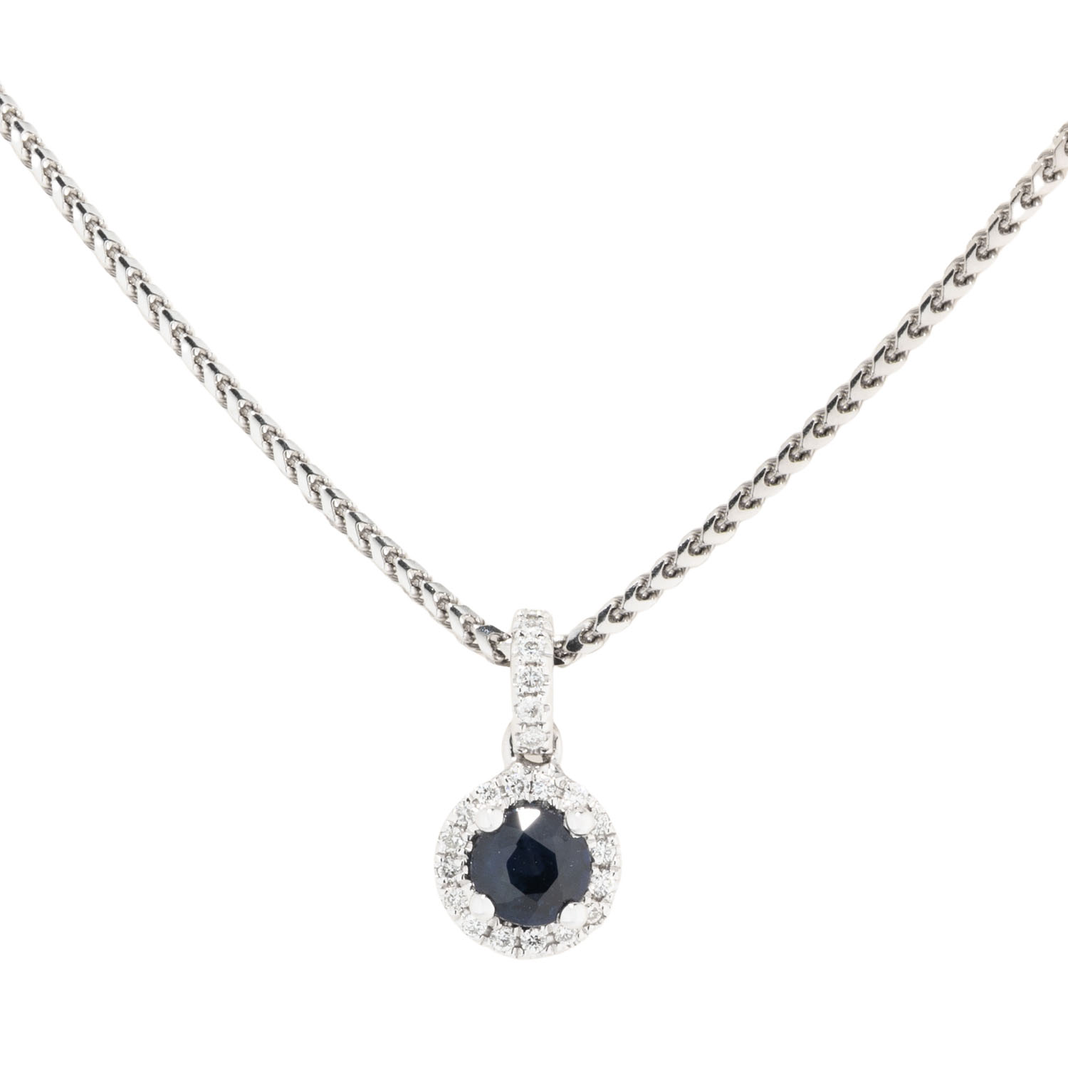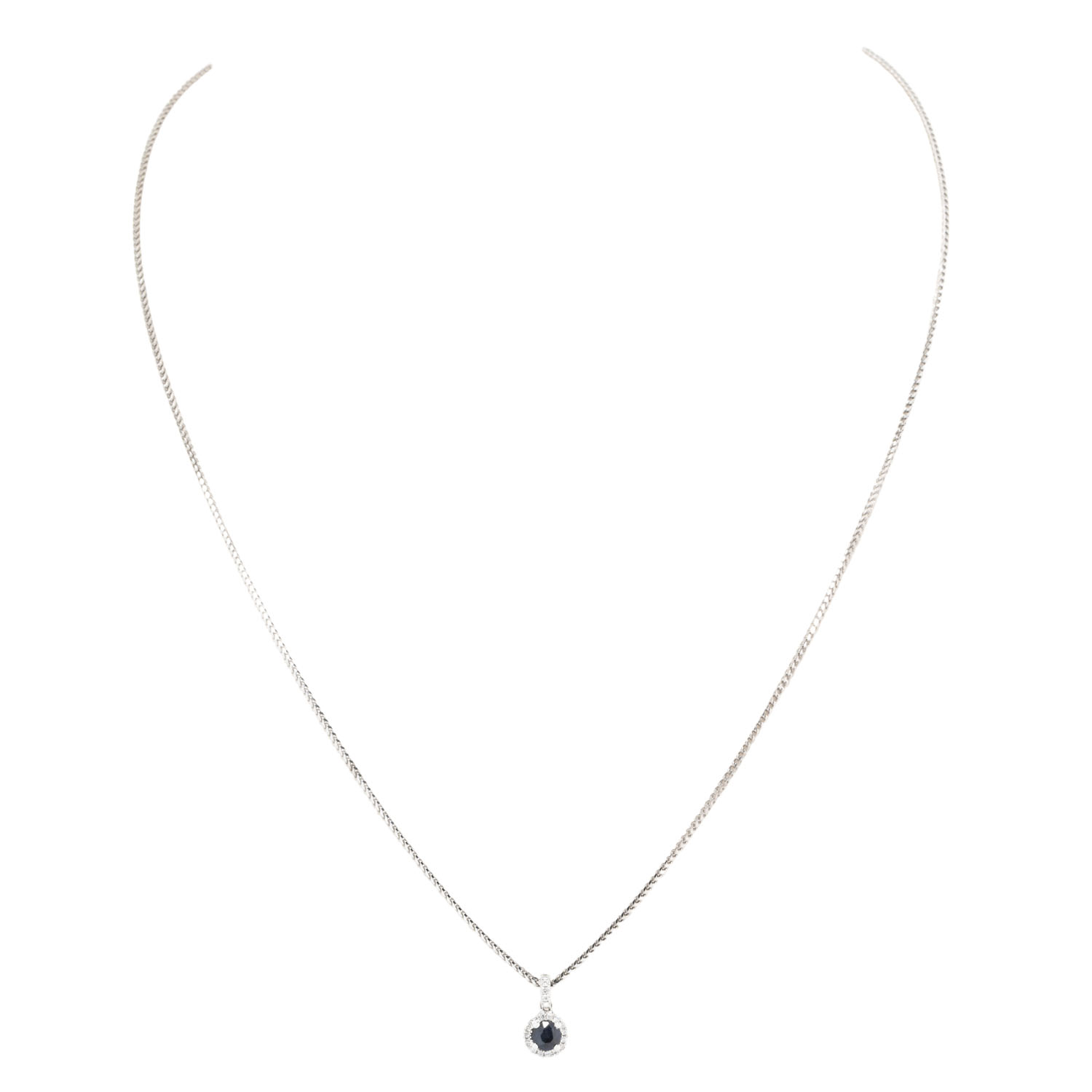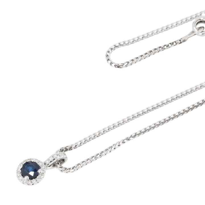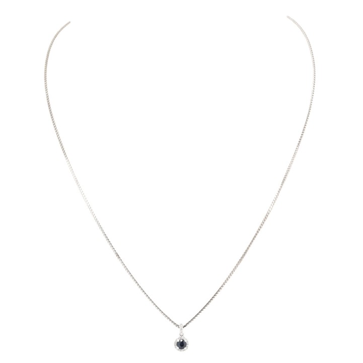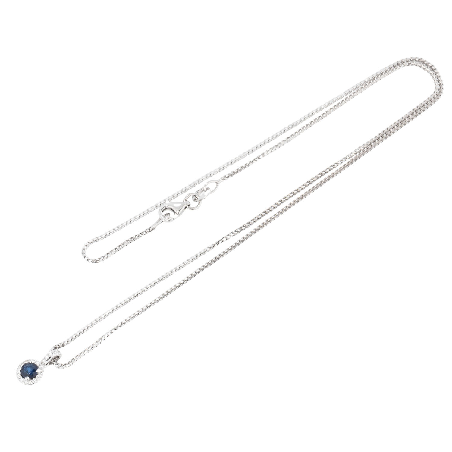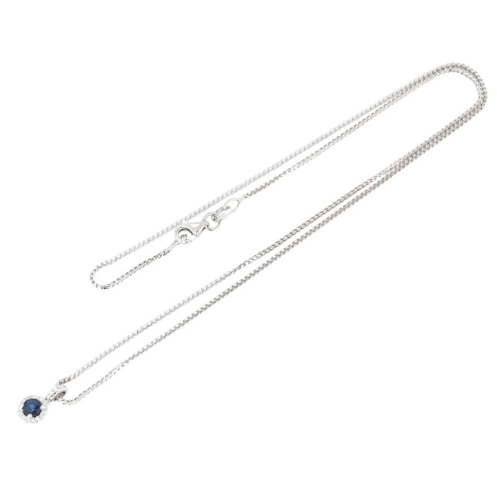 rund facettiert, 4 mm, besetzt mit 16 Brillanten, ges. ca. 0,07 ct, GG 14K rhodiniert, 3,8 g, L x B (Anhänger): 12 x 6 mm, L: 45 cm, B: 1 mm, Karabinerhaken, 21. Jh., minimale Tragespuren.
