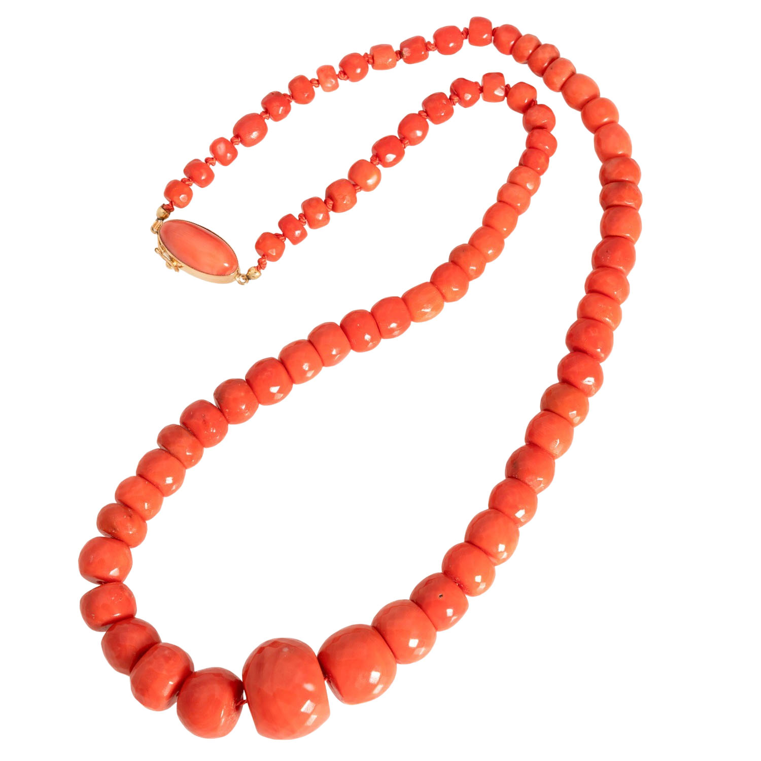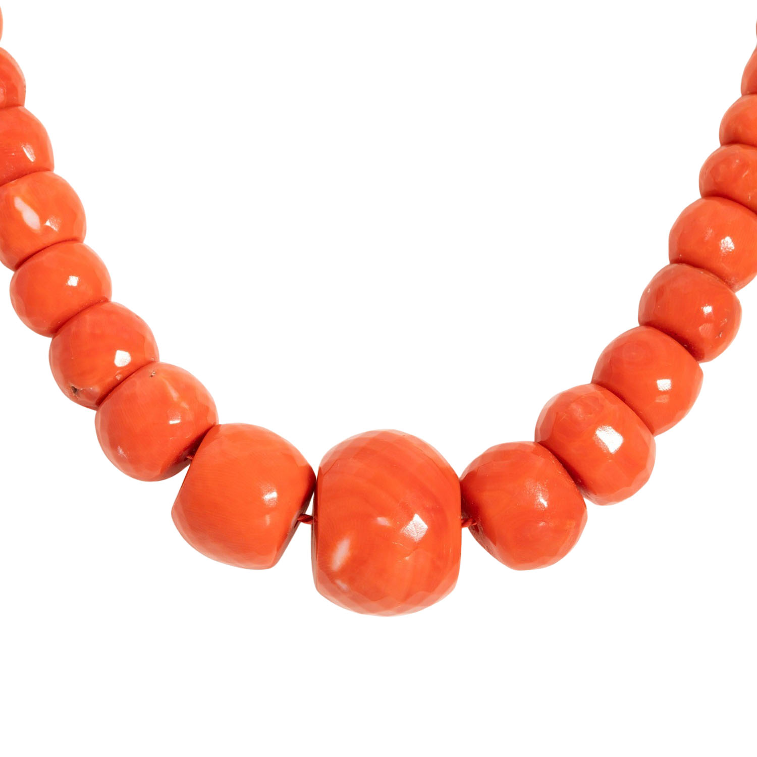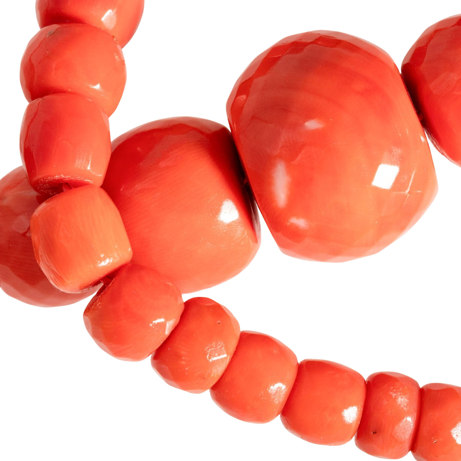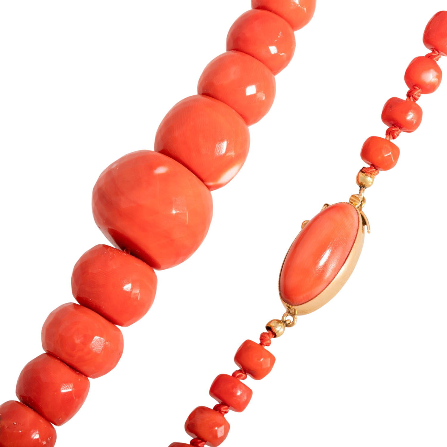 D.: ca. 6 - 20 mm, Schließe besetzt mit ovalem Korallencabochon, GG 18K, Gesamtgewicht: 90,4 g, L.: ca. 59 cm, 20./21. Jh., Edelkoralle in gutem Erhaltungszustand.