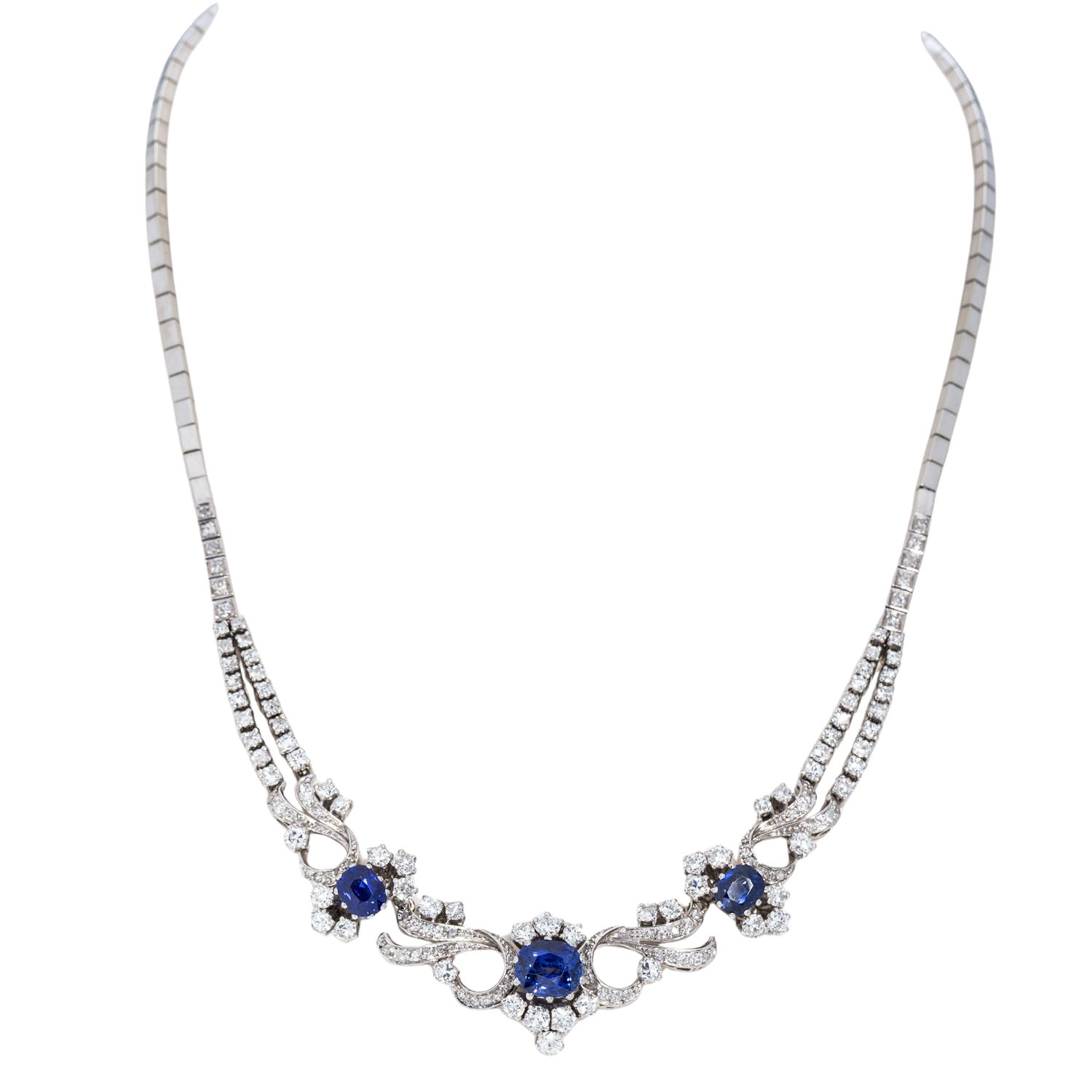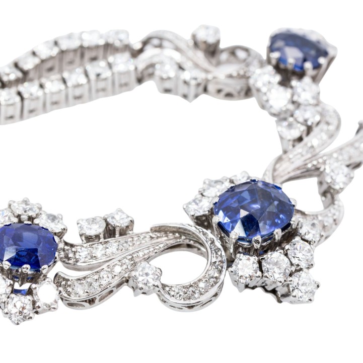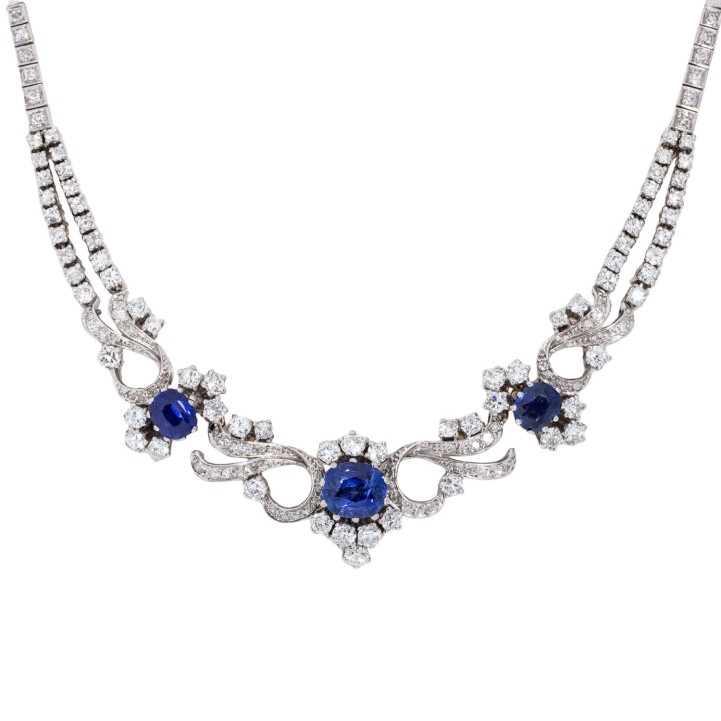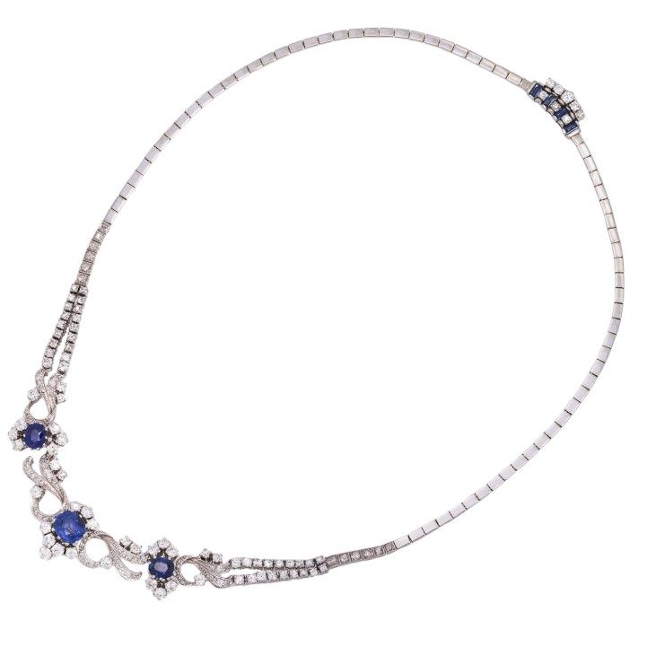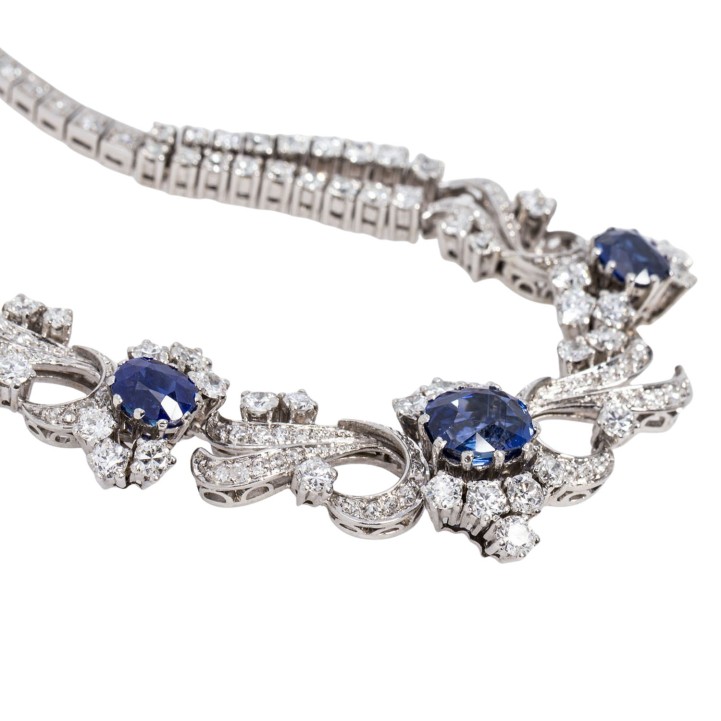 von phantastischer Farbe ohne Hinweise auf Hitzebehandlung, zentraler Stein ca. 2,5 ct, Diamanten zus. ca. 3,4 ct, mittlere bis sehr gute Reinheit, gute Farbe, 18K WG, Schauseite Platin, 44 g, Länge ca. 43 cm, Mitte 20. Jh., leichte Tragespuren, Saphire i. d. Schließe synthetisch, Saphire Facettkanten etwas berieben.