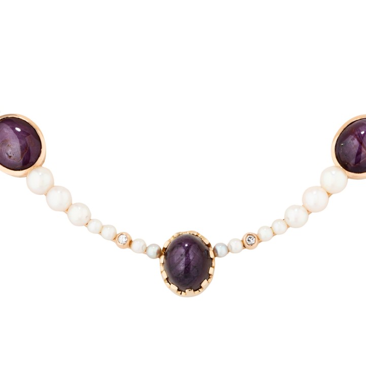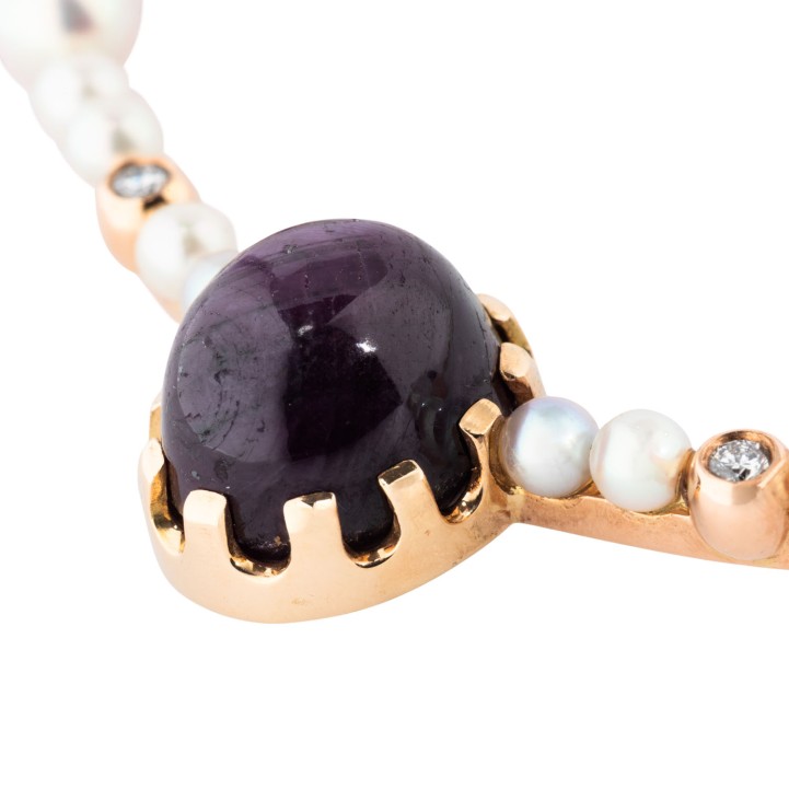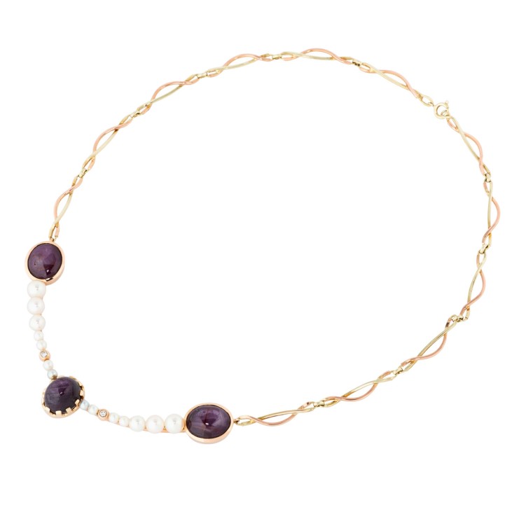 Collier mit 3 Saphircabochons, 2 Rubincabochons,