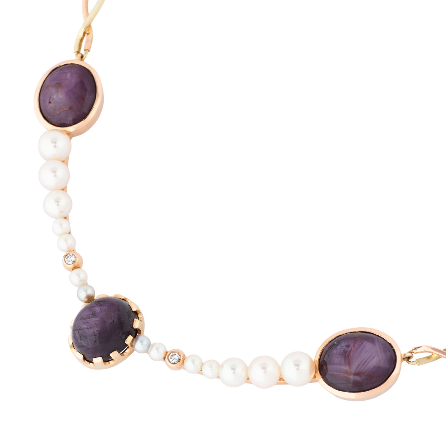 changierend, ca. 13 x 11 mm, 2 Brillanten, ges. ca. 0,14 ct, gute Farbe und Reinheit, 14 Akoya-Perlen, verschiedene Farben, D: 6,6 - 3,6 mm, sehr guter Lüster, GG/RG 14K, 28,5 g, L: 46 cm, Ende 20. Jh. minimale Tragespuren, Handarbeit.