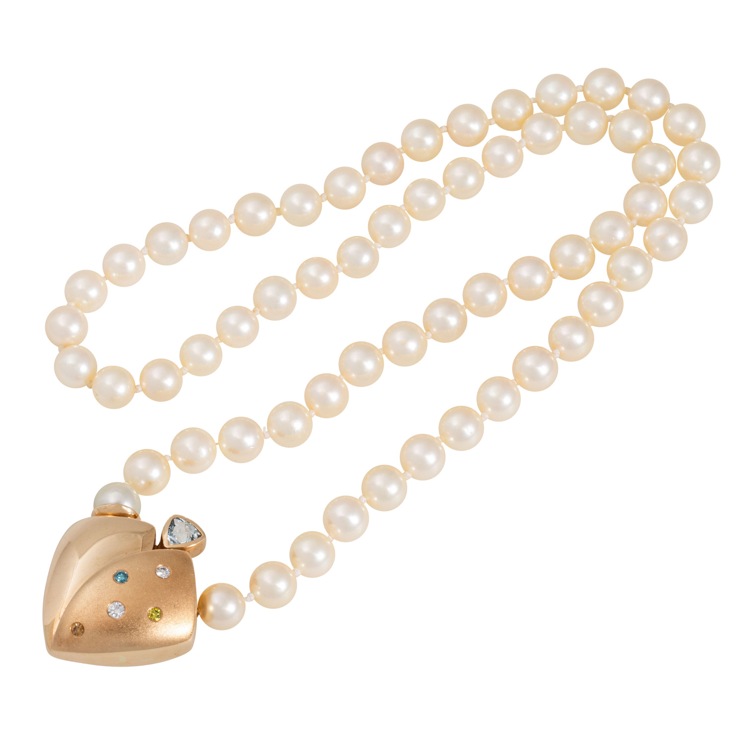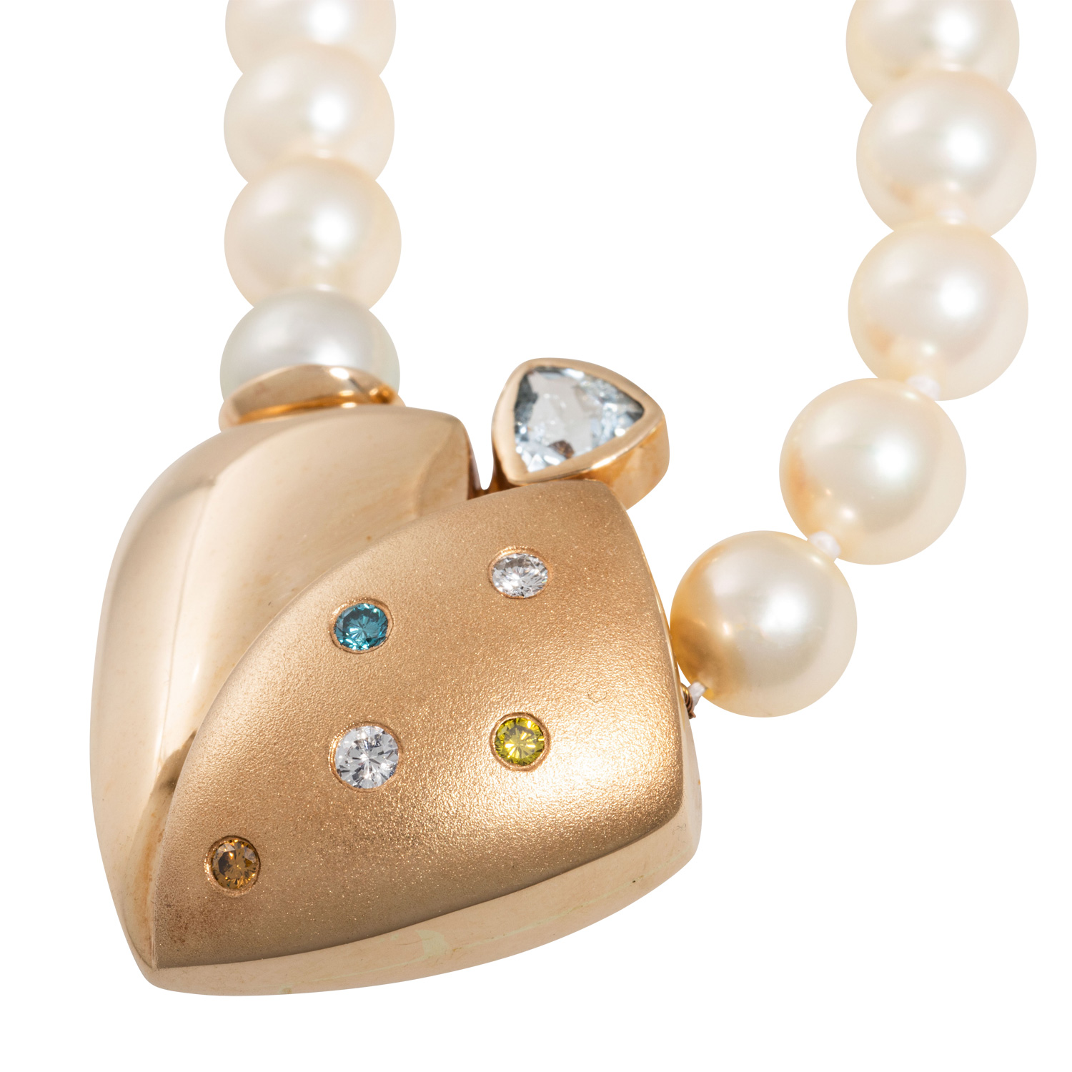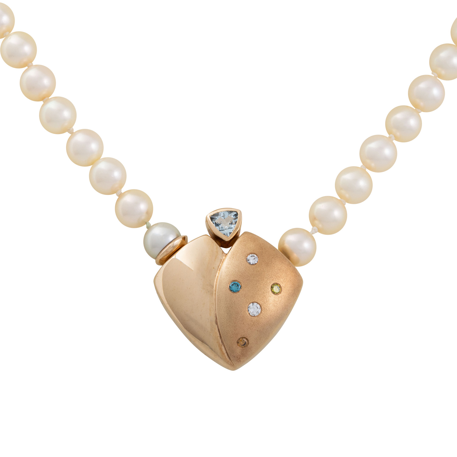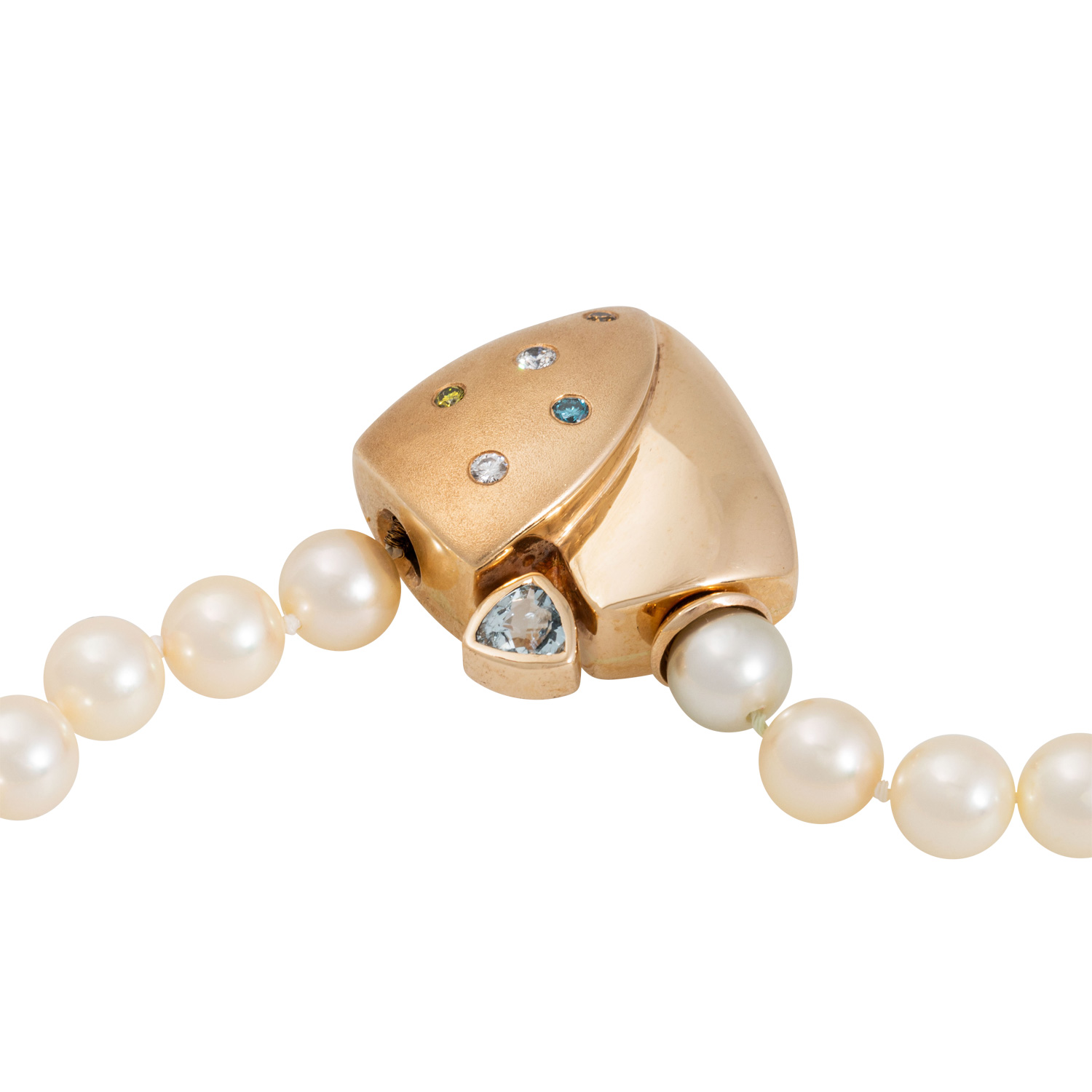 cremefarben, D: 6,5 - 6,8 mm, guter Lüster, Schloß mit Aquamarin, dreieckig, 5 farbige Diamanten, ges. ca. 0,22 ct, GG 14K, 39,8 g, L: 47 cm, 20./21. Jh., minimale Tragespuren, Handarbeit.
