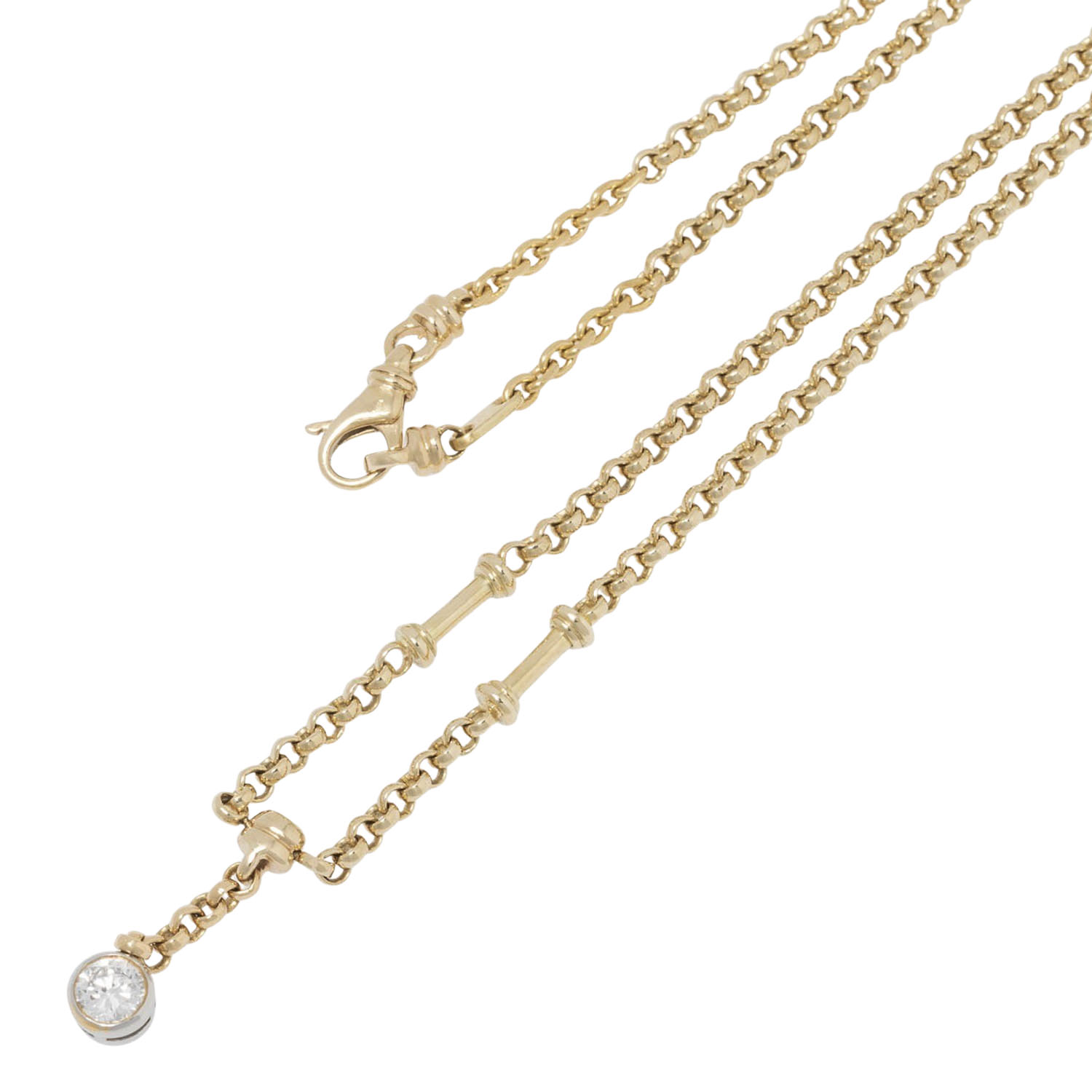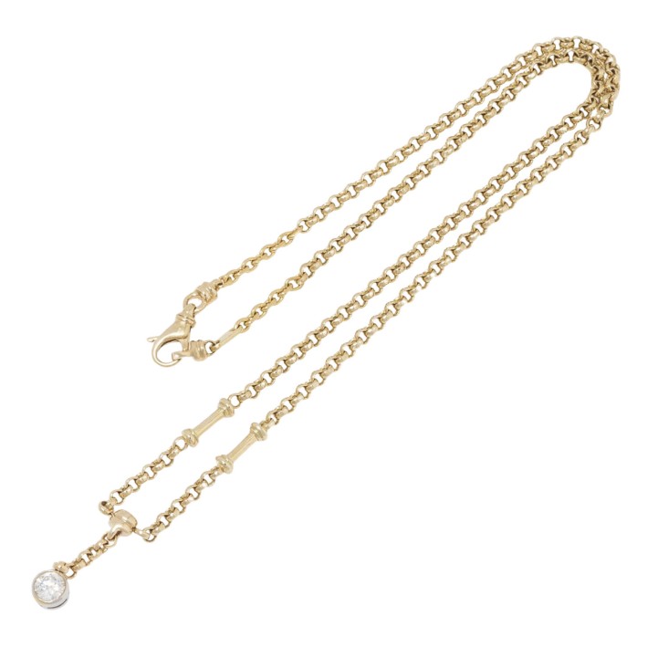 ca. 0,50 ct, FW (F-G)/SI, GG/WG 14K, 18,4 g, Erbskette L: ca. 46 cm, B: ca. 3 mm, Anhänger L: ca. 26 mm, 21. Jh., minimale Tragespuren, mit Herstellerpunze 'DB', nachträglich ca. 2,5 cm mit Ankerkette verlängert.
