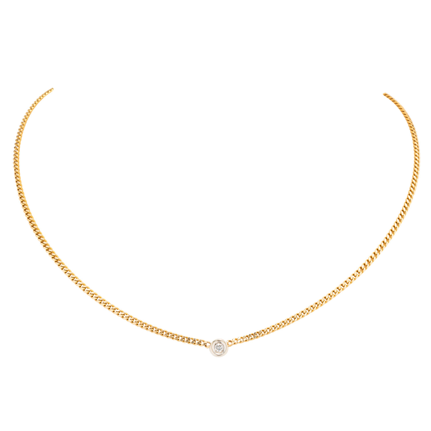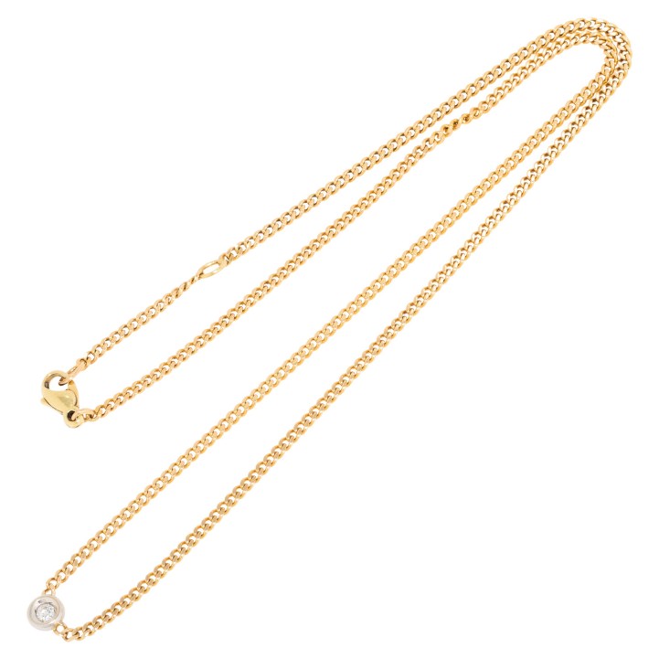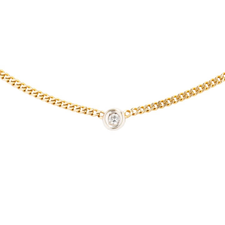 ca. 0,07 ct, WEISS (H)/VS, GG/WG 14K, 6,6 g, Panzerkette geschliffen, L: 44 cm mit Zwischenöse bei 4 cm, B x H: 2 x 1 mm, Karabinerhaken, Ende 20. Jh., minimale Tragespuren.