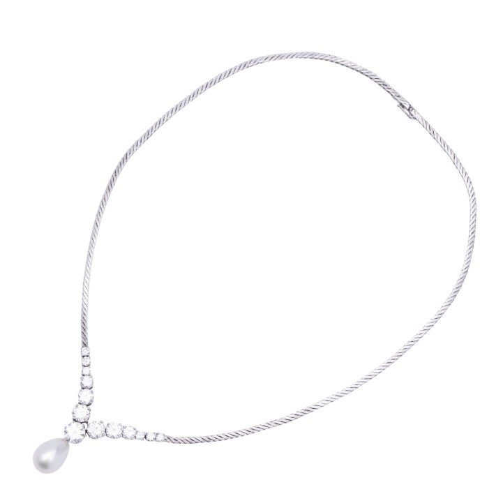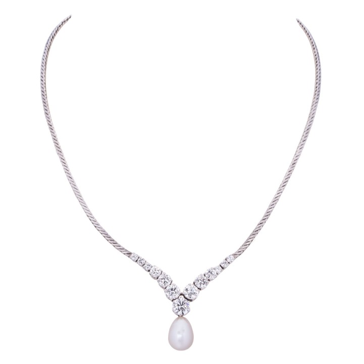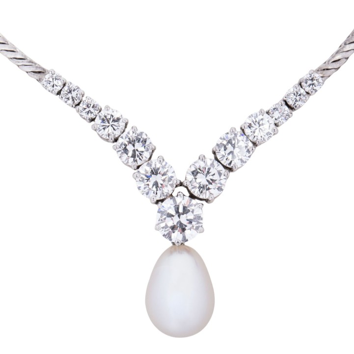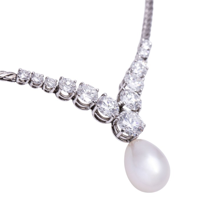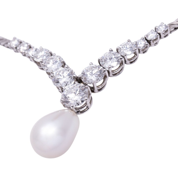davon größter Stein ca. 1,1 ct, alle Steine ca. FW-WEISS (G-H)/VVS-VS, tropfenförmige Zuchtperle ca. 10 mm, 18K WG, 21,2 g, Länge ca. 42 cm, 2. Hälfte 20. Jh., leichte Tragespuren, Herstellermarke Louis Fiessler Pforzheim, inkl. Kopie v. Wertgutachten (1990er Jahre).