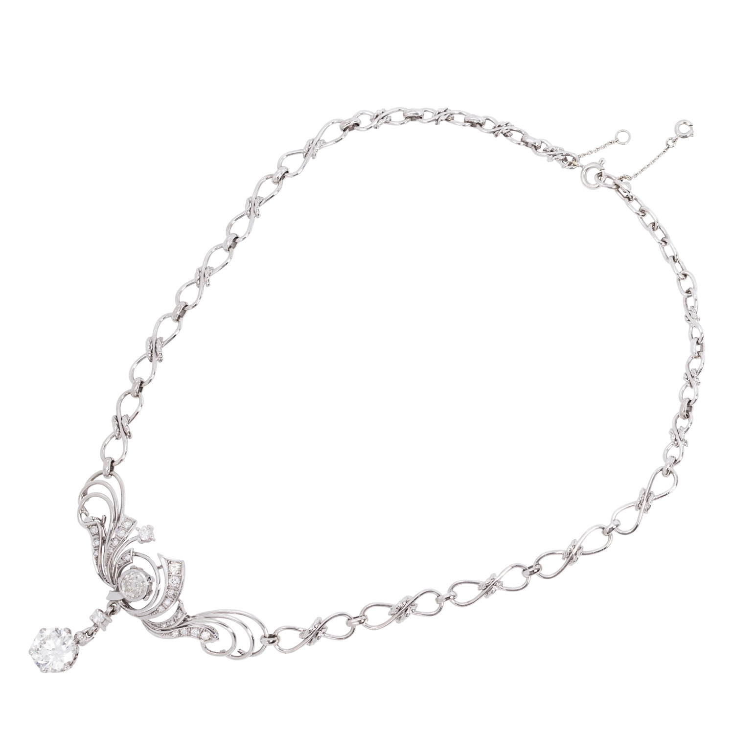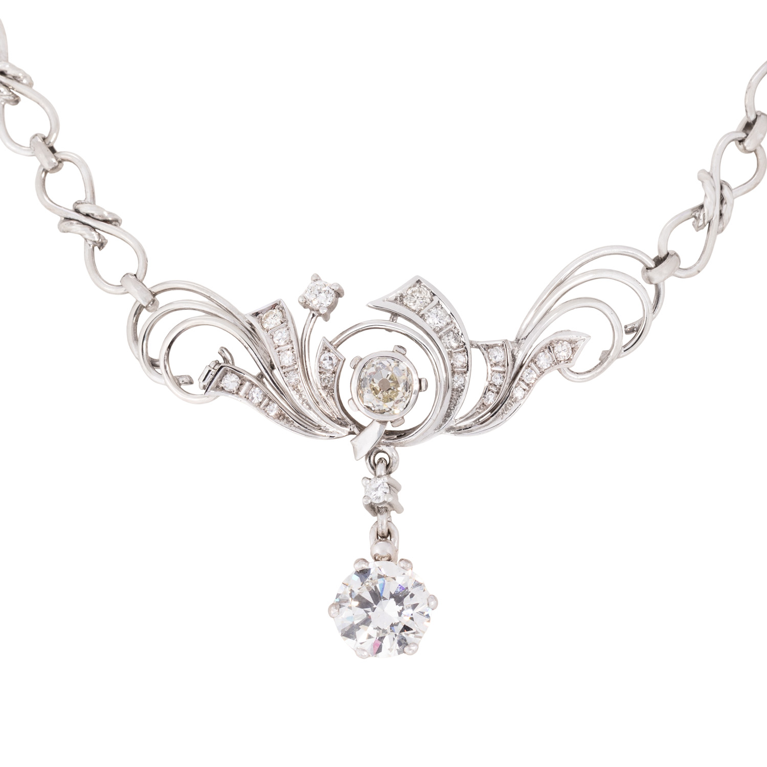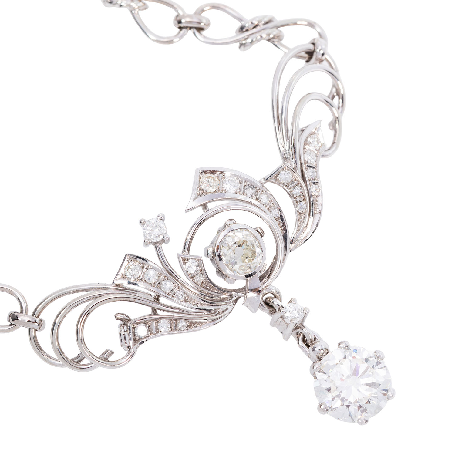 WBW (2023): ca. 45.800 €, davon abhängender Stein im Übergangsschliff, ca. 3,3 ct, ca. GW (L)/SI, zentraler Altschliffdiamant ca. 0,75 ct, ca. TOP LIGHT BROWN/VS und weitere kleine Diamanten im Übergangs- und Achtkantschliff zus. ca. 0,64 ct, ca. GW (K-L)/SI-P1, WG 14K, 23 g, L: 38 cm, mit Sicherheitskettchen, Lemniskatenkette vom Diamantmittelteil abnehmbar, Mitte 20. Jh., guter Erhalt, solide Handarbeit, mit Wertgutachten. (13)