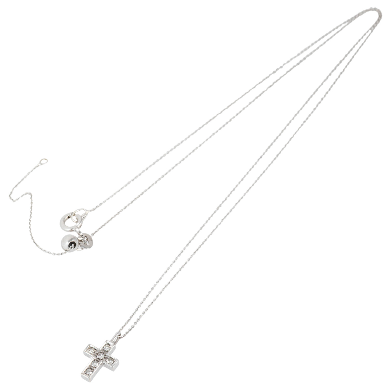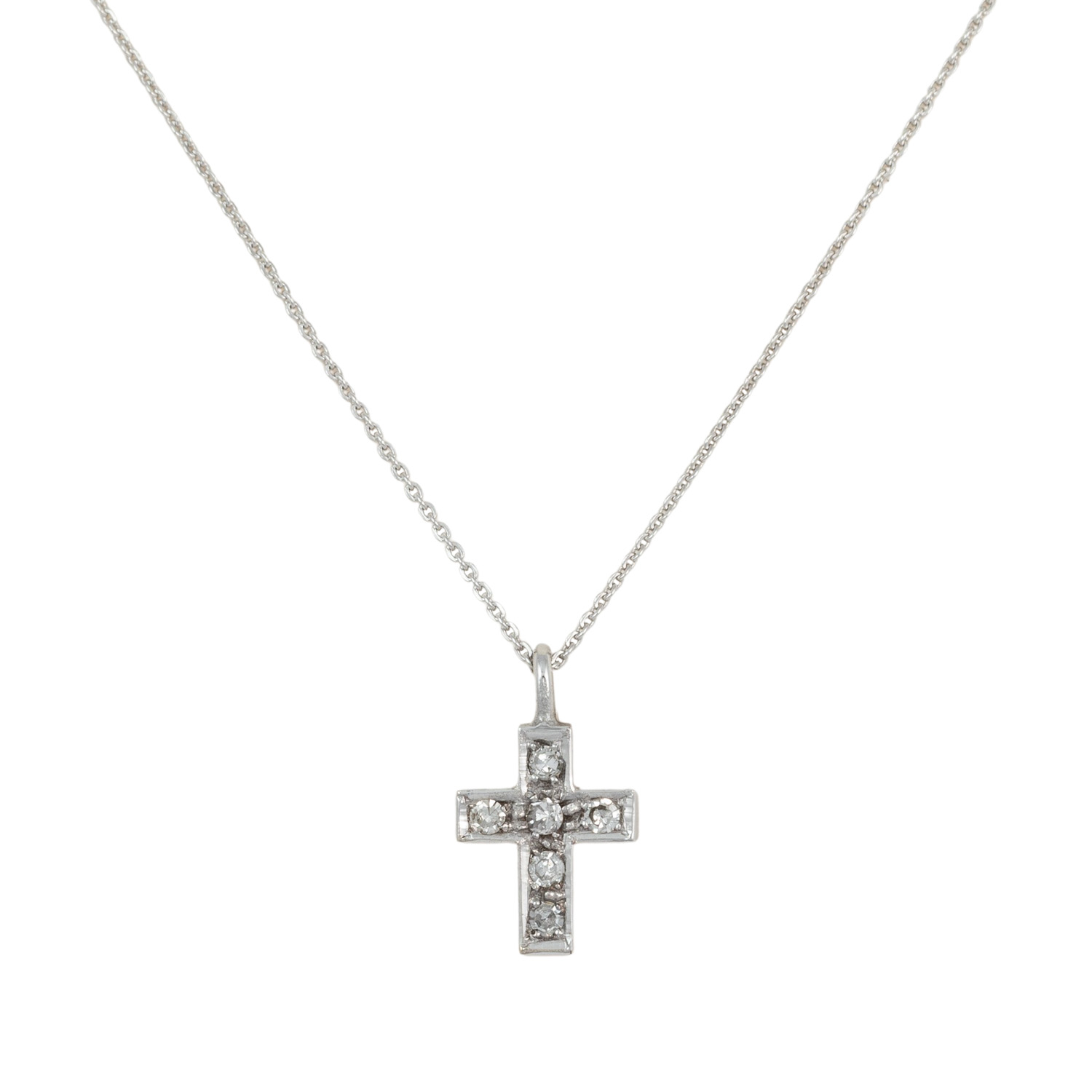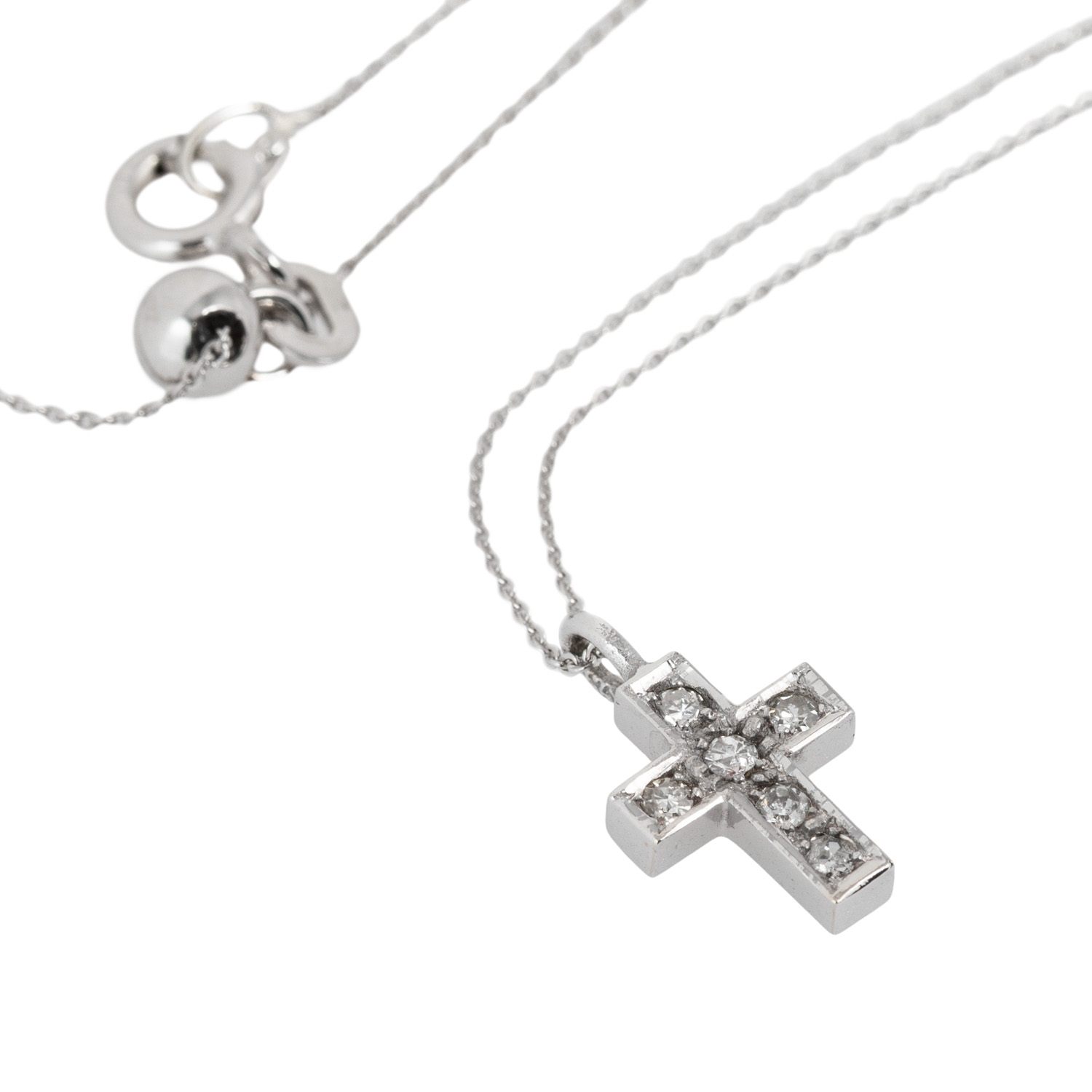 Necklace with cross pendant, 6 single cut diamonds, totalling ap. 0.08 ct, 14K white gold, 1.8 g, L: 45 cm, anchor chain W: 0.7 mm, steplessly shortenable, spring ring, end 20th century, minimal signs of wear.