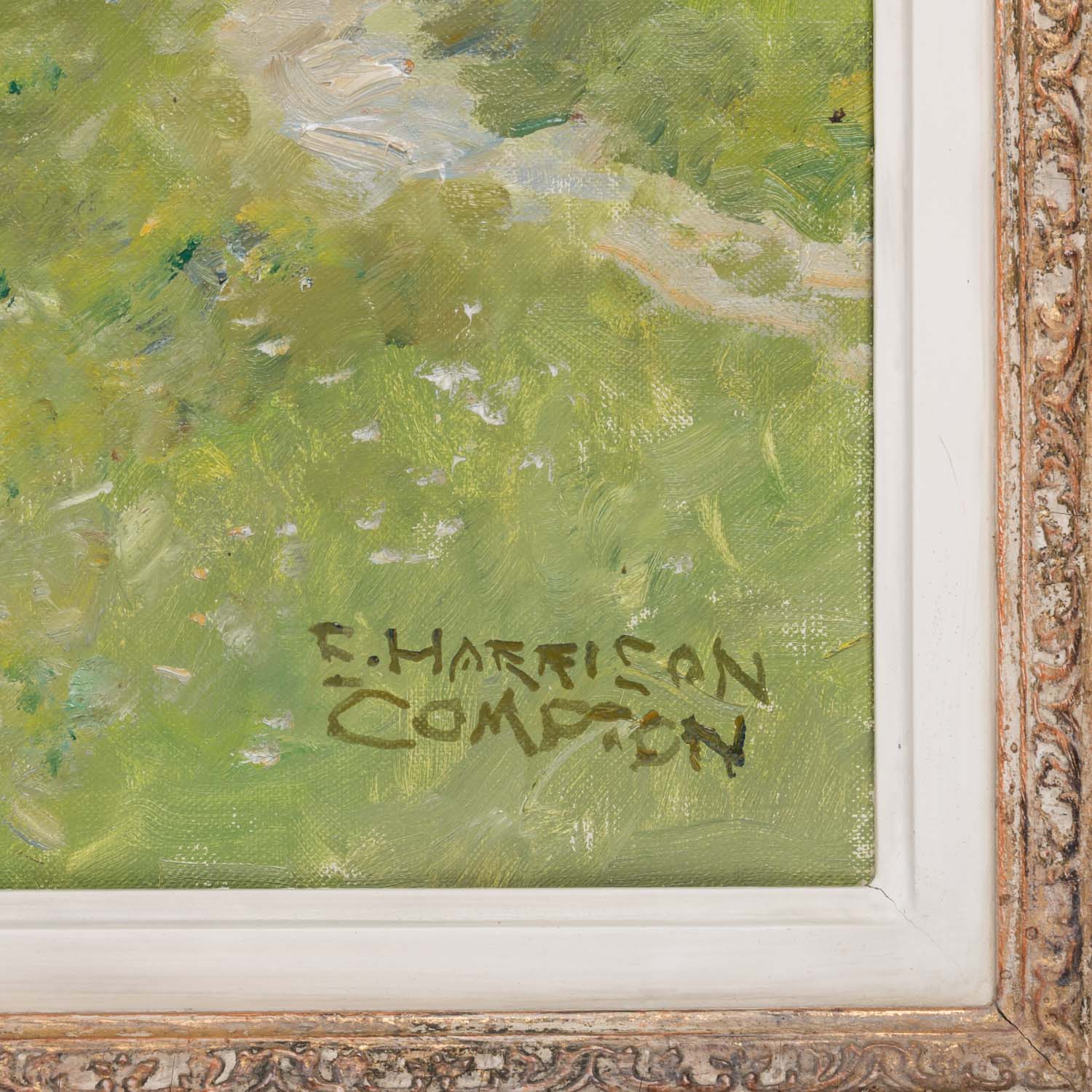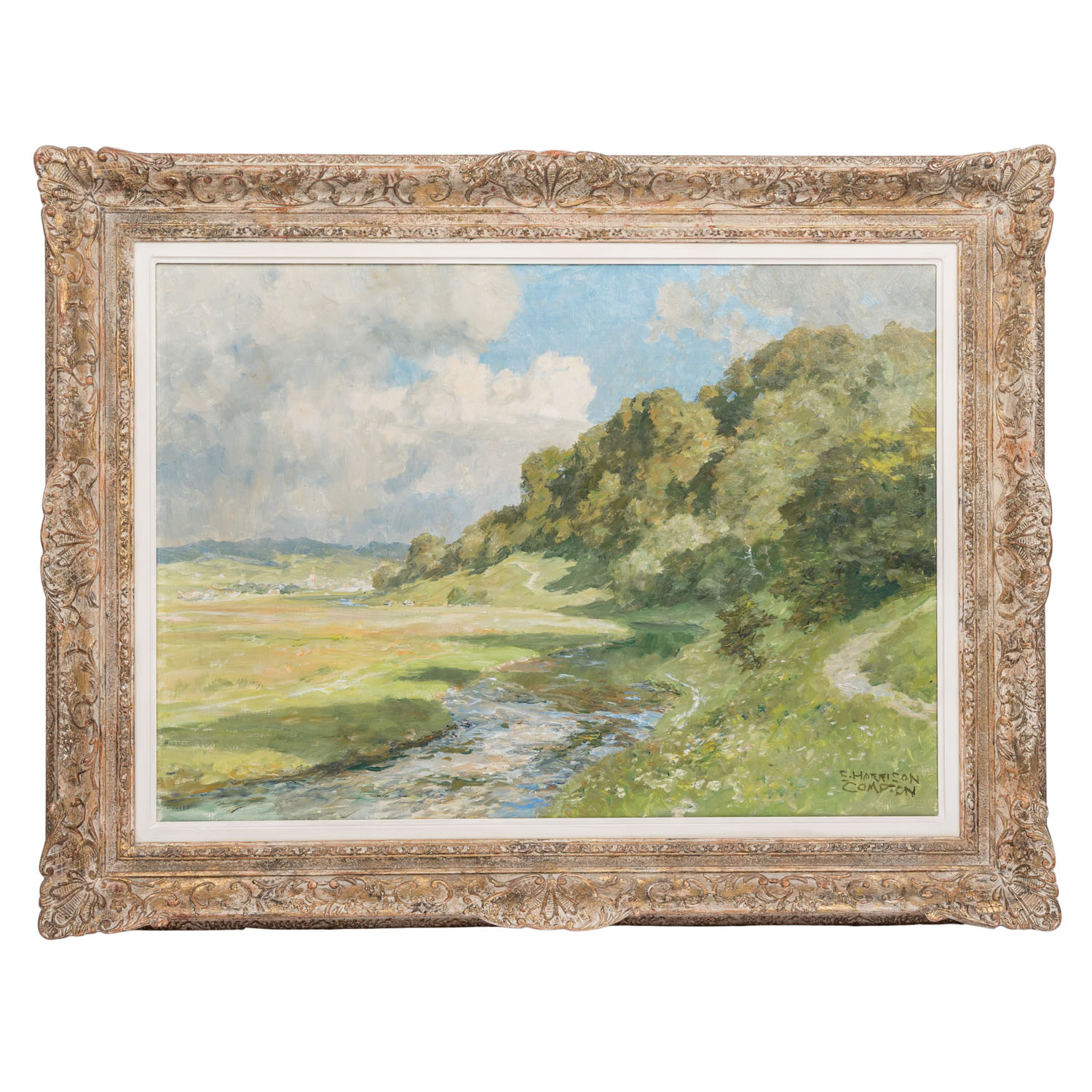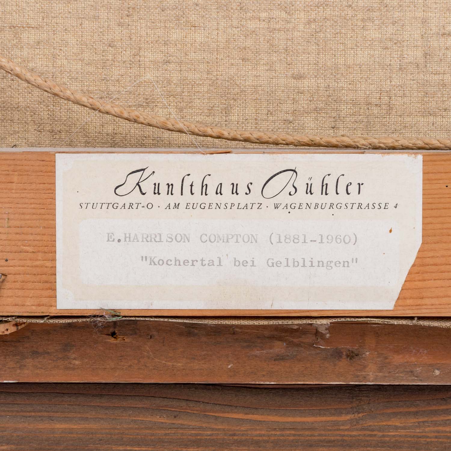 COMPTON, EDWARD HARRISON (1881-1960), ‘Das Kochertal bei Gelbingen’, River landscape in early summer mood, signed lower right, oil/canvas (maker's stamp on the reverse: Viktoria Maltuch), HxW: 50x70 cm (70x89 cm with frame). Slight signs of age and wear. With frame. VERSO label Kunsthaus Bühler, Stuttgart with inscription.