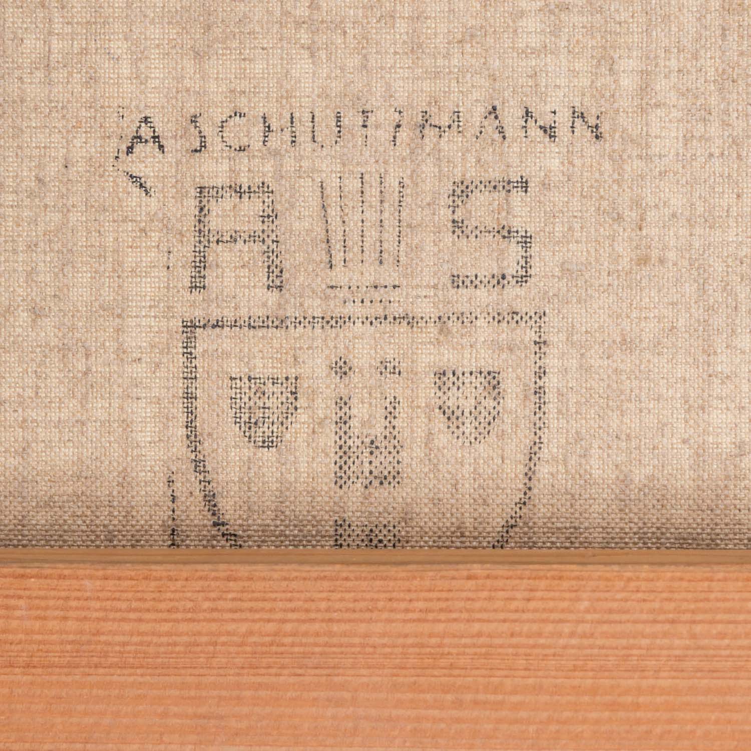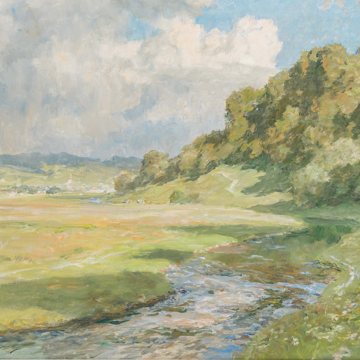 Flusslandschaft in Frühsommerstimmung, u.re. signiert, Öl/Leinwand (rückseitig Herstellerstempel: Viktoria Maltuch), HxB: 50x70 cm (70x89 cm mit Rahmen). Leichte Alters- und Beriebspuren. Mit Rahmen. VERSO Etikett Kunsthaus Bühler, Stuttgart mit Bezeichnung.