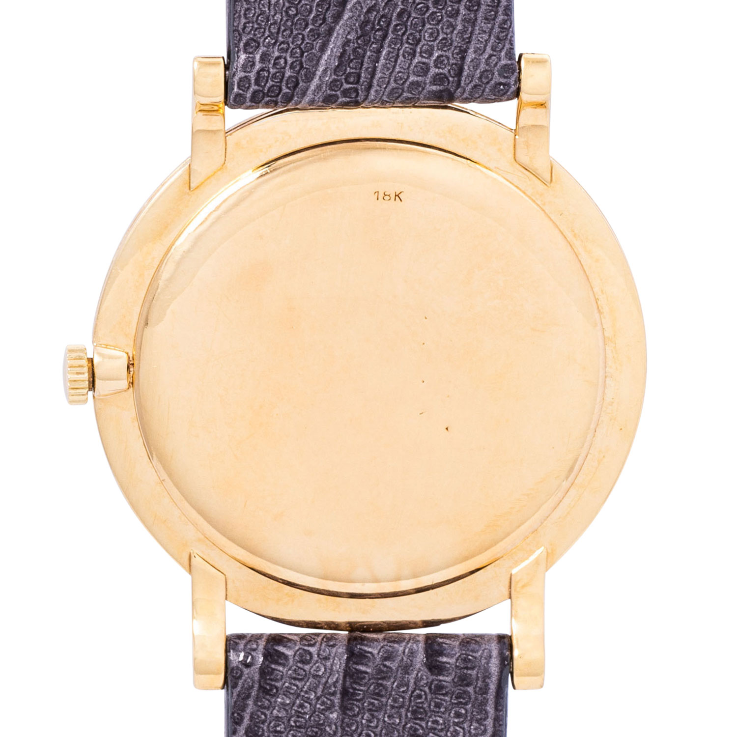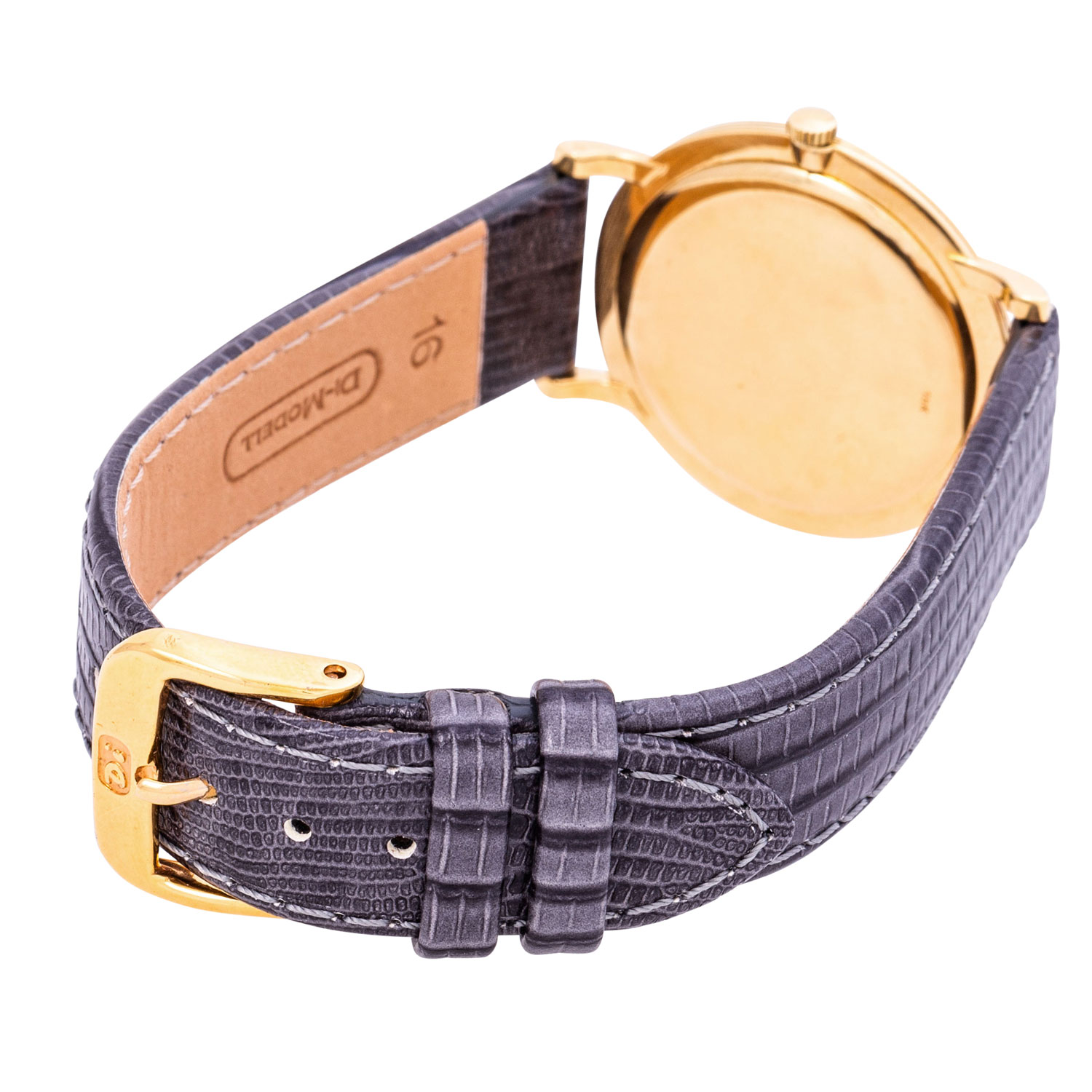 18K Gelbgold. Neues Lederband mit Stiftschließe. Handaufzugswerk, Nr. 26212 mit guten Gangwerten, Protokoll anbei. Goldenes Zifferblatt mit Strichindizes, teils fleckig. Gebrauchter Zustand, Tragespuren und Dellen am Gehäuseboden. Durchmesser ca. 31,5 mm ohne Krone. Passend bis zu ca. 19,5 cm Handgelenkumfang.