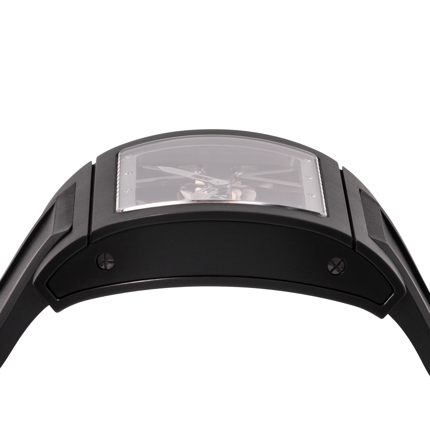 Titan, PVD-beschichtet. Limitierte Auflage Nr. 066/250 Stück weltweit. Handaufzug-Stabwerk Kal. CO007, sehr gute Gangwerte (+10s/d, 292°). Skelettiertes Zifferblatt mit Streben, Leuchtzeiger. Originales Kautschukband mit Butterfly-Faltschließe in Edelstahl/Titan. Sehr guter Zustand, leichte Gebrauchsspuren an Gehäuseboden und Armband. Original Box, Garantiekarte (Blanko), Anleitung und Limitierungszertifikat anbei. Durchmesser ca. 42,5mm ohne Krone, passend für ca. 20cm Handgelenksumfang.