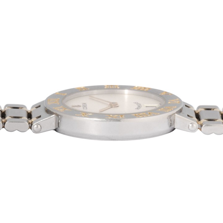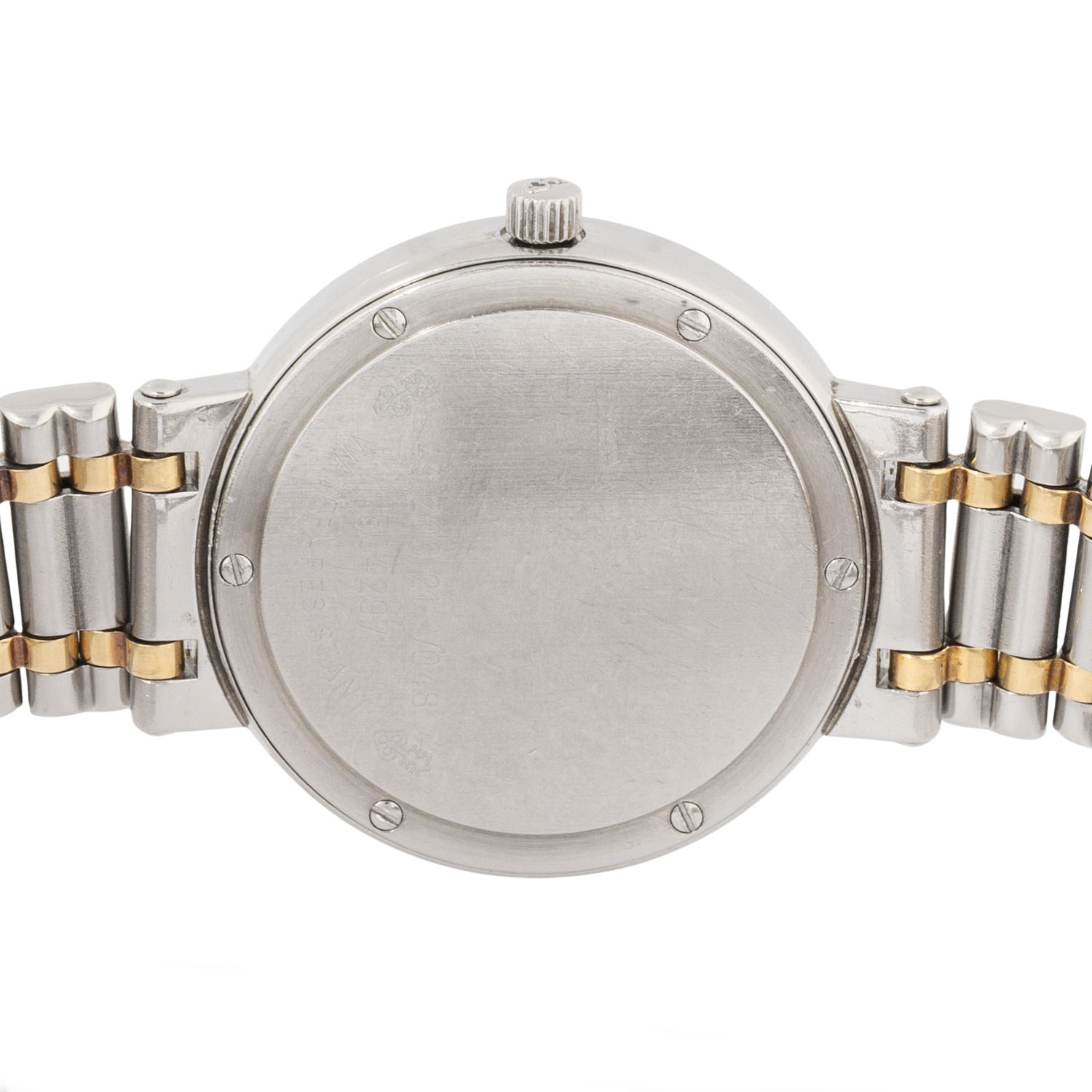 Edelstahl / 18K Gelbgold. Quarzwerk mit neuer Batterie. Graues Zifferblatt mit Datumsanzeige, römische Zahlen auf der Lünette. Edelstahl / 18K Gelbgold Gliederarmband mit Butterflyschließe. Guter Zustand, mit Tragespuren. Erstkaufrechnung anbei (04/1995). Durchmesser ca. 26 mm gemessen ohne Krone. Passend bis zu einem Handgelenksumfang von ca. 15 cm.
