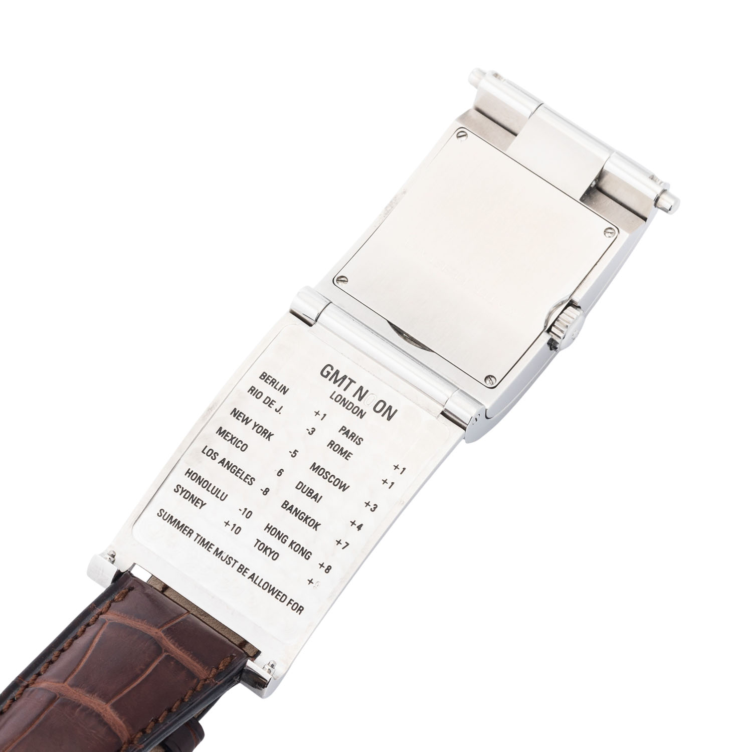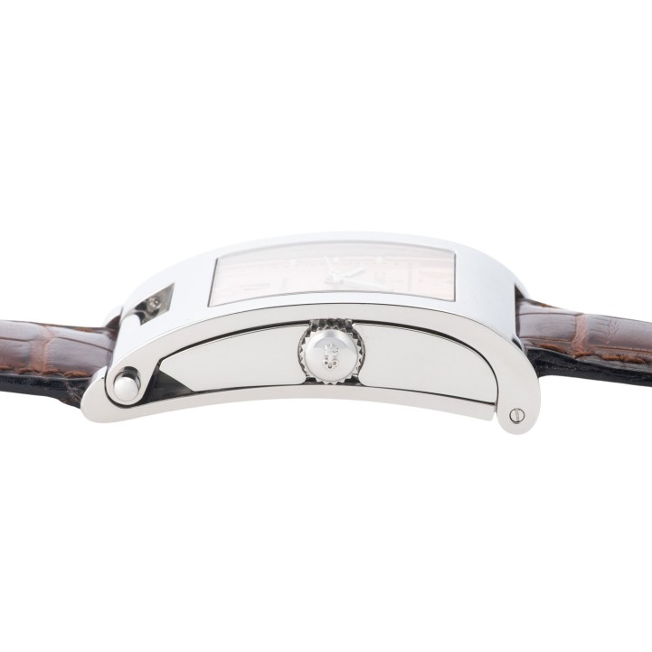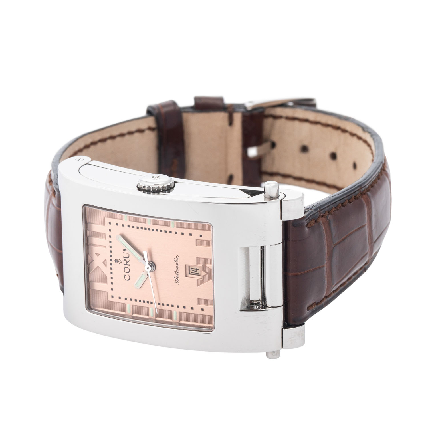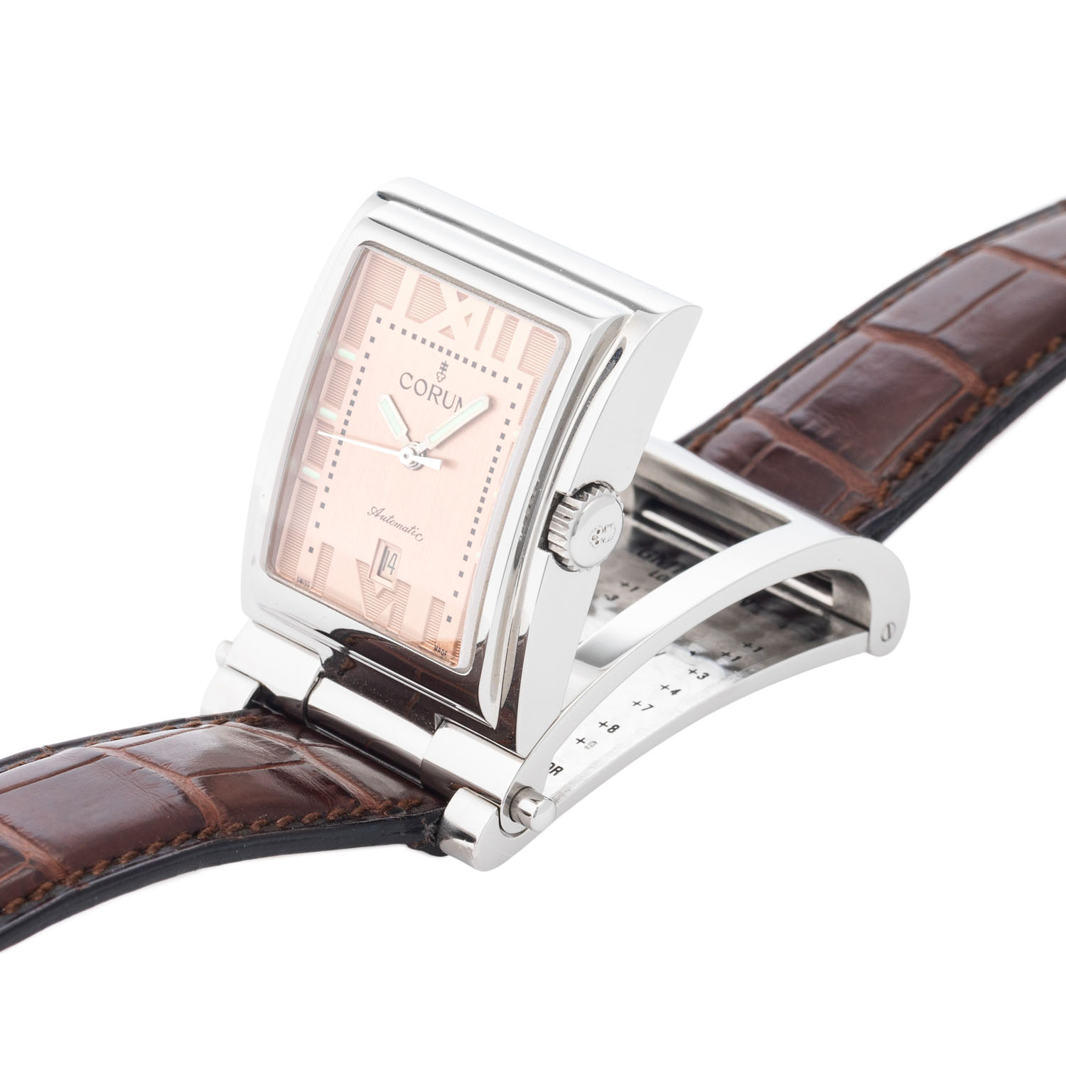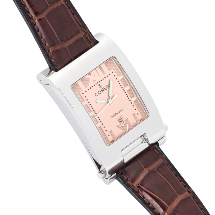 Mehrteiliges Edelstahlgehäuse mit GMT-Zeittabelle im inneren Gehäuseboden. Automatik-Werk ETA Kal. 2000-1, funktionsfähig. Service empfohlen.. Kupferfarbenes Zifferblatt mit römischen Ziffern, Datumsanzeige bei 6 Uhr. Neuwertiges, originales, braunes Corum Lederband mit original Stiftschließe. Original Corum Box anbei. Gebrauchter Zustand, Tragespuren am Gehäuse. Durchmesser ca. 26,5 mm, gemessen ohne Krone.