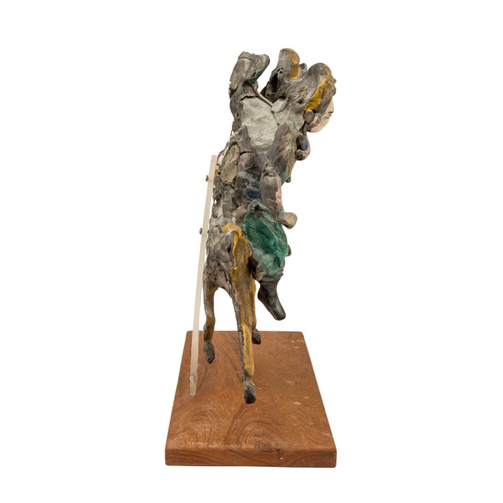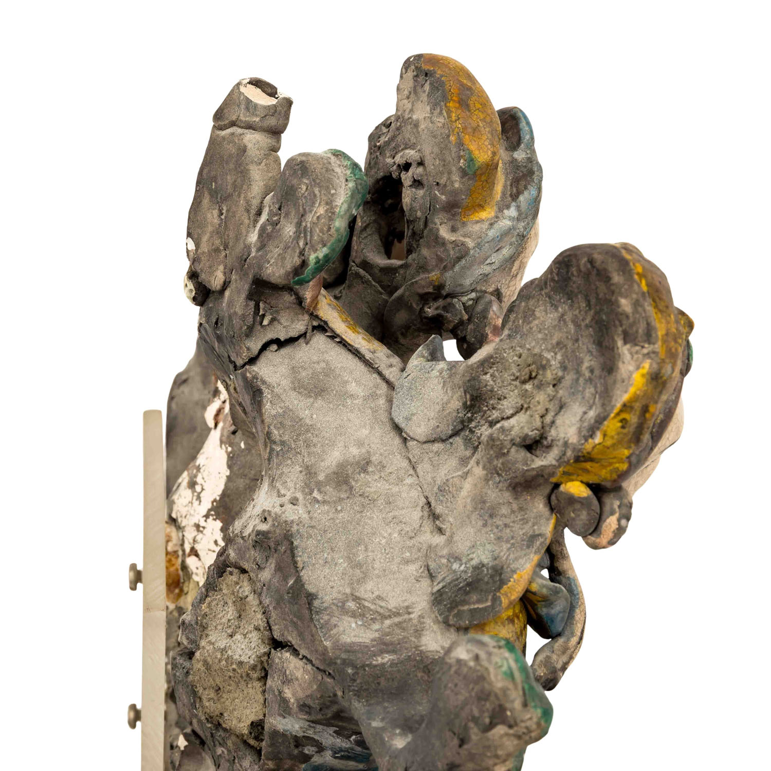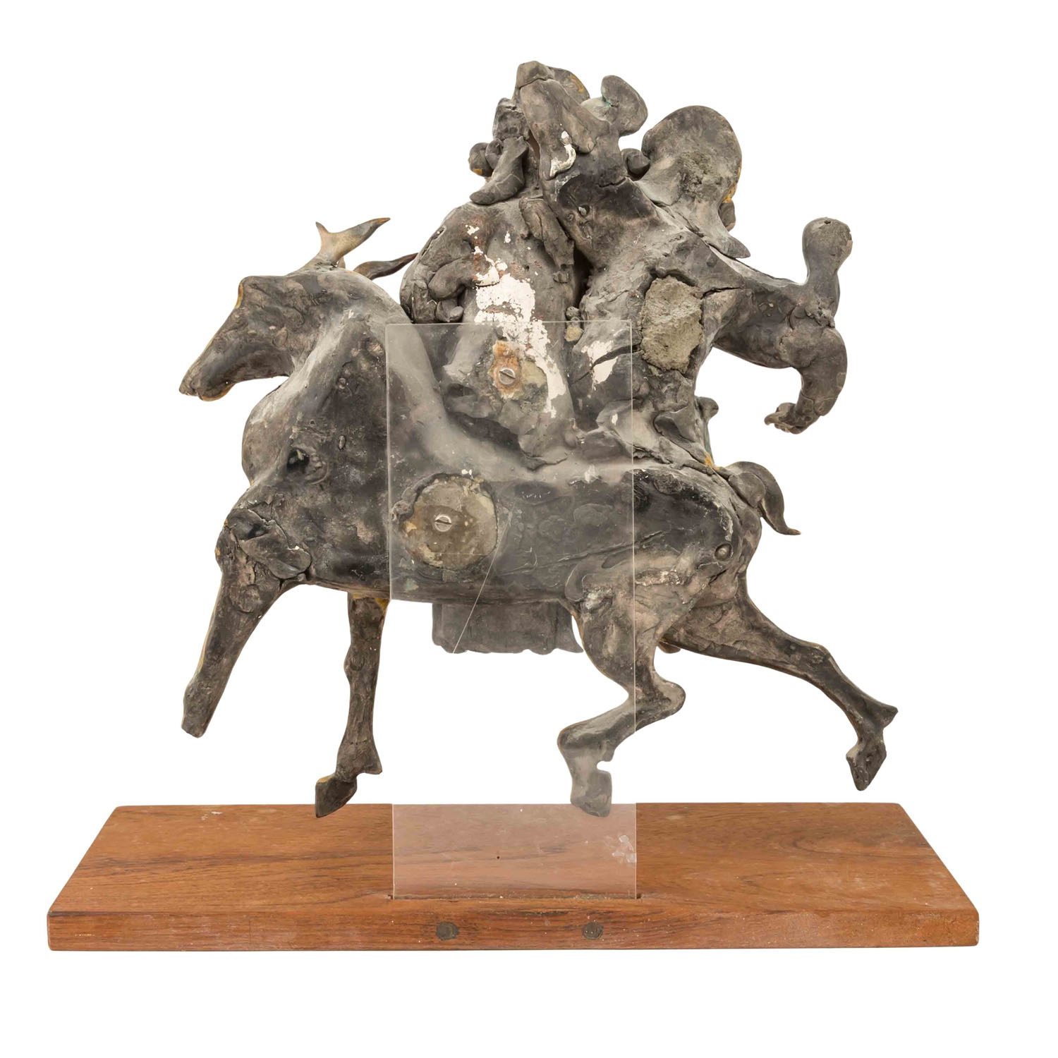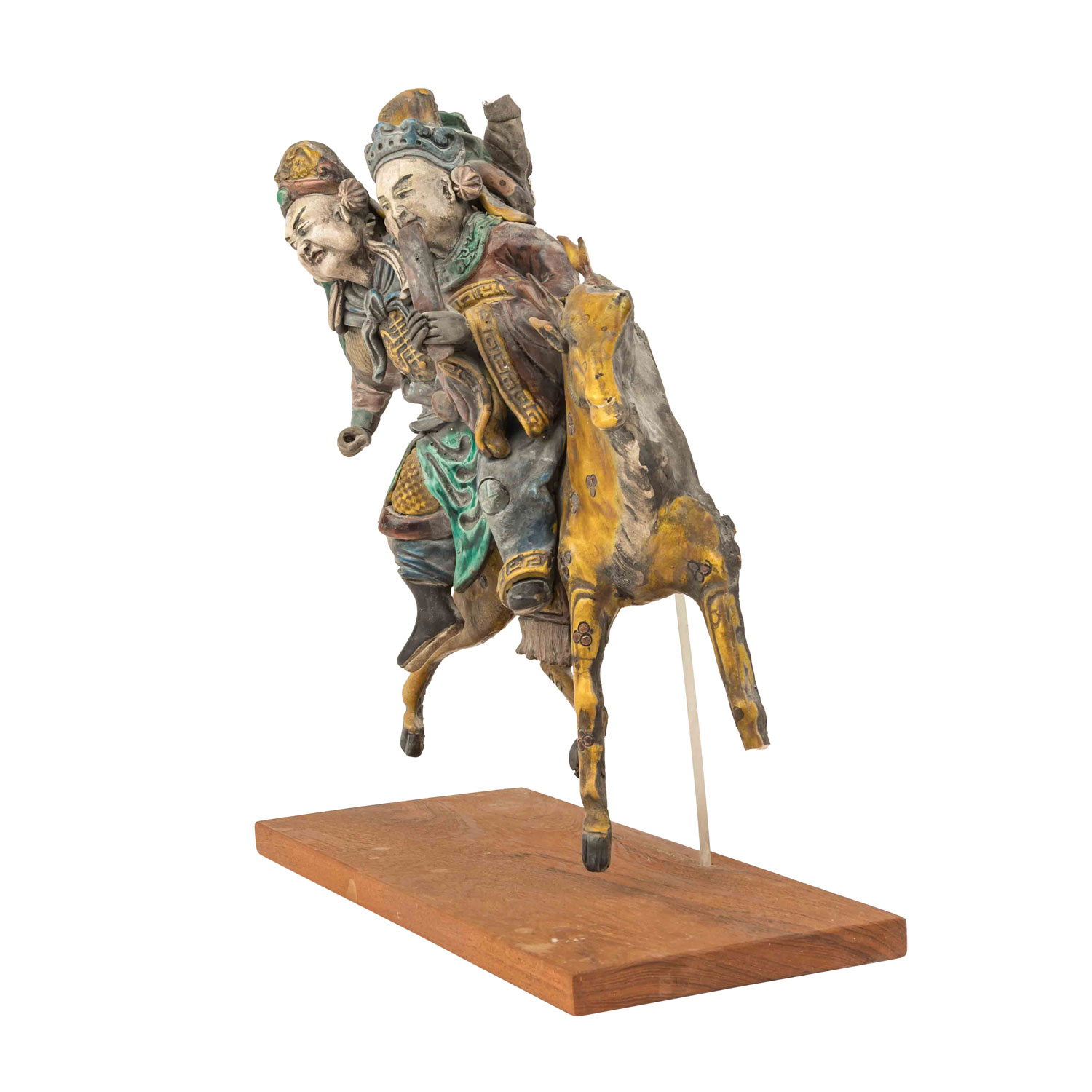 Giebelbekrönung/Firstschmuck in Form einer Figurengruppe betehend aus zwei Figuren, die auf einem Hirsch reitend dargestellt sind. Aus farbig glasierter Keramik. HxBxT: 36x38x15 cm. Stark besch., u.a. fehlt einer Figur ein Arm und beim Hirsch ein Vorderlauf. Montiert auf einen Aufsteller aus Plexiglas und Holz.