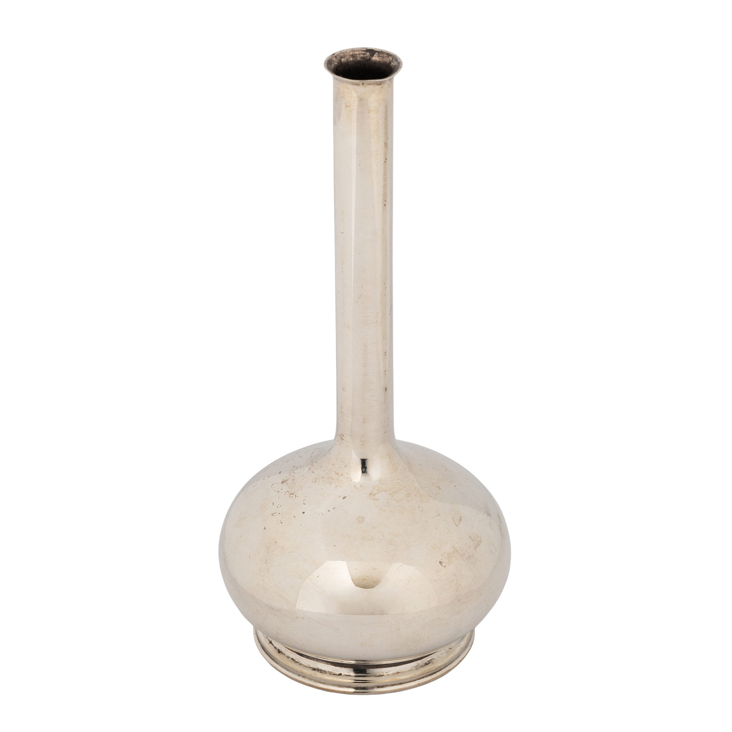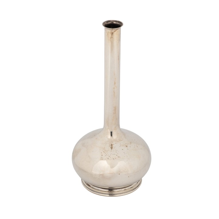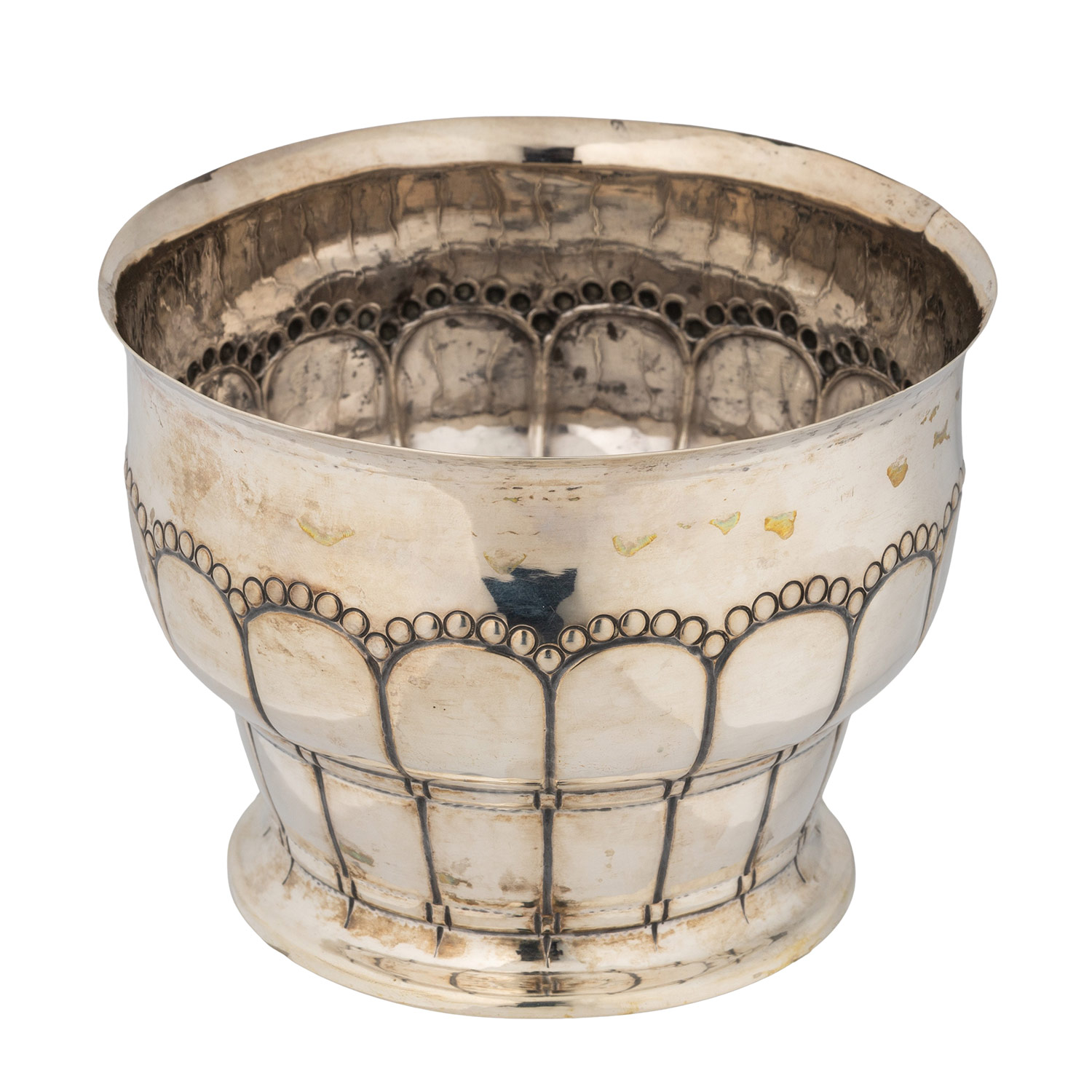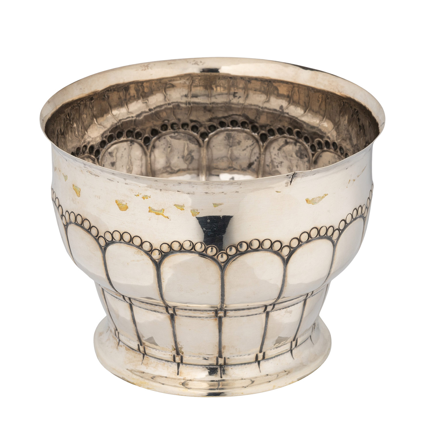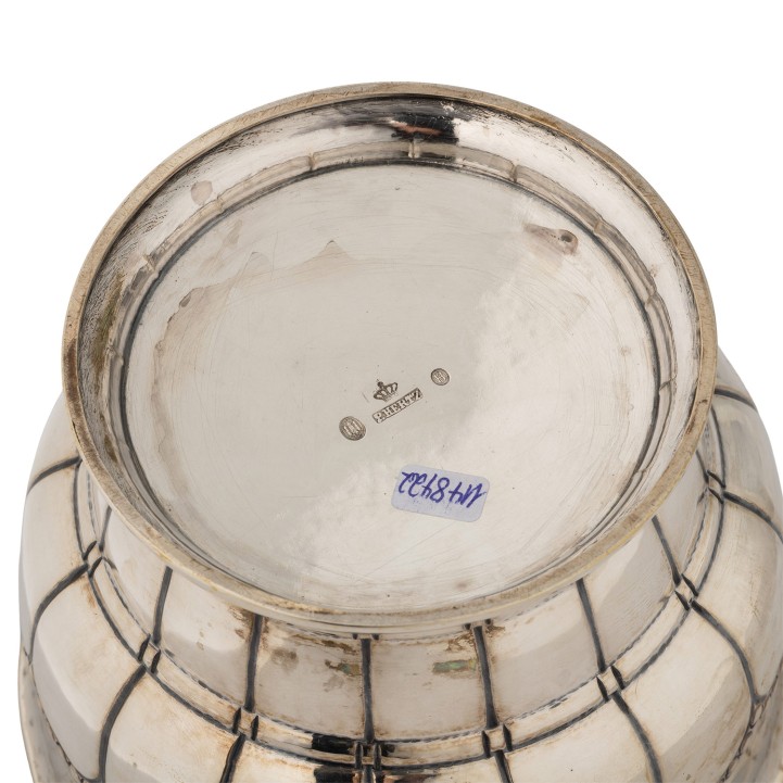 Schale mit geometrischem Dekor, Stadtmarke mit Jahresangabe 1915, Meistermarke P. HERTZ (Peter Hertz), Beschaumeister CHRISTIAN F. HEISE, H. ca. 9,5 cm, Gewicht ca. 181 g, am Rand leicht eingerissen; Vase mit profiliertem Rundstand, leicht bauchigem Korpus und schmalem, langem Hals, Stadtmarke mit Jahresangabe 1953 und Meistermarke SILVERCO, H. ca. 13,5 cm, Gewicht ca. 65 g, leicht gedellt.