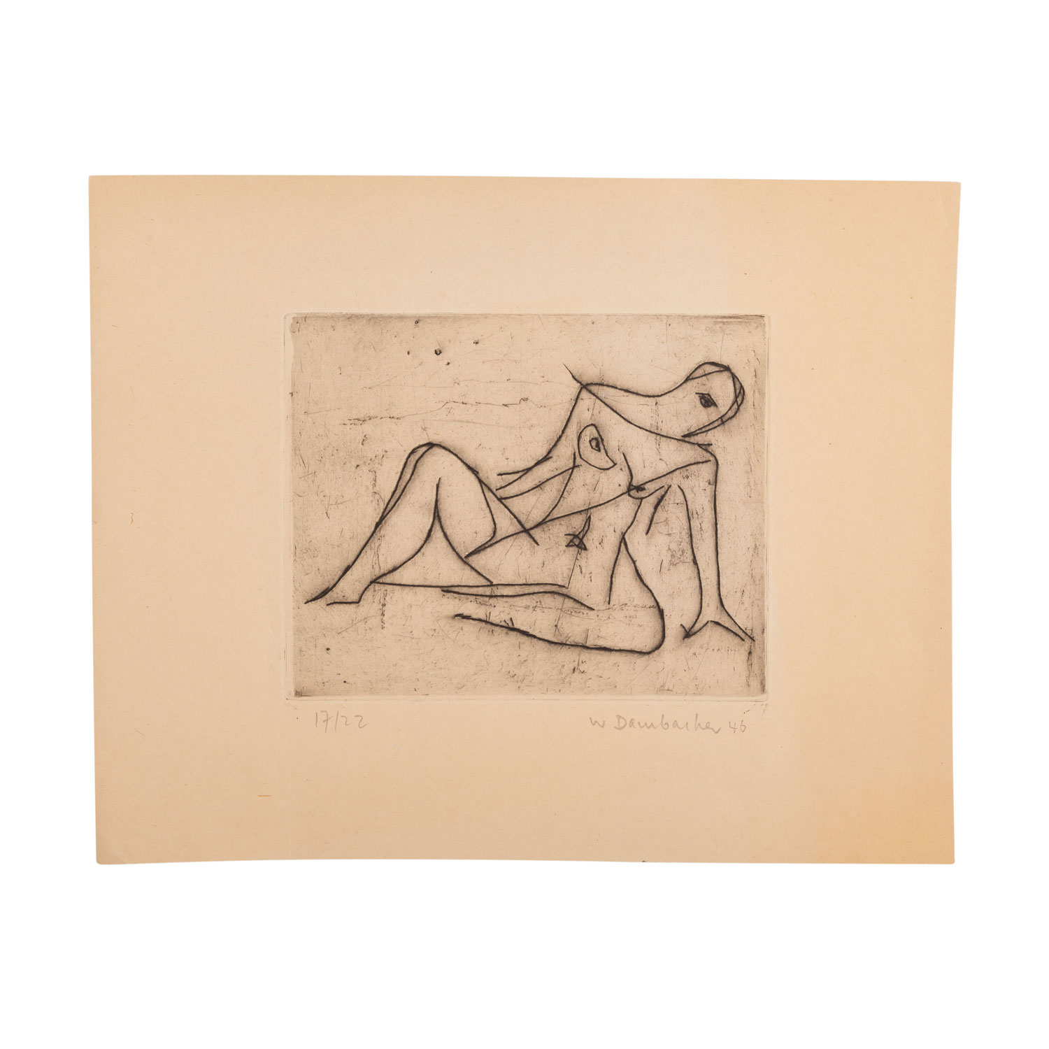 DAMBACHER, WALTER (1911-1997),  2 Radierungen "Figürliche Komposition",  1x "Sitzender weiblicher Akt", von Hand signiert, datiert (19)46 u. num. 17/22; 1x "Abstrakte Komposition", von Hand signiert, datiert (19)65, num. 3/15, HxB: Platte ca. 14x17 cm u. 15x10 cm, Blatt bis ca. 24,5x30,5 cm. Gebräunt, Knicke, minim. Randschäden.