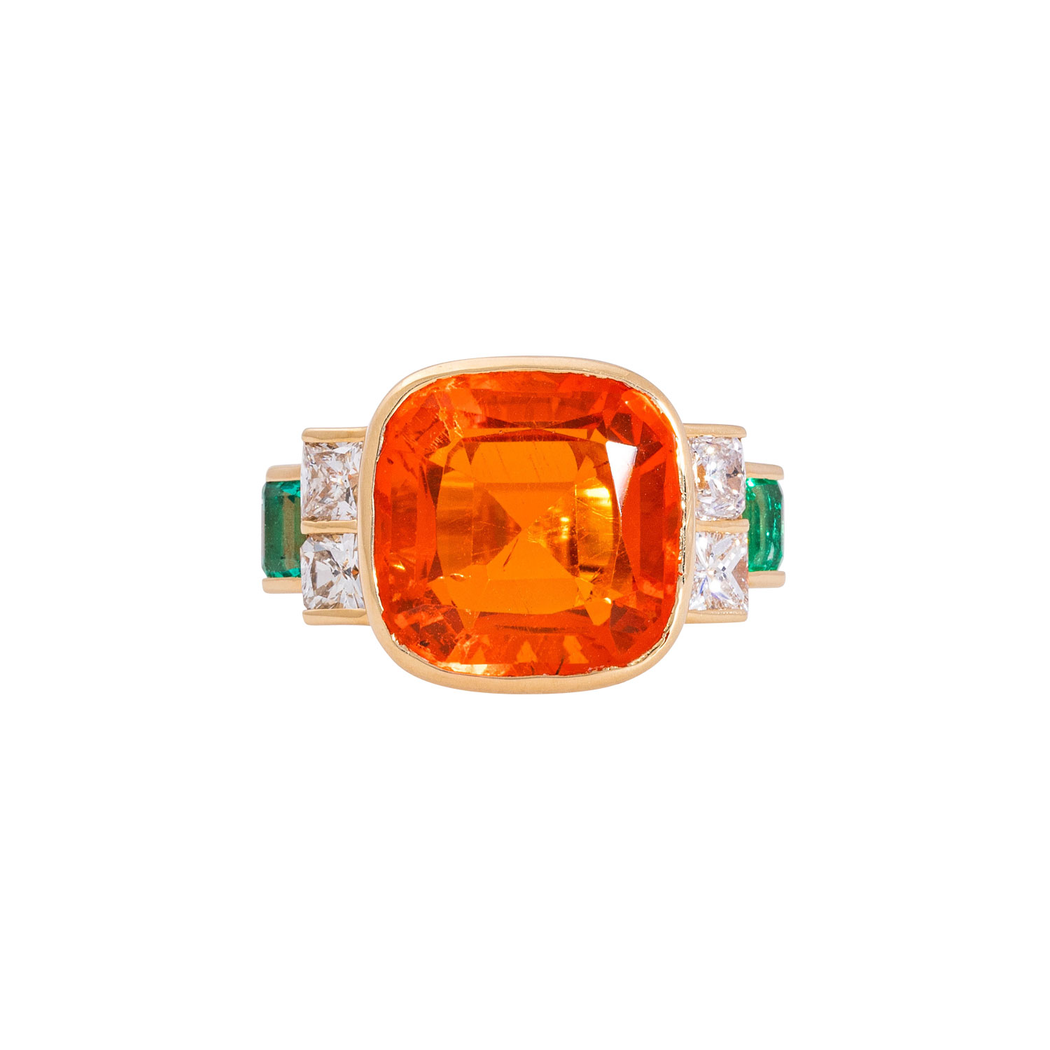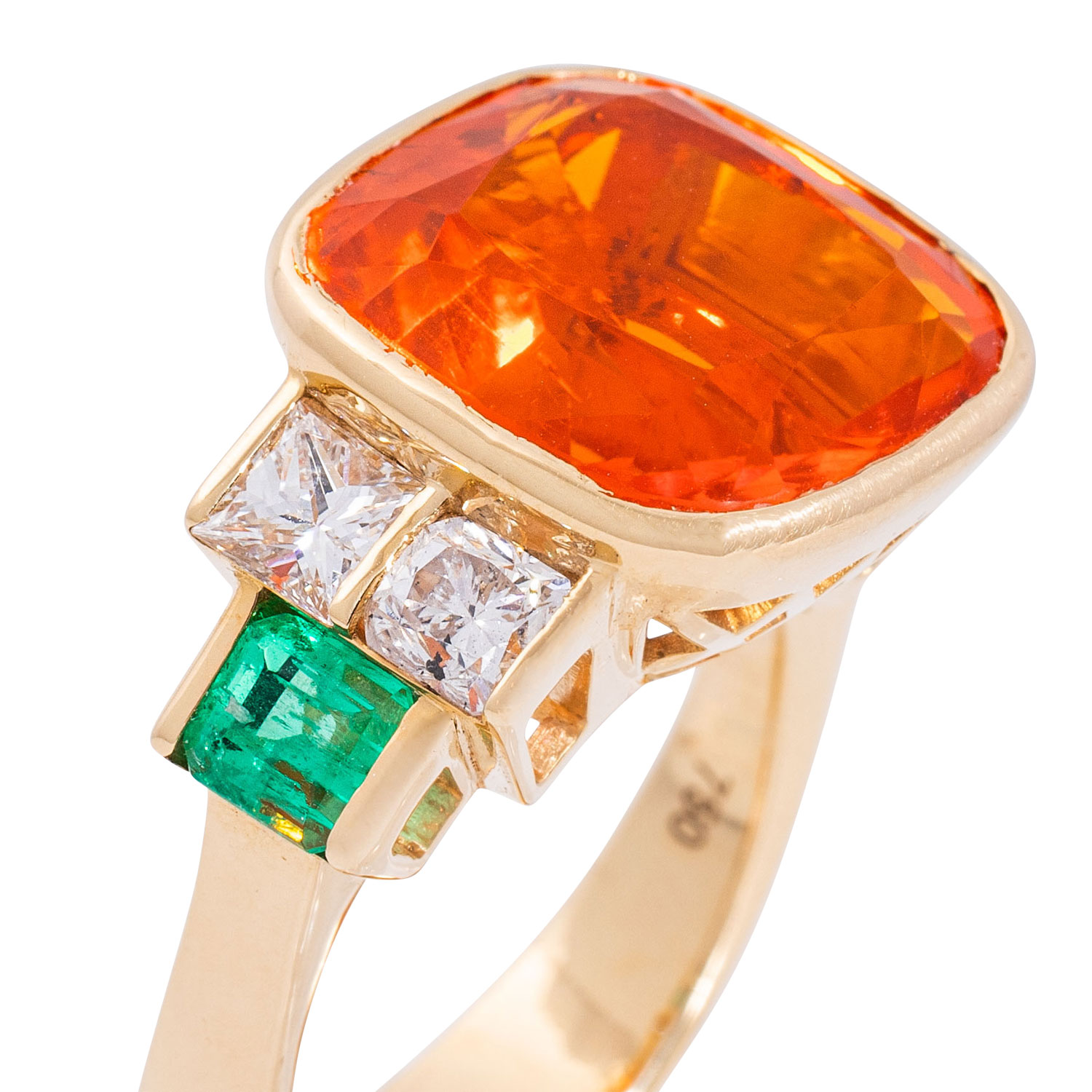 u. 2 Sambia-Smaragde 0,84 ct. sowie Princess Cut Diam. zus. 1,22 ct. H/VSI. GG 18 K. RW ca.55. GG 18 K, 10,35 g. Hochwertige Goldschmiedearbeit.