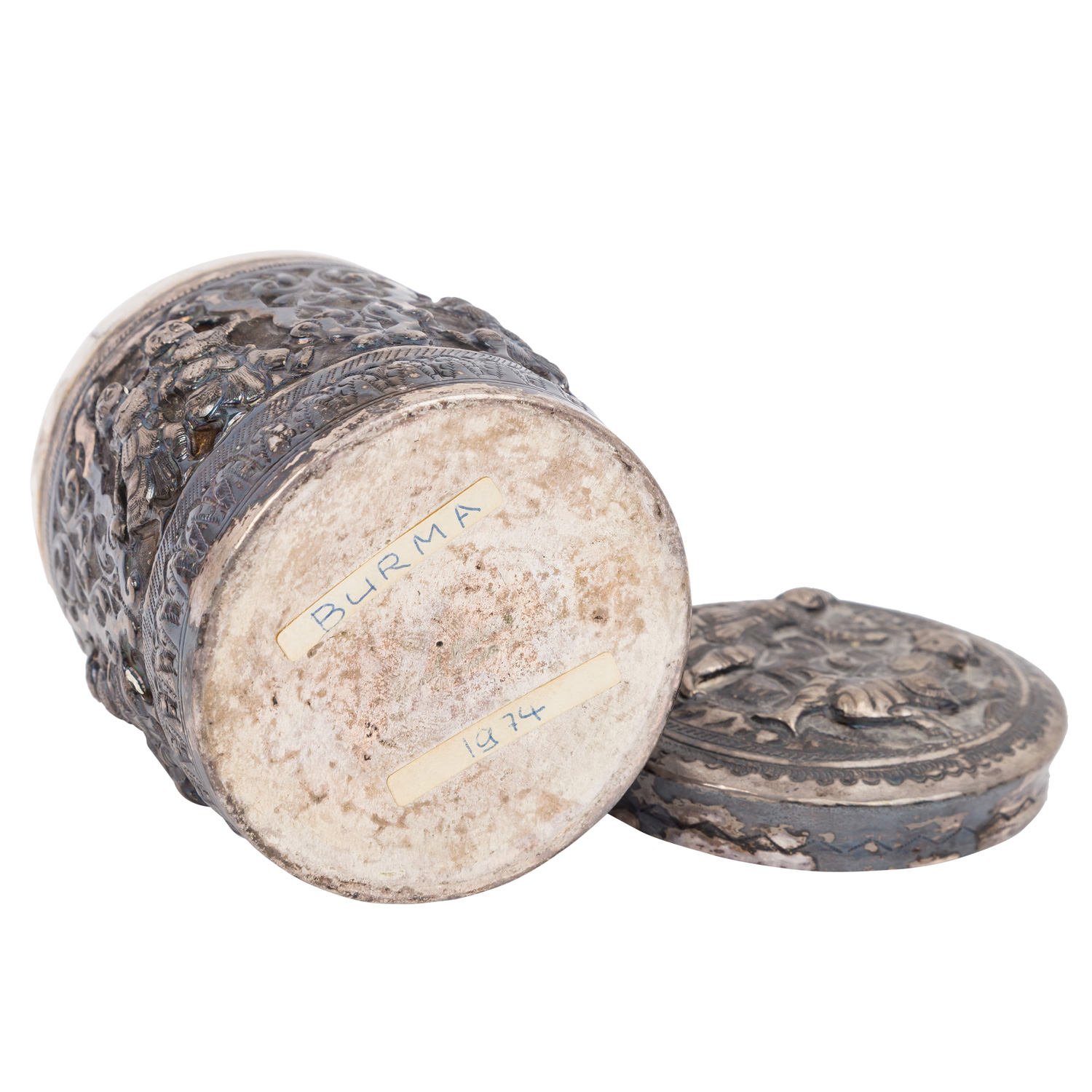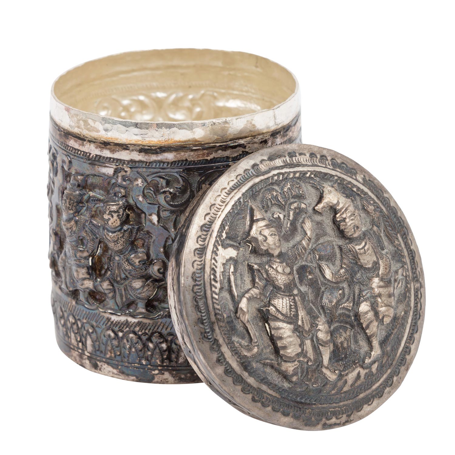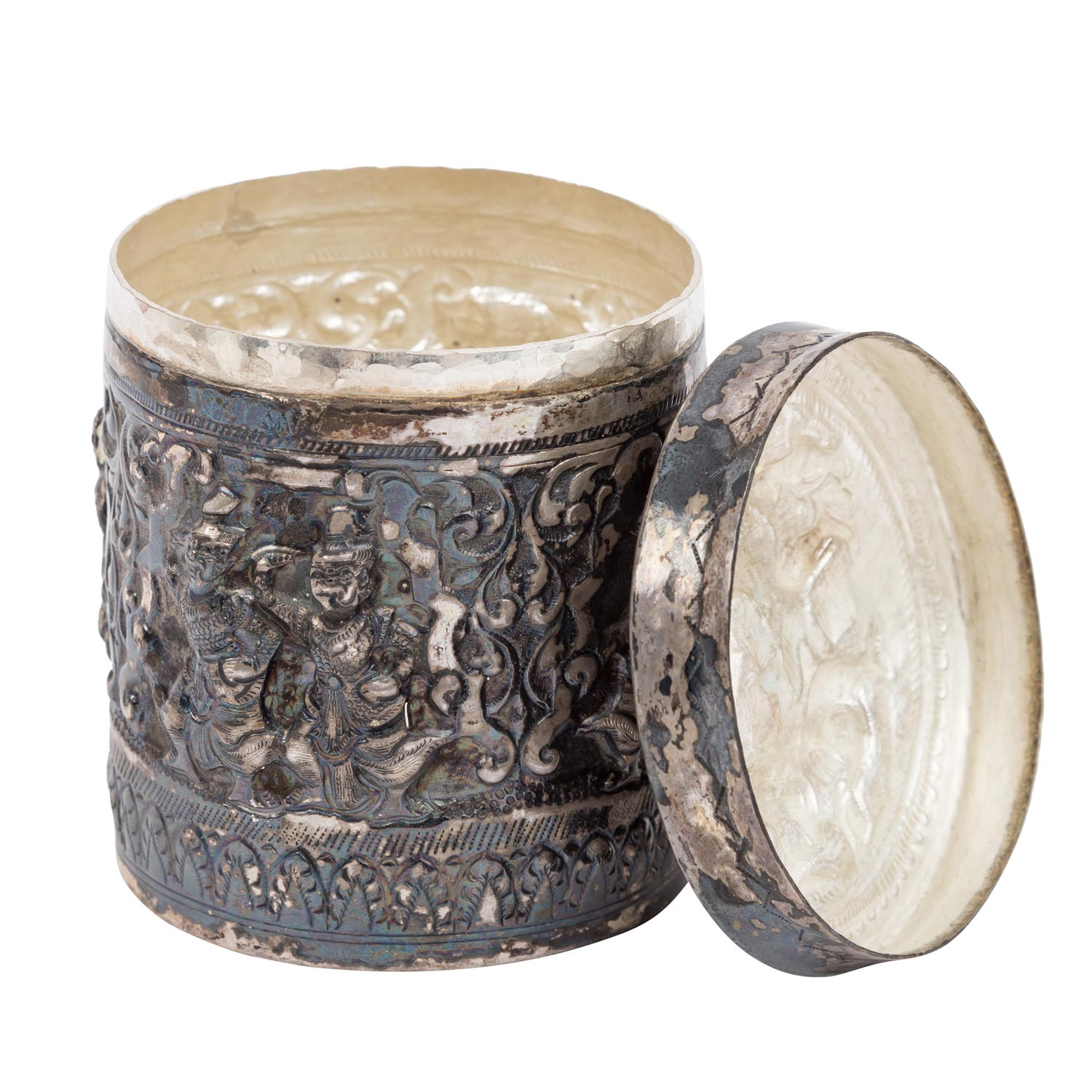 | Silver lidded box. BURMA, decorated all around and on the lid in relief with mythological figures, h: 9 cm/d: 7 cm, weight ca. : 120 g, traces of age and use.