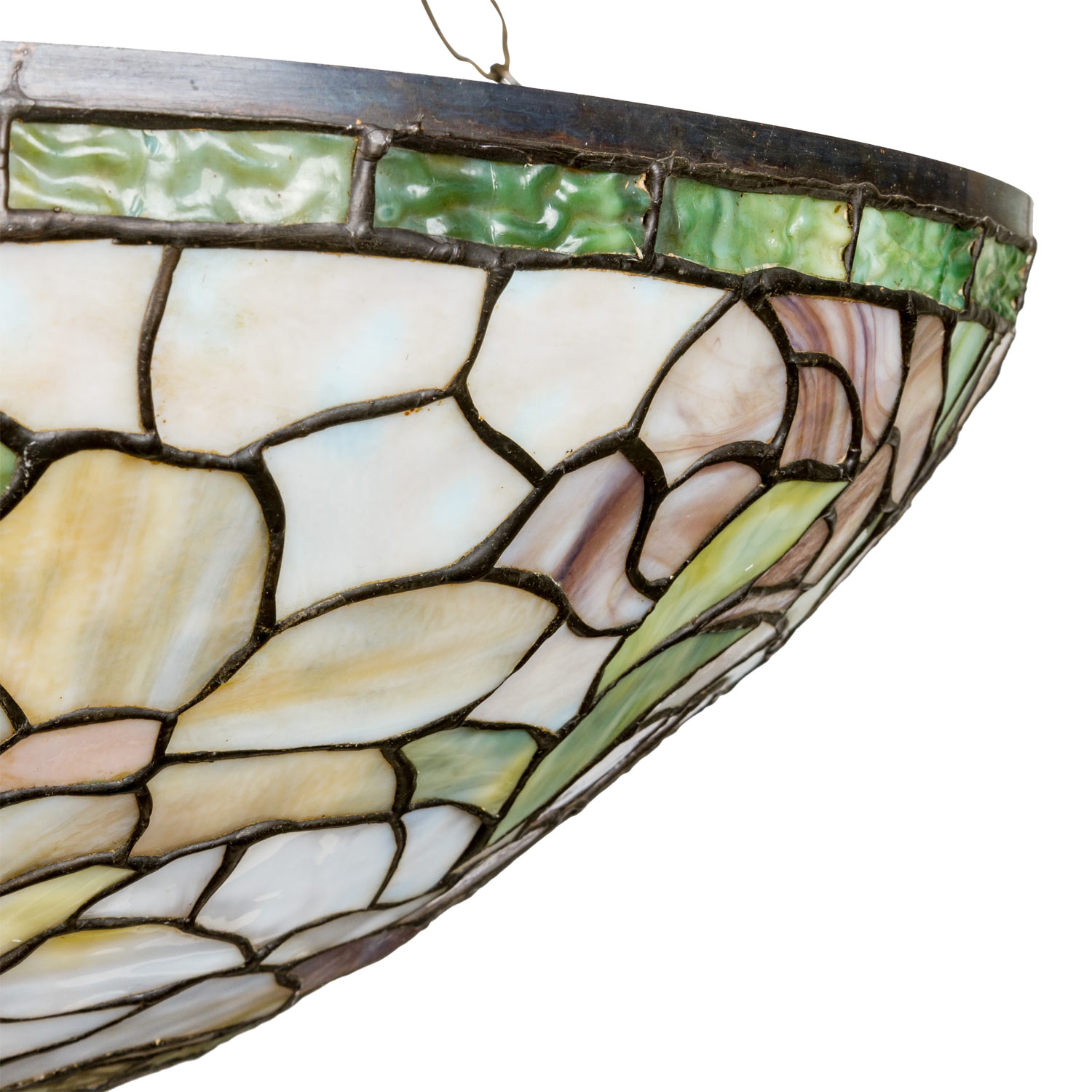Großer, runde Schale an drei Ketten hängend, balusterförmiger Schaft, bleigefasste Plättchen in Pastelltönen, elektrifiziert, D: ca. 70 cm. Altersspuren.
