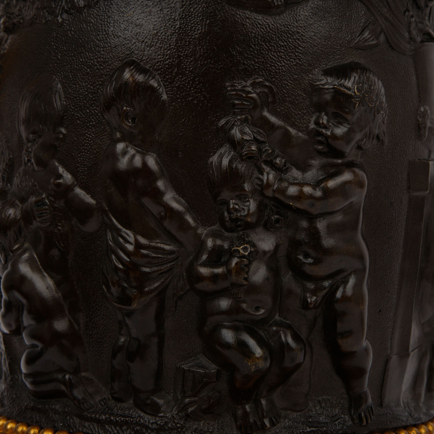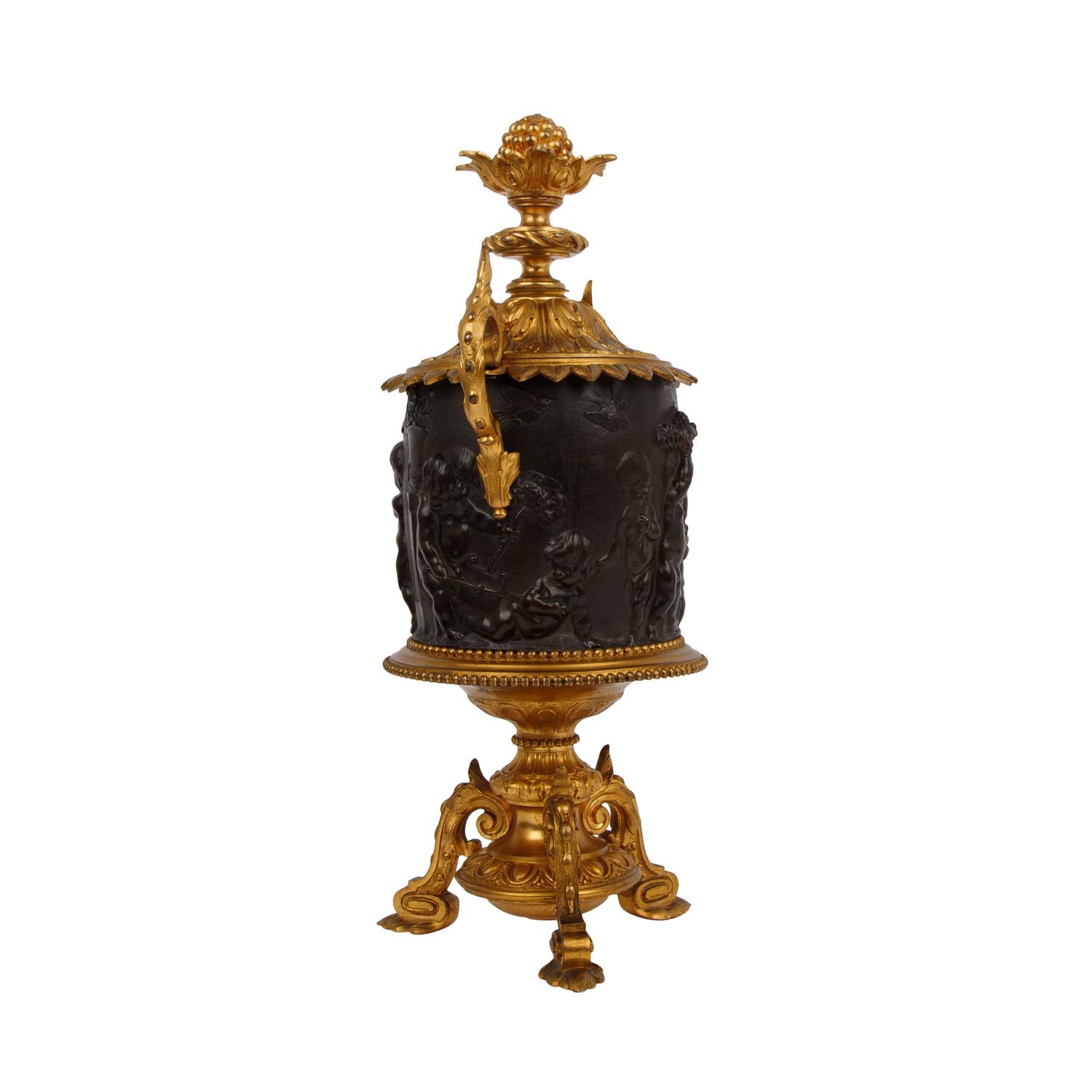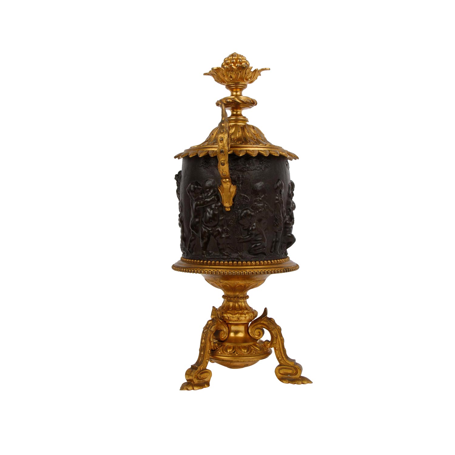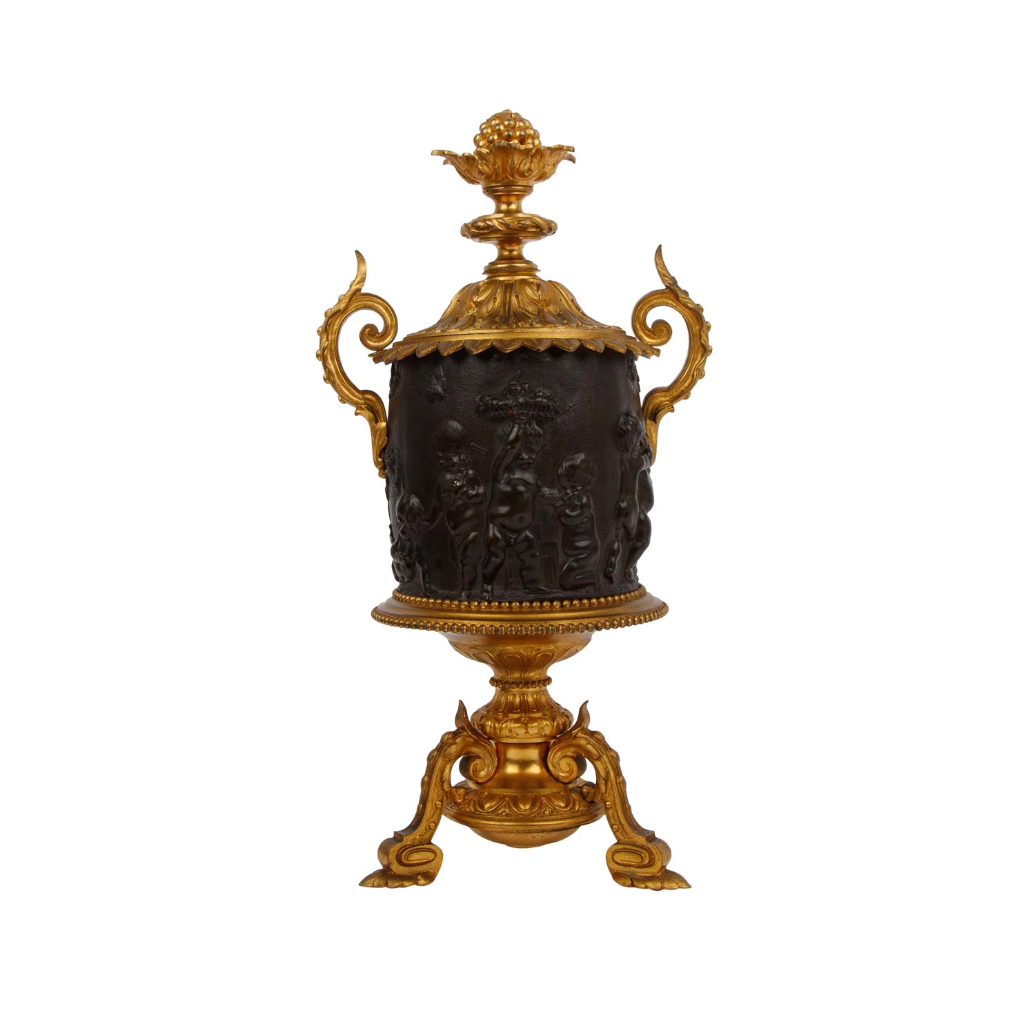 Frankreich, Ende 19. Jh., patinierter und vergoldeter Bronze, Korpus aus patinierter Bronze, Wandung umlaufend mit spielenden Amoretten, seitlich mit vollplastischen Handhaben, Fußgestell aus vergoldeter Bronze, H: 43 cm. Alters-und Gebrauchsspuren.