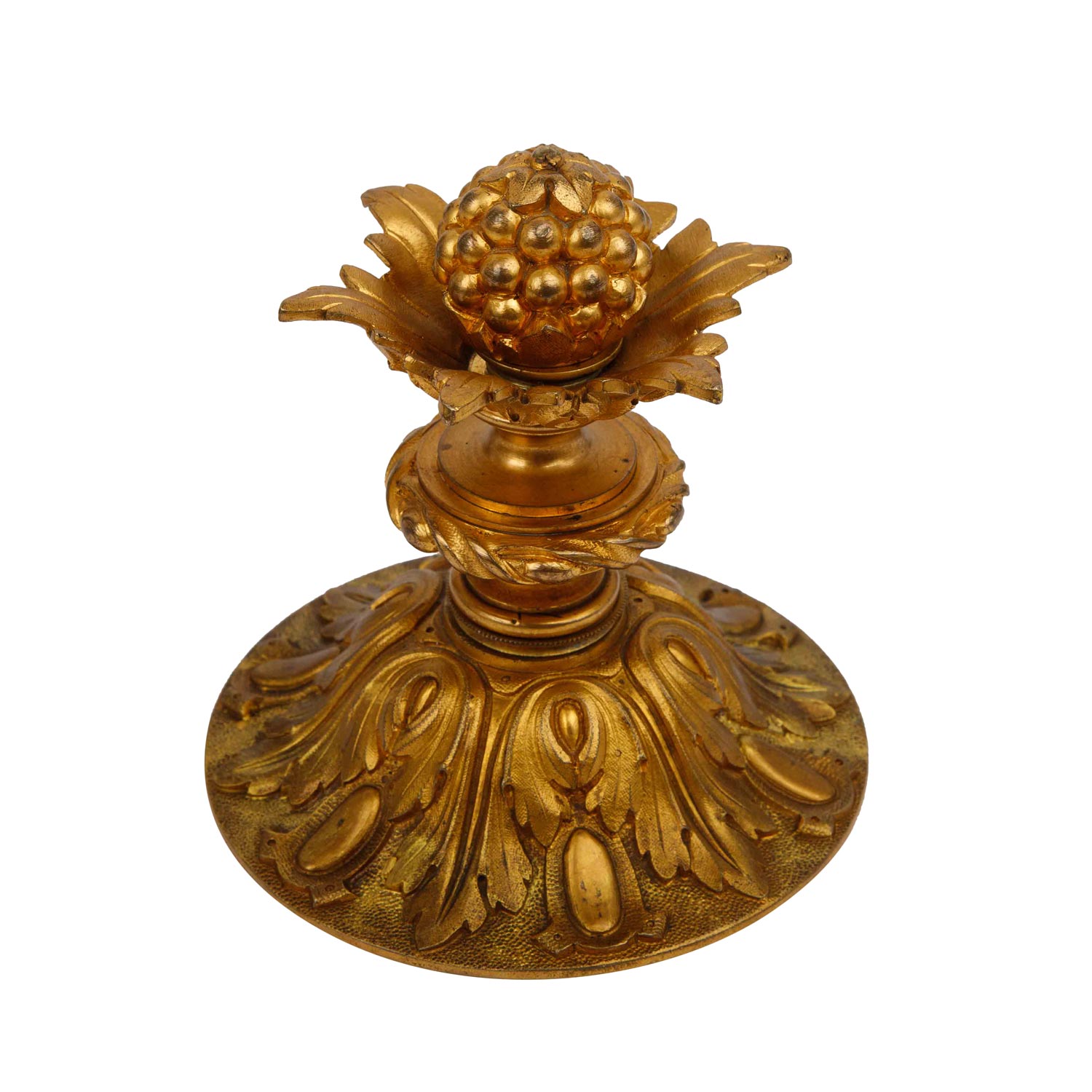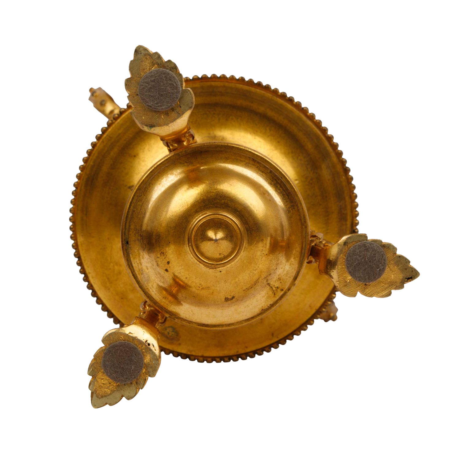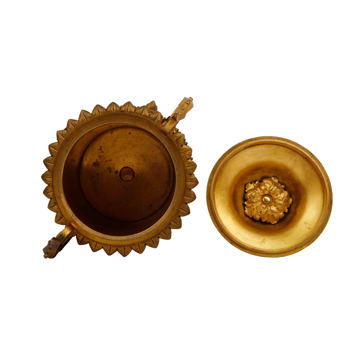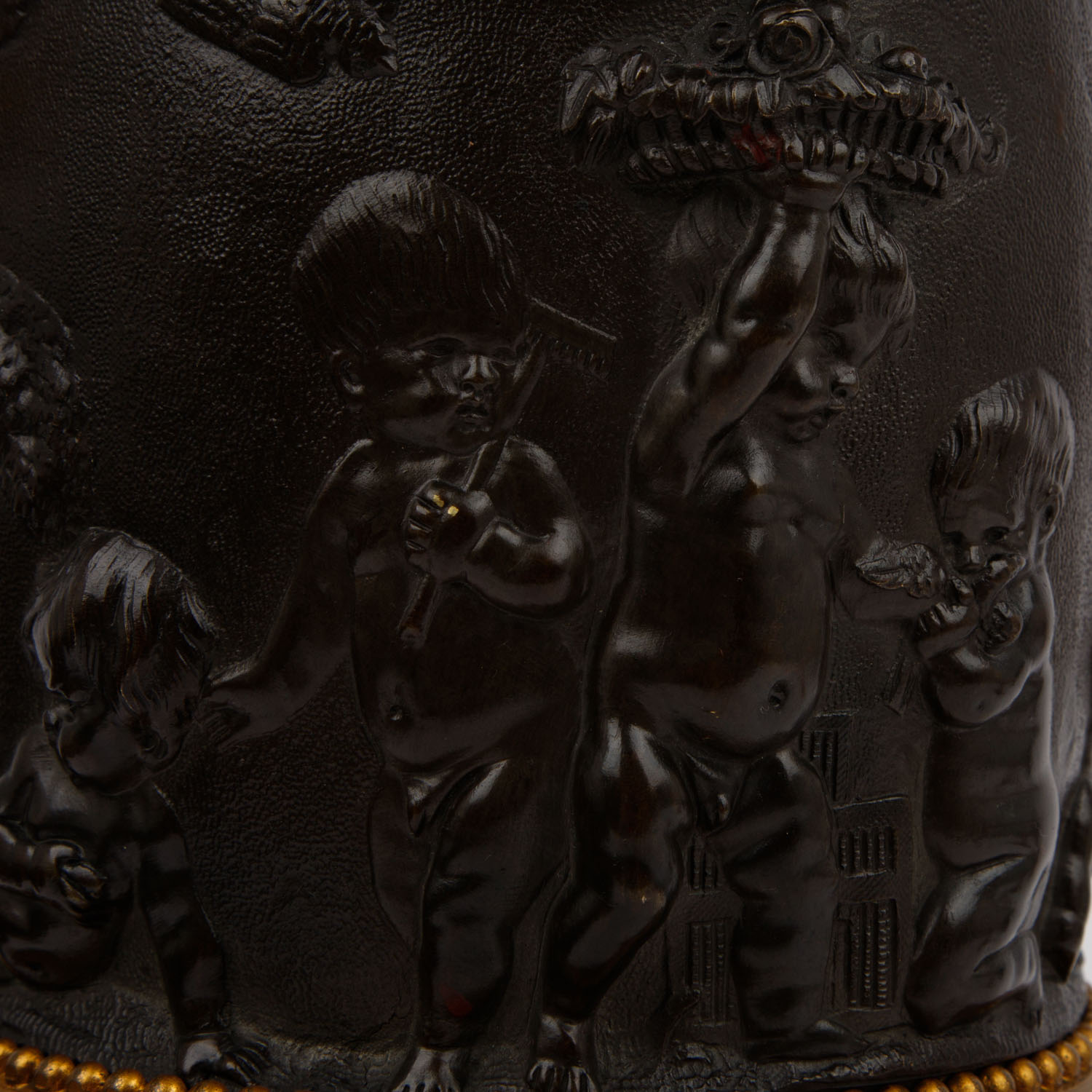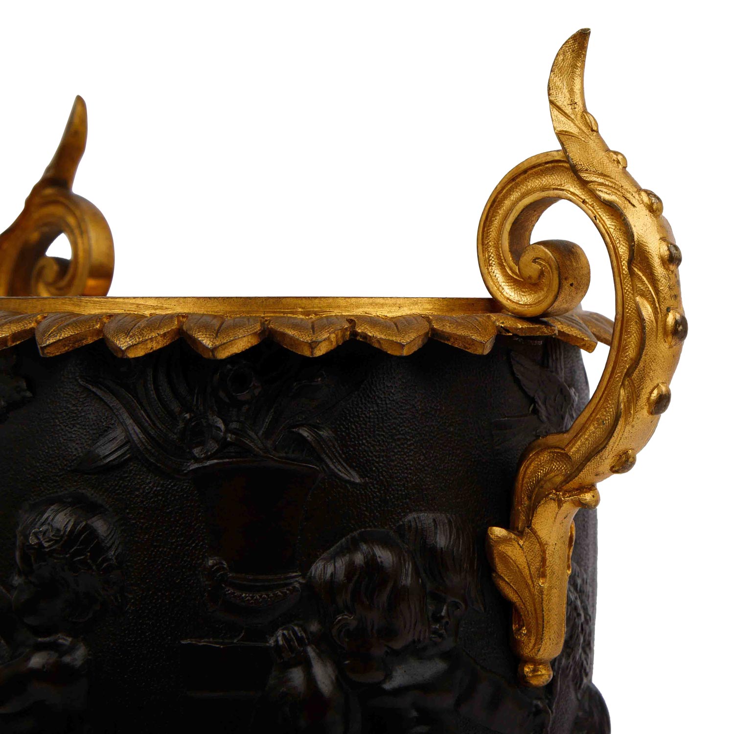Frankreich, Ende 19. Jh., patinierter und vergoldeter Bronze, Korpus aus patinierter Bronze, Wandung umlaufend mit spielenden Amoretten, seitlich mit vollplastischen Handhaben, Fußgestell aus vergoldeter Bronze, H: 43 cm. Alters-und Gebrauchsspuren.