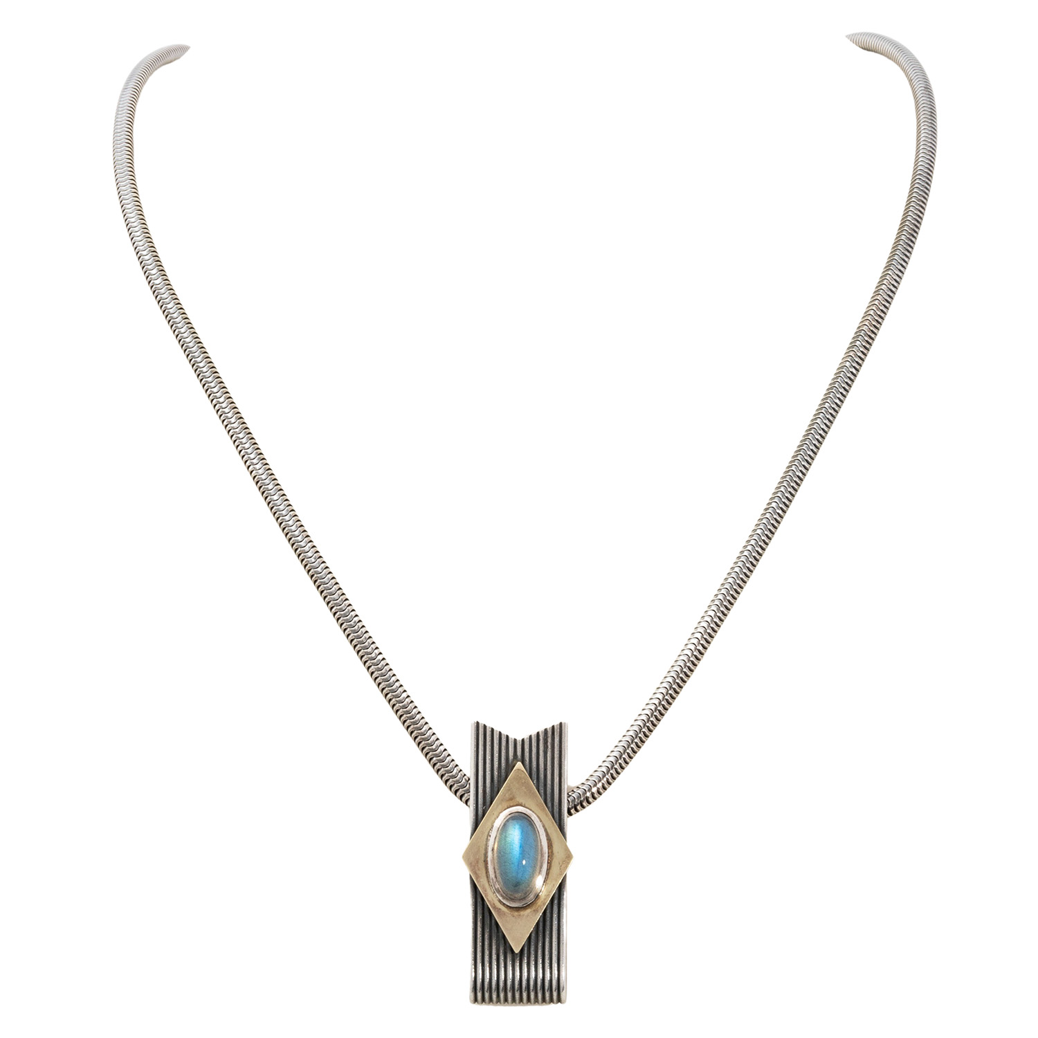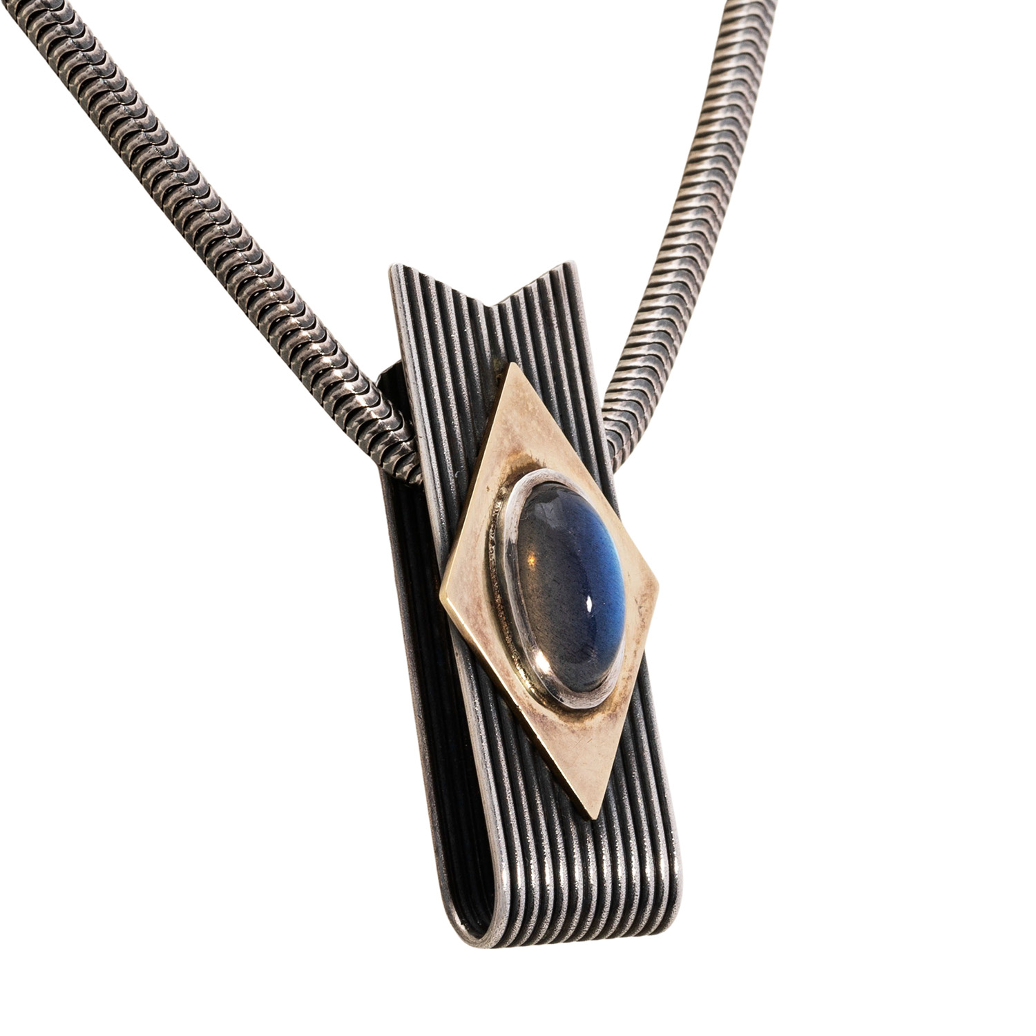 bestehend aus 2 Ringen und 1 Collier, Silber, tlw. mit Golddetails aus GG 18K, 60,6 g, Ring mit Lapislazulidreieck, RW: 60, 1 Ring mit facettiertem Prasiolithtropfen RW: 56, beide aus den 2010er Jahren, Schlangenkette L: 60 cm, Anhänger mit ovalem Labradorith von schöner Qualität, 1980-90er Jahre, Tragespuren, tlw. Handarbeit.