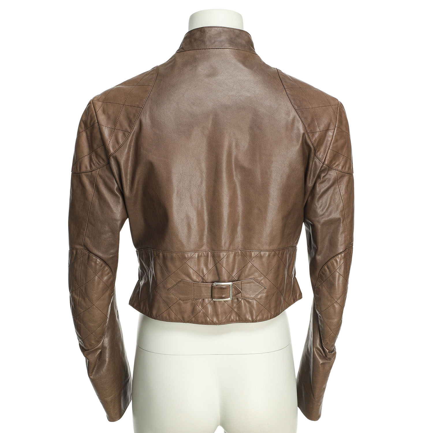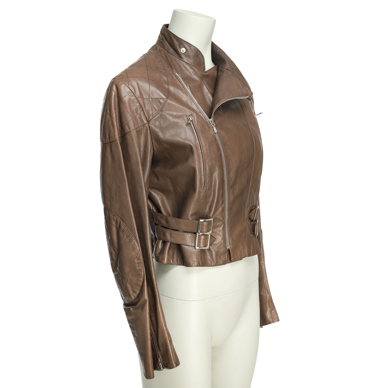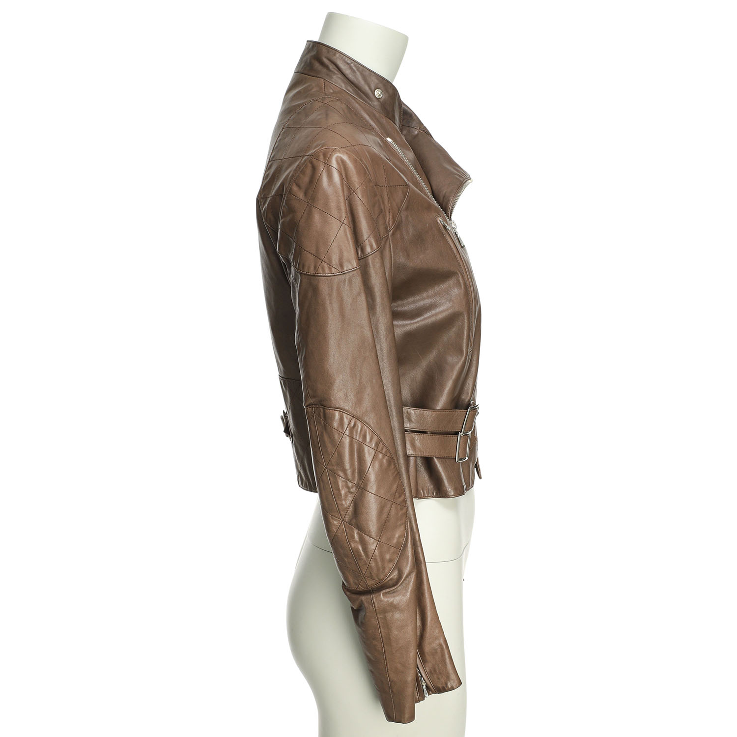 Kalbsleder. Schlammfarbenes Modell mit silberfarbener Hardware, Stehkragen, Riemen-Dekor und teilweise Diamantsteppung. Tragespuren vorhanden, Verfärbungen.