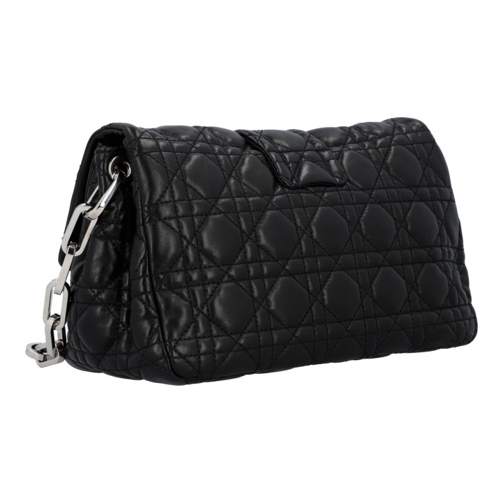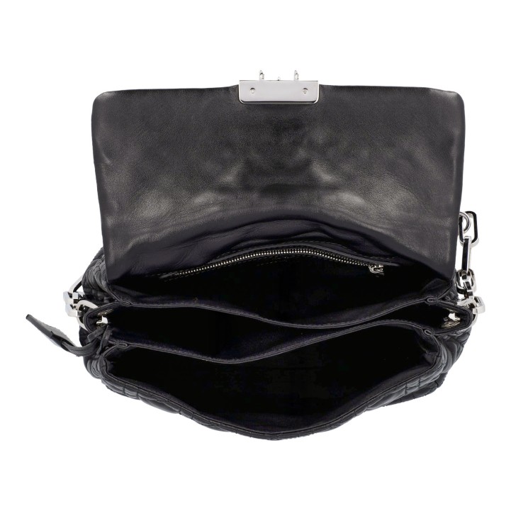 Koll. 2009. Feines Leder in Schwarz mit Cannage-Steppung und silberfarbener Hardware. Überschlag mit Steckverschluss, Gliederkettenriemen, Clochette mit Schlüssel, Hauptfach mit vier Innenfächern. Leichte Gebrauchsspuren vorhanden. 25x11x16cm.