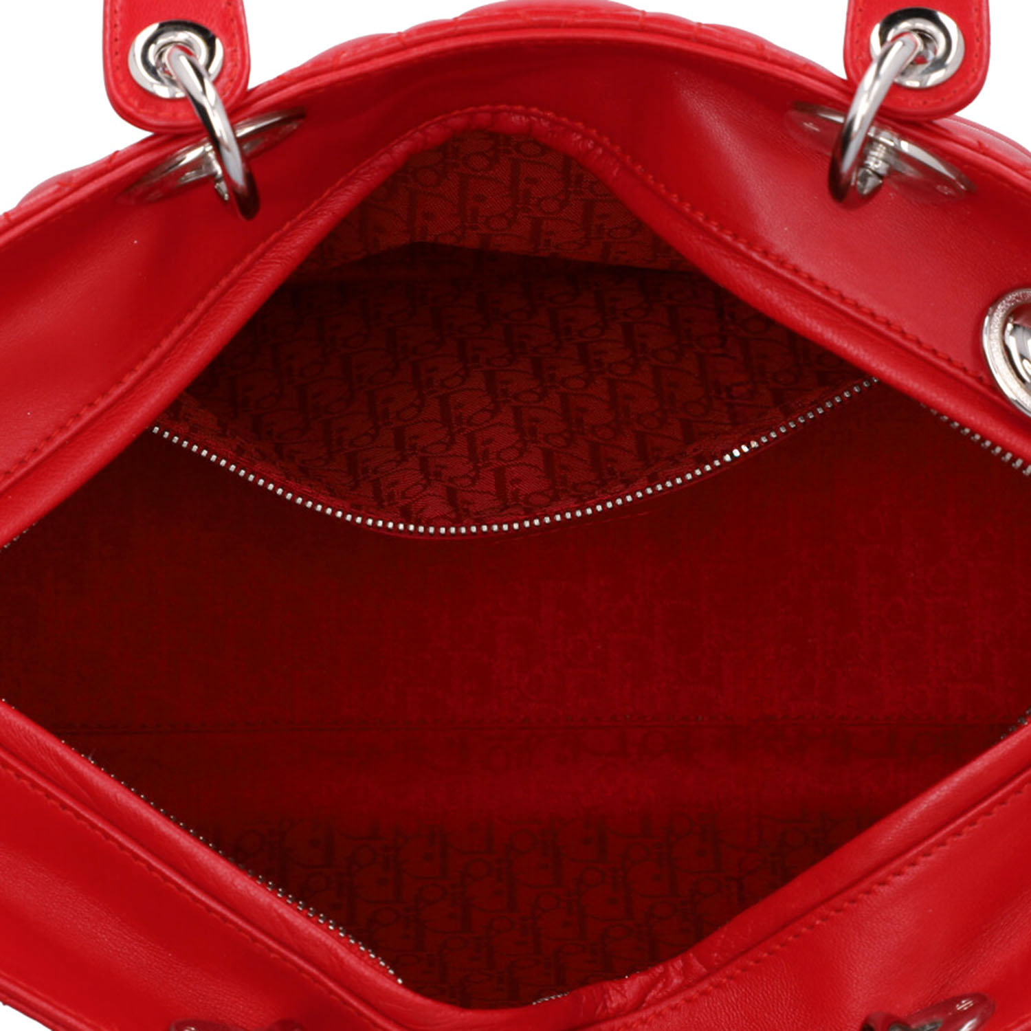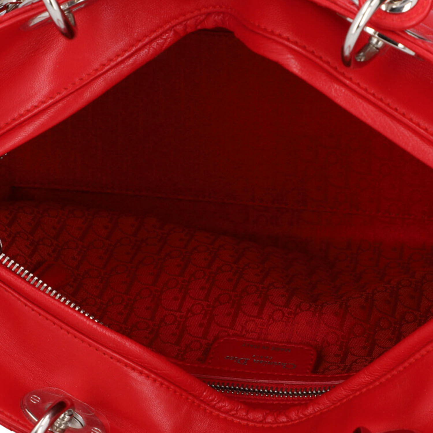 Rotes Cannage Lammleder mit goldfarbenen Metallbeschlägen, doppeltem Henkel, Reißverschluss, Logoanhänger und abnehmbarem Schulterriemen. Innen rotes Textil mit einem Reißverschlussfach. Gebrauchsspuren vorhanden. 32 x 12 x 25 cm.