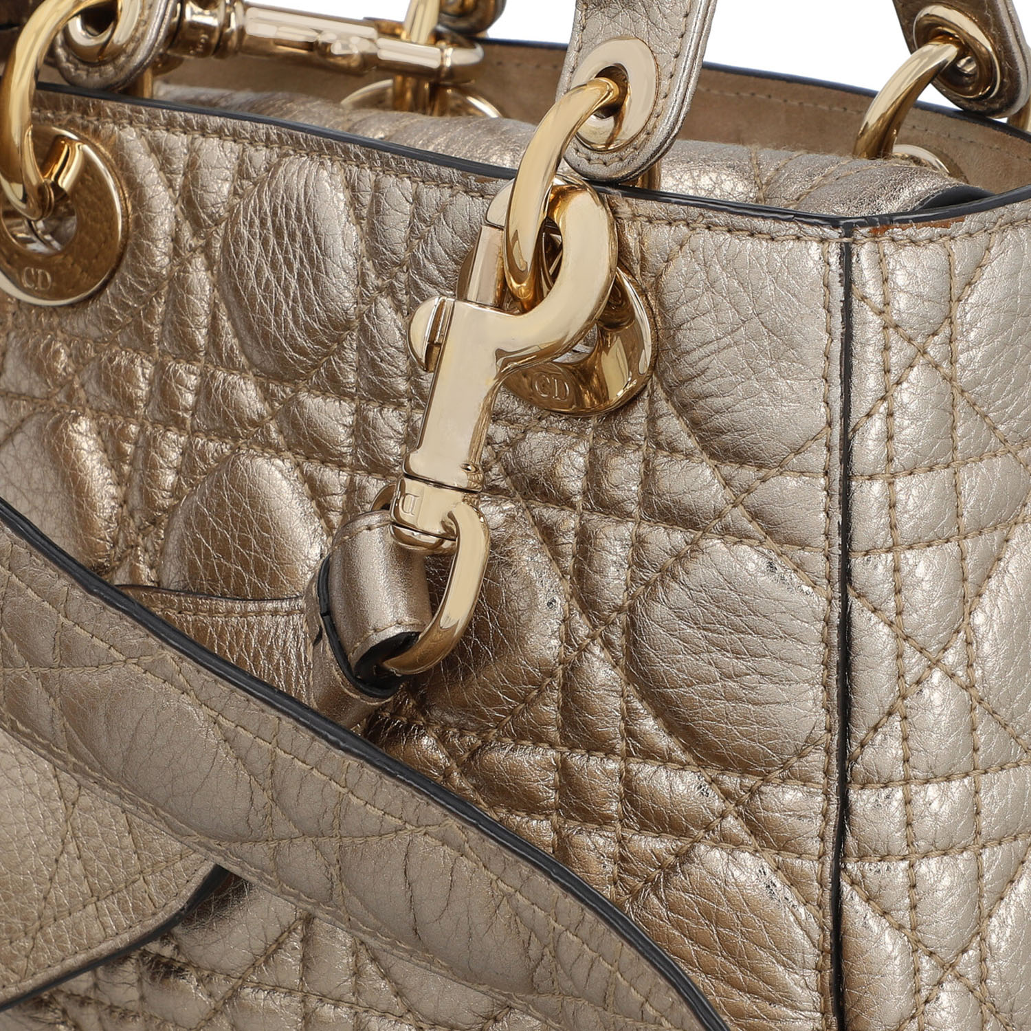 Goldfarbenes Leder mit Cannage-Steppung, golfarbener Hardware, Doppelhenkel, Überschlag als Verschluss und Logo-Anhänger. Innenraum aus Veloursleder mit zwei Fächern. Box, Staubbeutel, Rechnung und abnehmbarer Schulterriemen anbei. Gebrauchsspuren dezent vorhanden. 20 x 8,5 x 16,5 cm.
