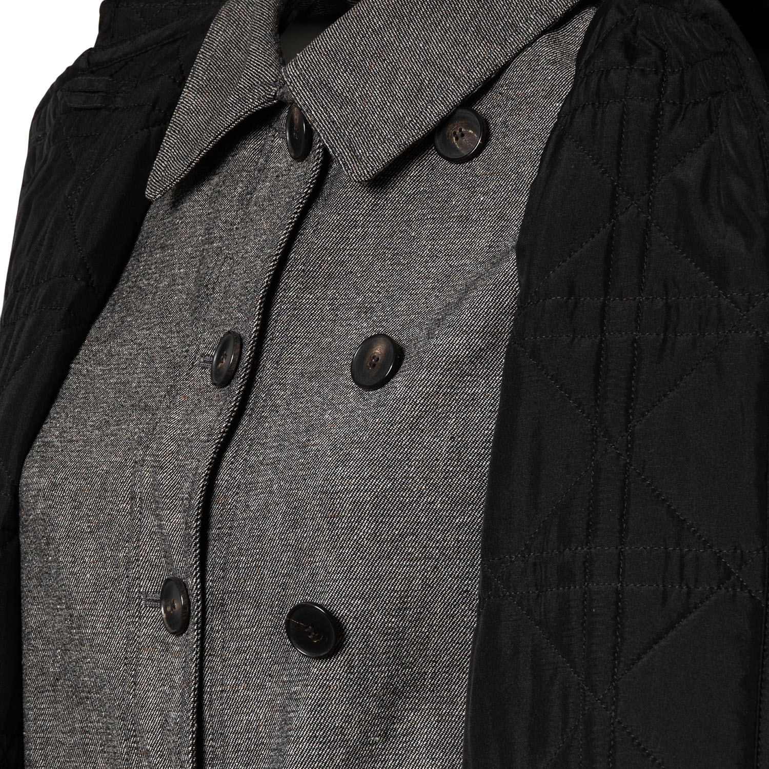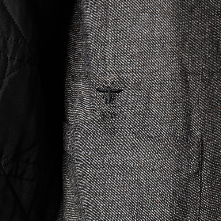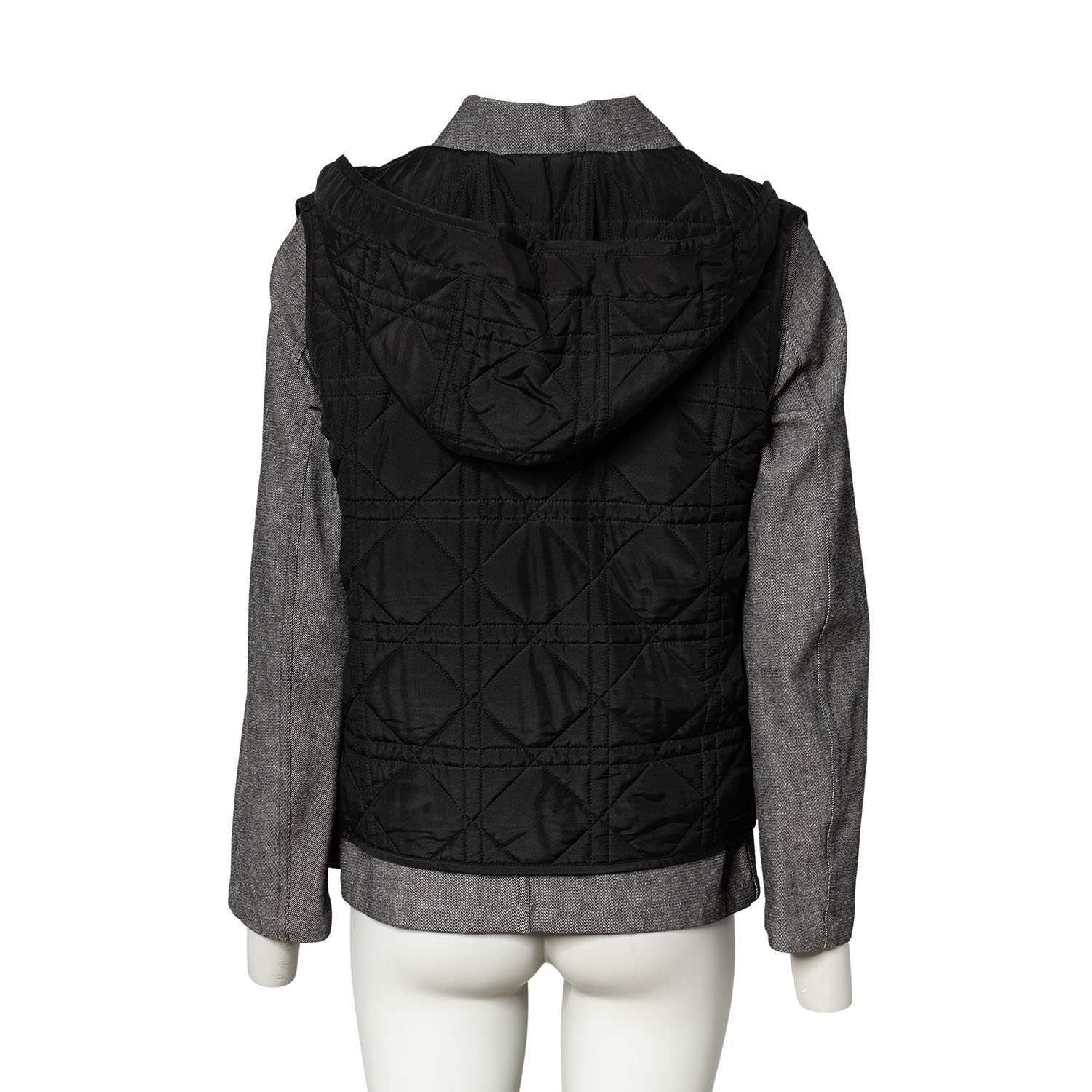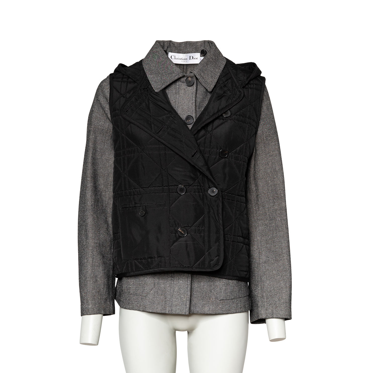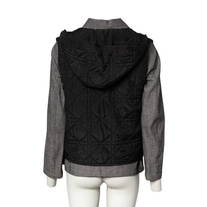 Graumeliertes Modell mit schwarzer Weste, Cannage-Steppung, Knopfverschluss und aufgesetzten Taschen. Tragespuren vorhanden.