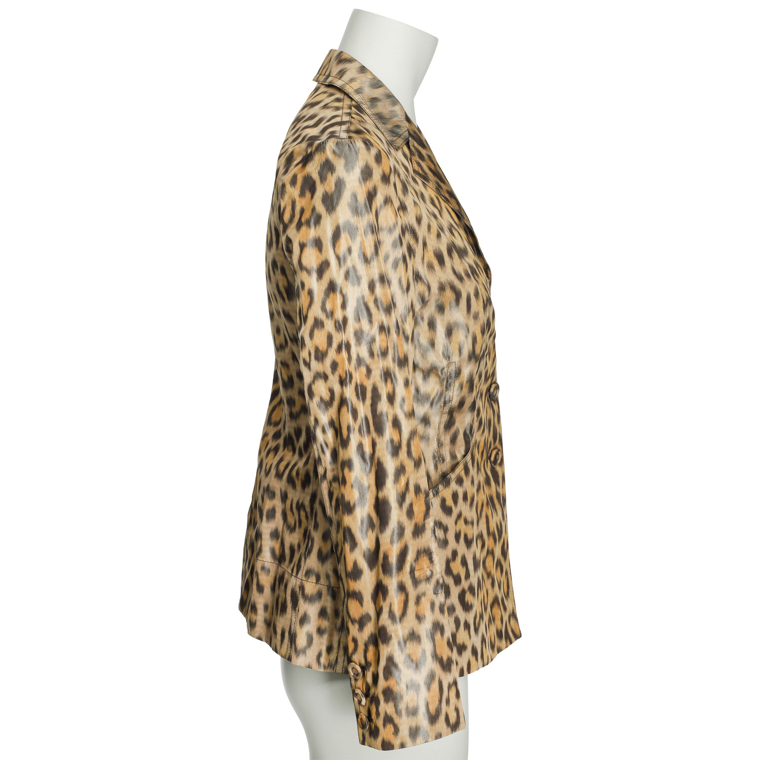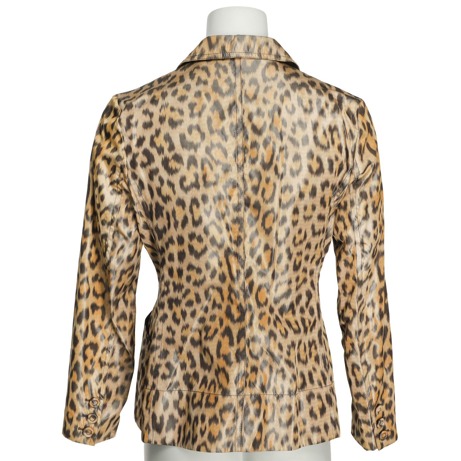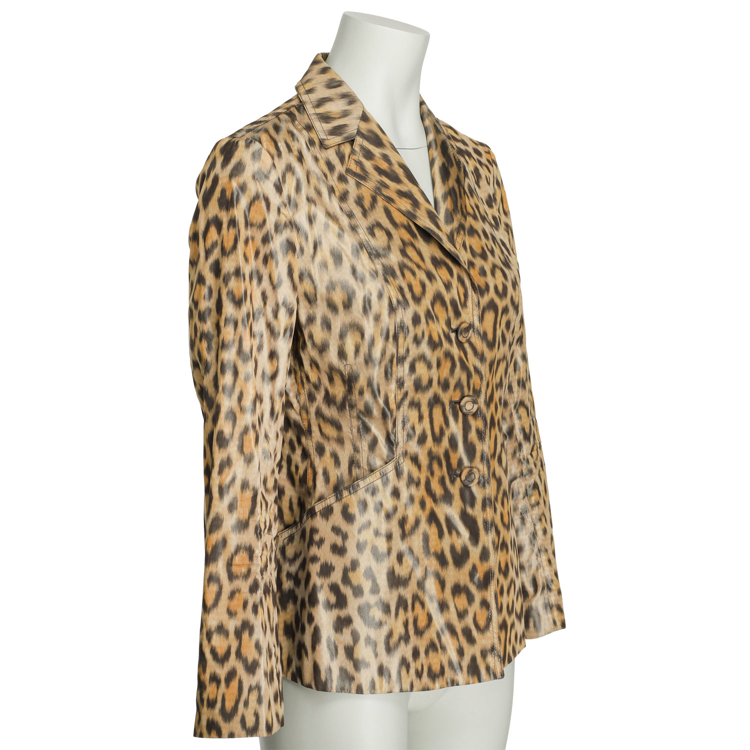 100% Seide. Leoparden Design mit Knopfverschluss, Eingrifftaschen, Reverskragen und Logo-Design innen am Saum. Tragespuren vorhanden.