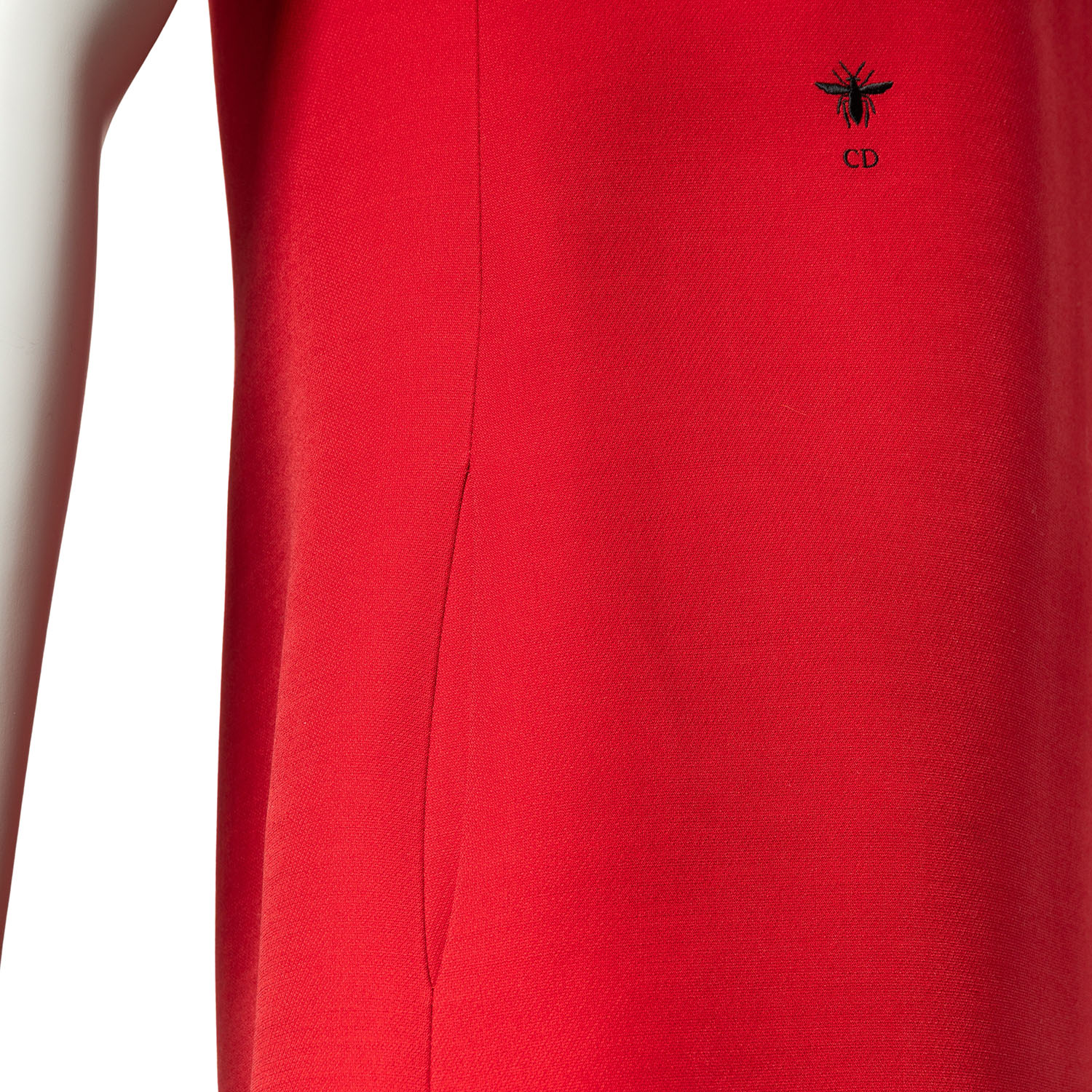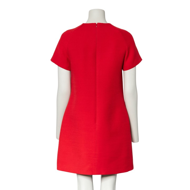 Wolle- und Seidegemisch. Rotes Etui-Modell mit Reißverschluss im Rückteil, kurzen Ärmeln, Bienen-Applikation und Eingrifftaschen. Tragespuren dezent vorhanden.