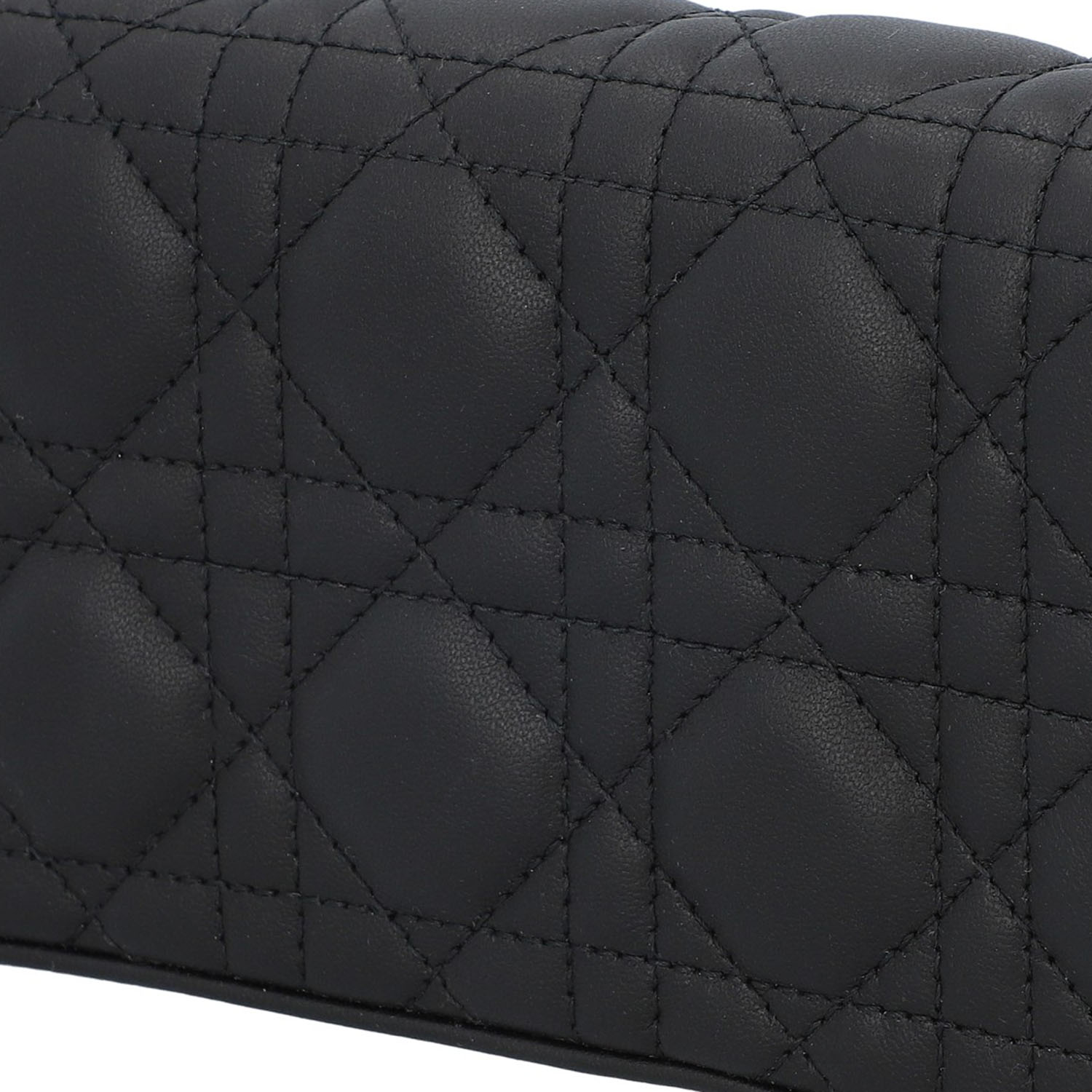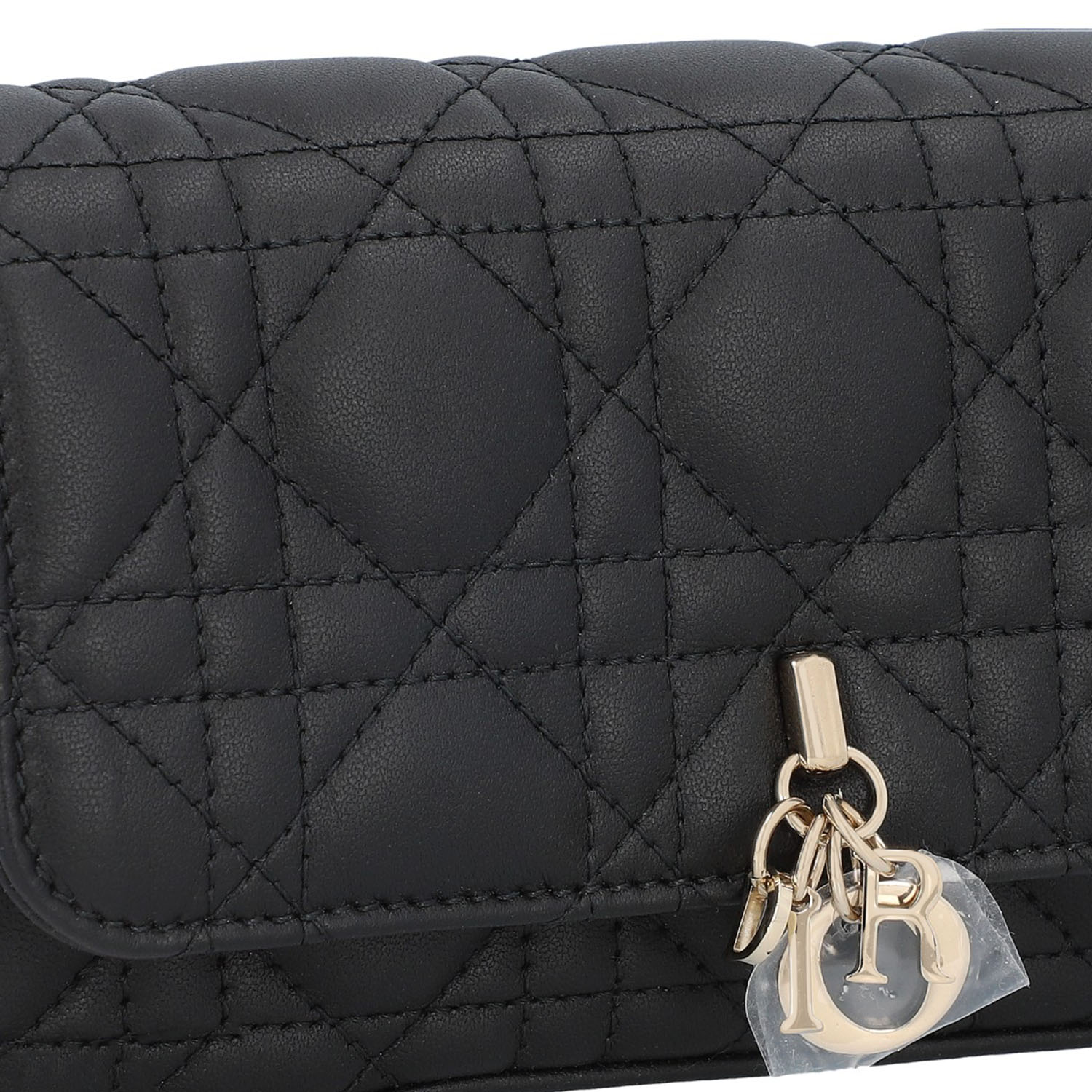 Schwarzes Cannage-Lammleder mit goldfarbener Hardware. Überschlag mit magnetischem Verschluss und Logo-Anhänger. Abnehmbarer Kettenriemen mit Kunstperlen-Dekor.