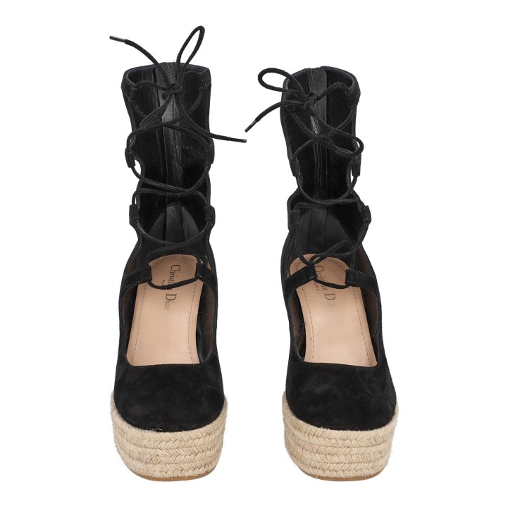 Espadrilles aus schwarzem Wildleder mit runder Zehenpartie, Reißverschluss an der Ferse und Schnürung vorne. Keilabsatzhöhe ca. 9,5 cm. Box und Staubbeutel anbei. Tragespuren vorhanden.