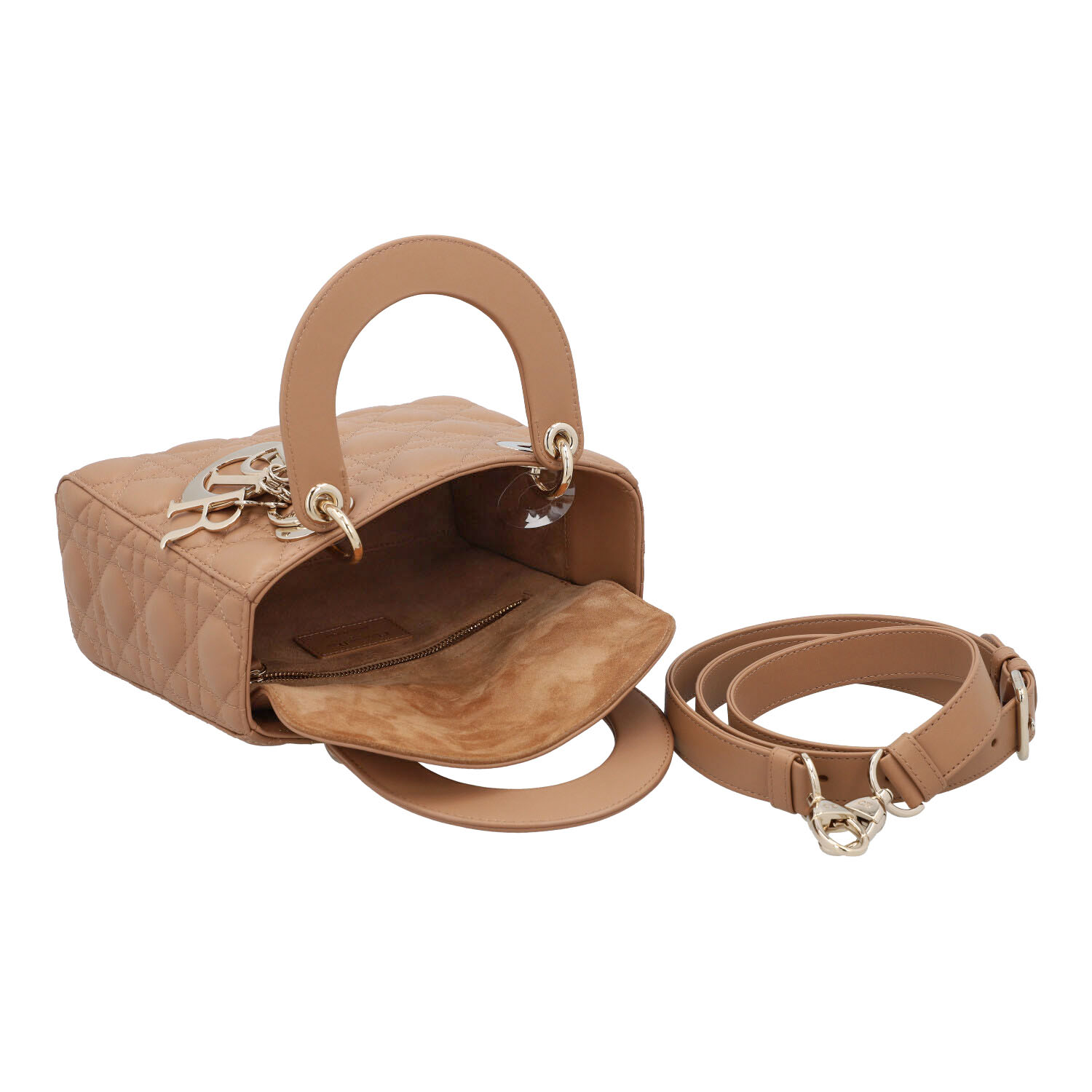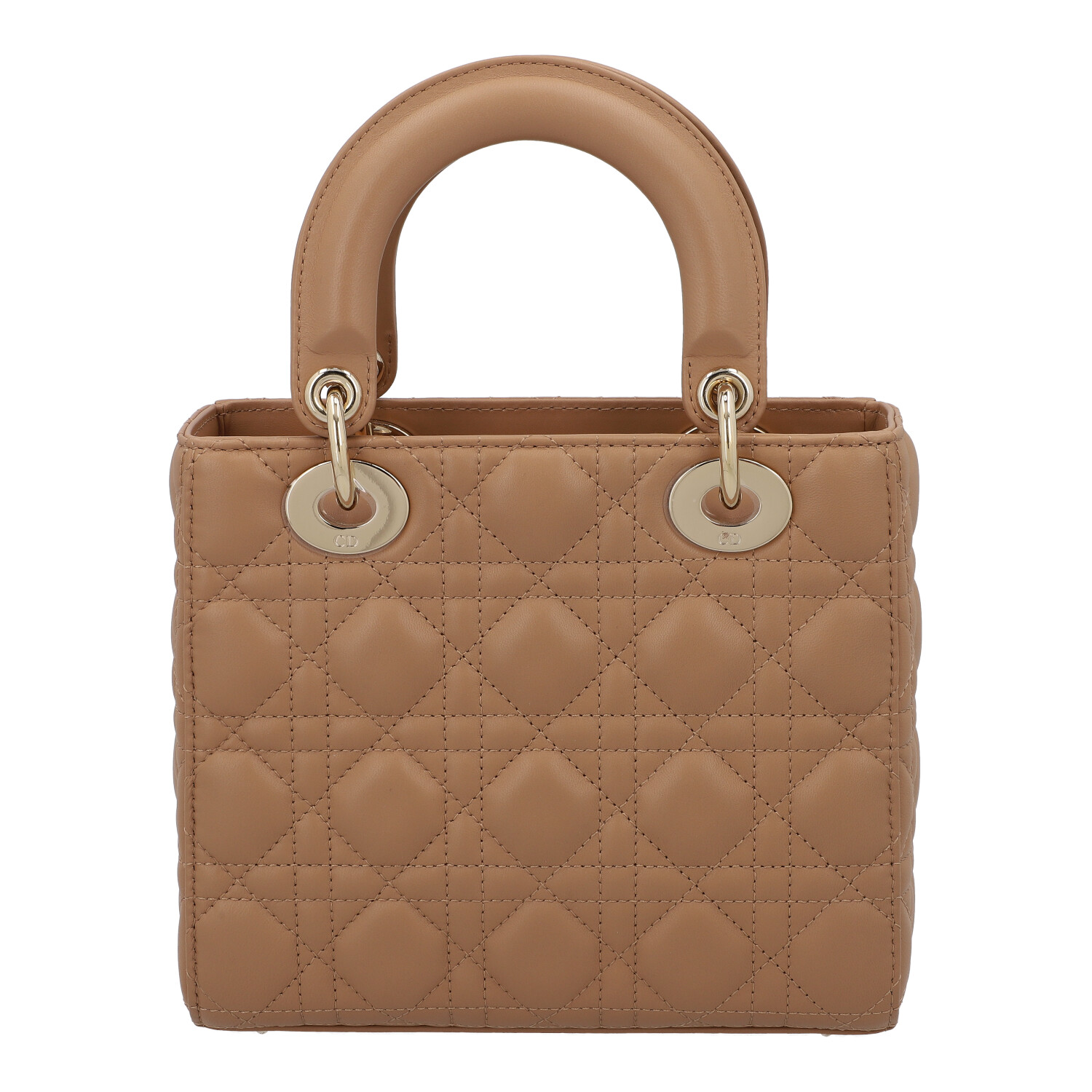 Cannage Lammleder in Medium Tan (karamell) mit goldfarbener Hardware, Doppelhenkel, Logo-Anhänger und abnehmbarer Schulterriemen. Innenraum aus Veloursleder mit einem Reißverschlussfach. Box, Staubbeutel, Karte und Rechnung (Breuninger) anbei. Minimaler Abrieb an den Kanten. 20 x 8 x 18 cm.