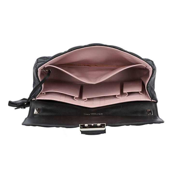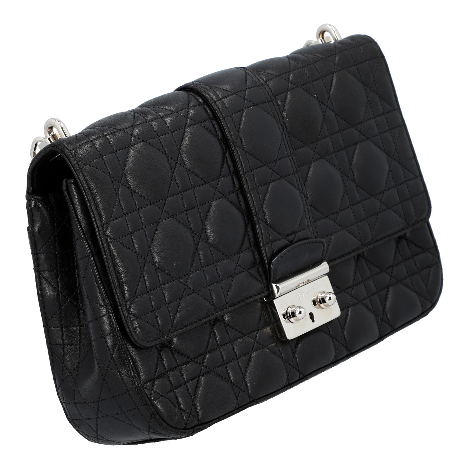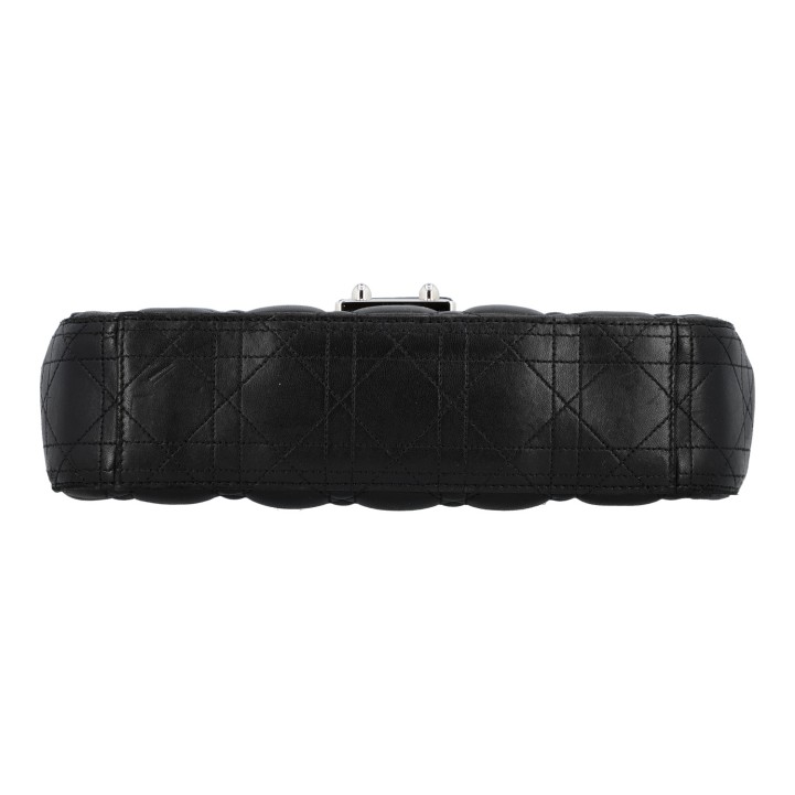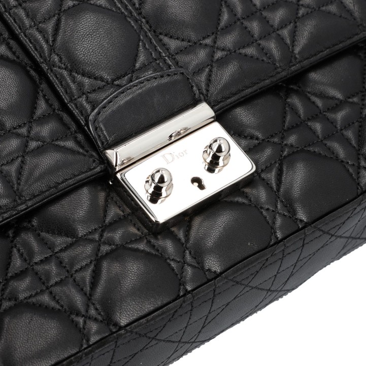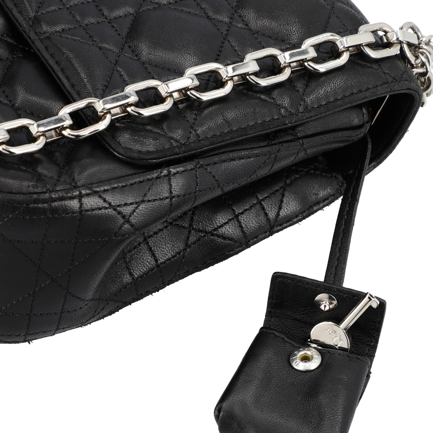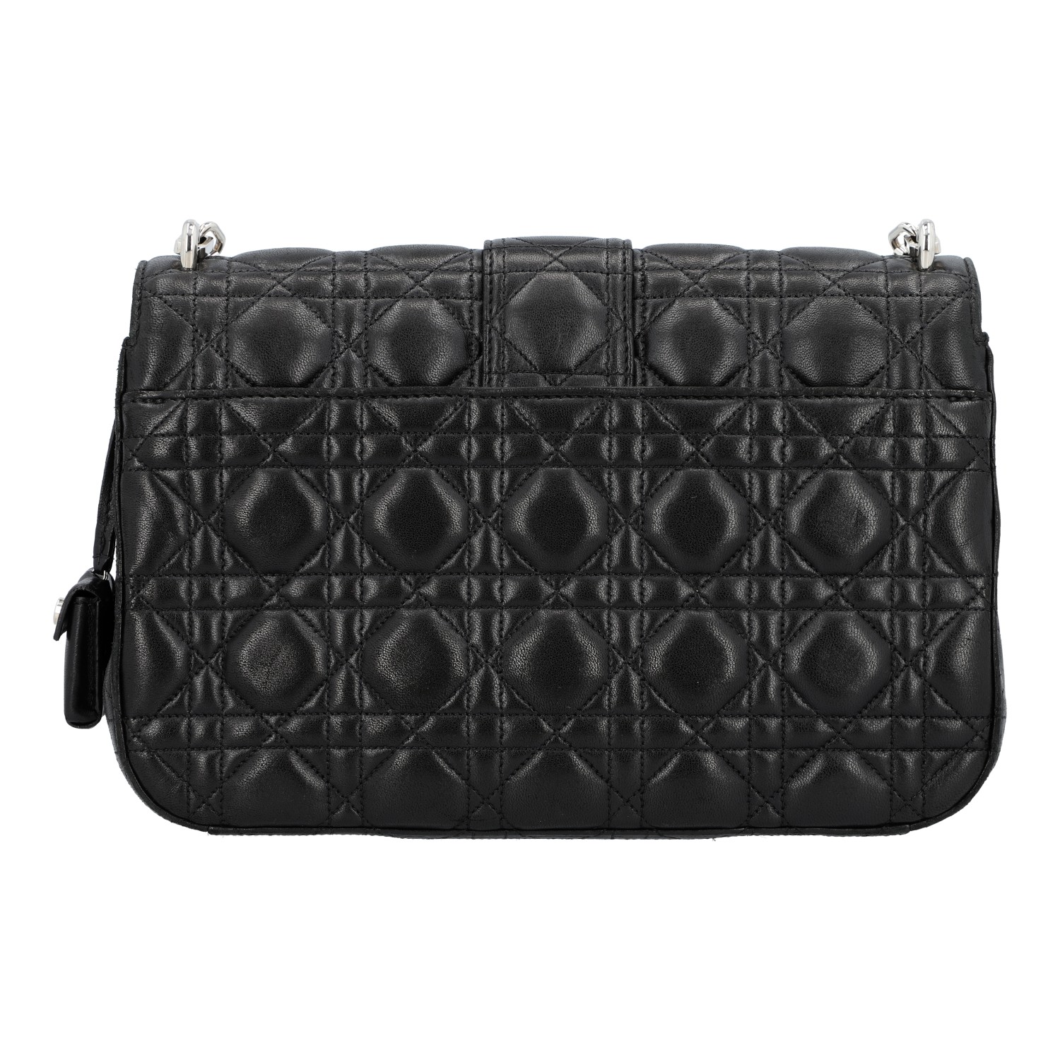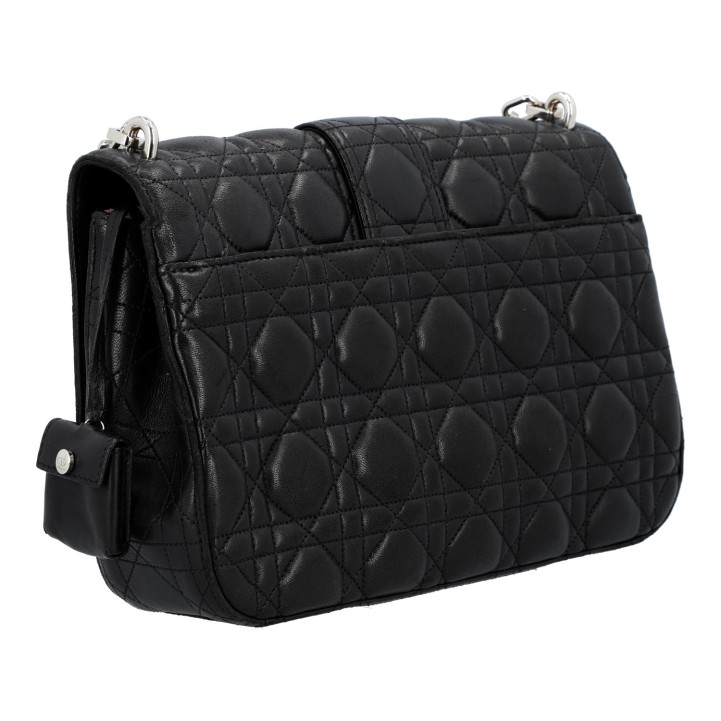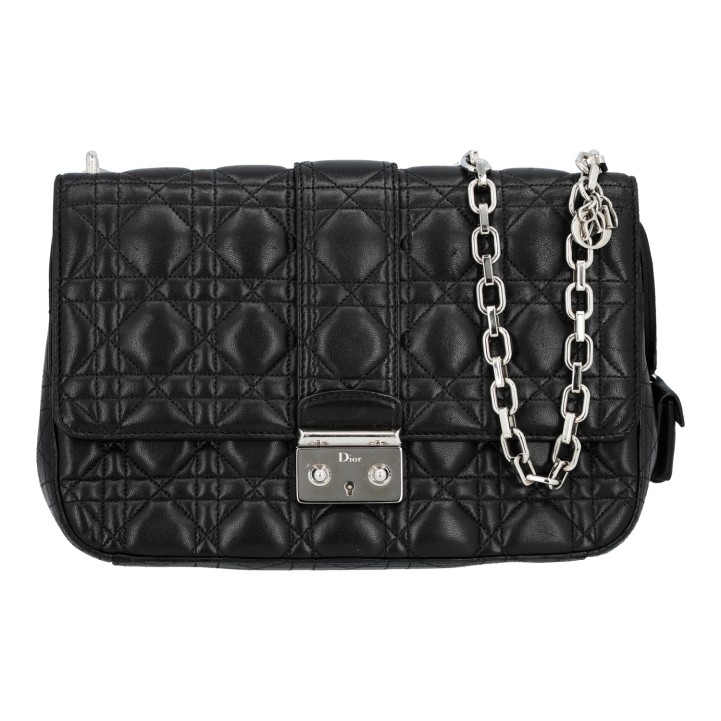 Koll. 2012. Fein genarbtes Leder in Schwarz mit klassischer Cannage-Steppung und silberfarbener Hardware. Überschlag mit Steckverschluss, Innenfutter in Rosa mit diversen kleinen Fächern. Gliederkettenriemen. Clochette mit Schlüssel anbei. Tragespuren Innen sowie Außen vorhanden, Abrieb und leichte Flecken. 26x6,5x17cm.