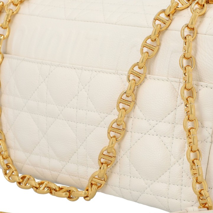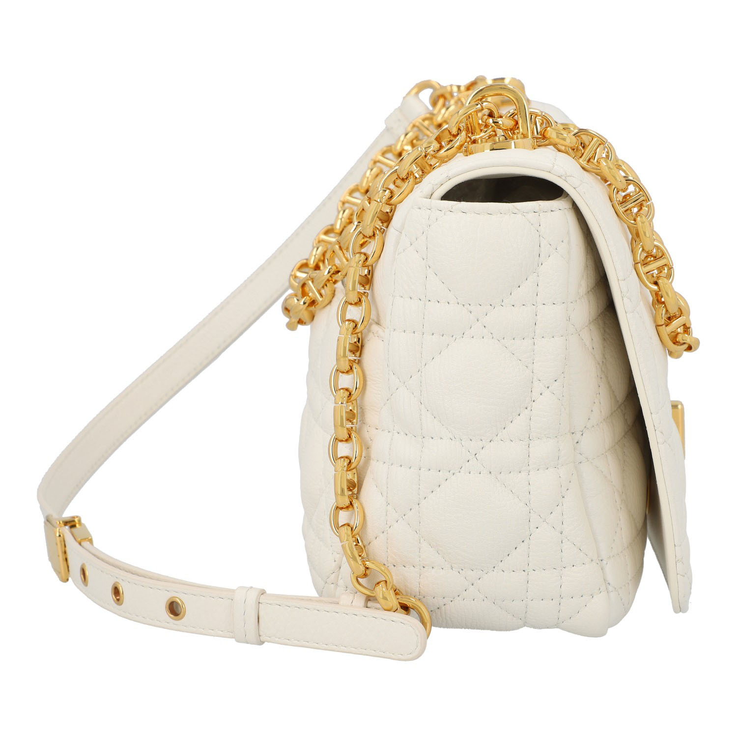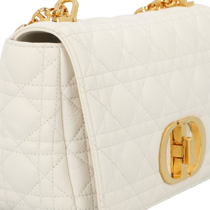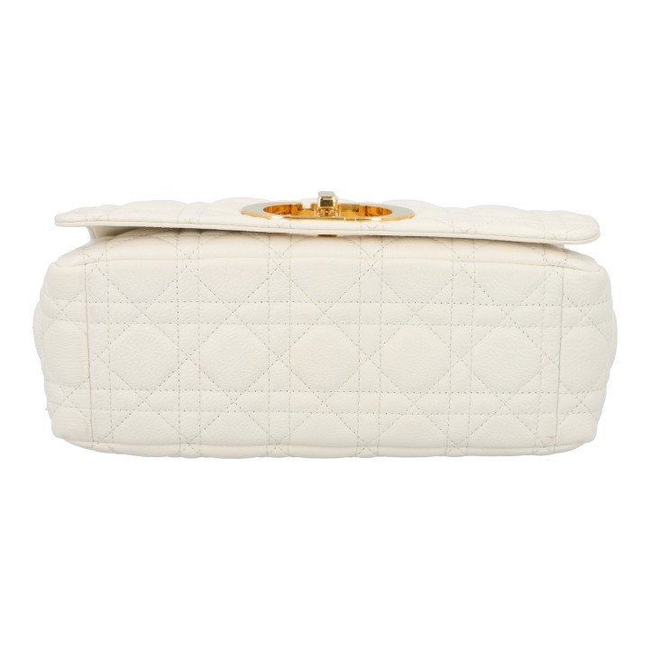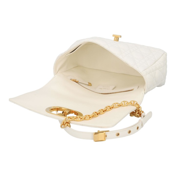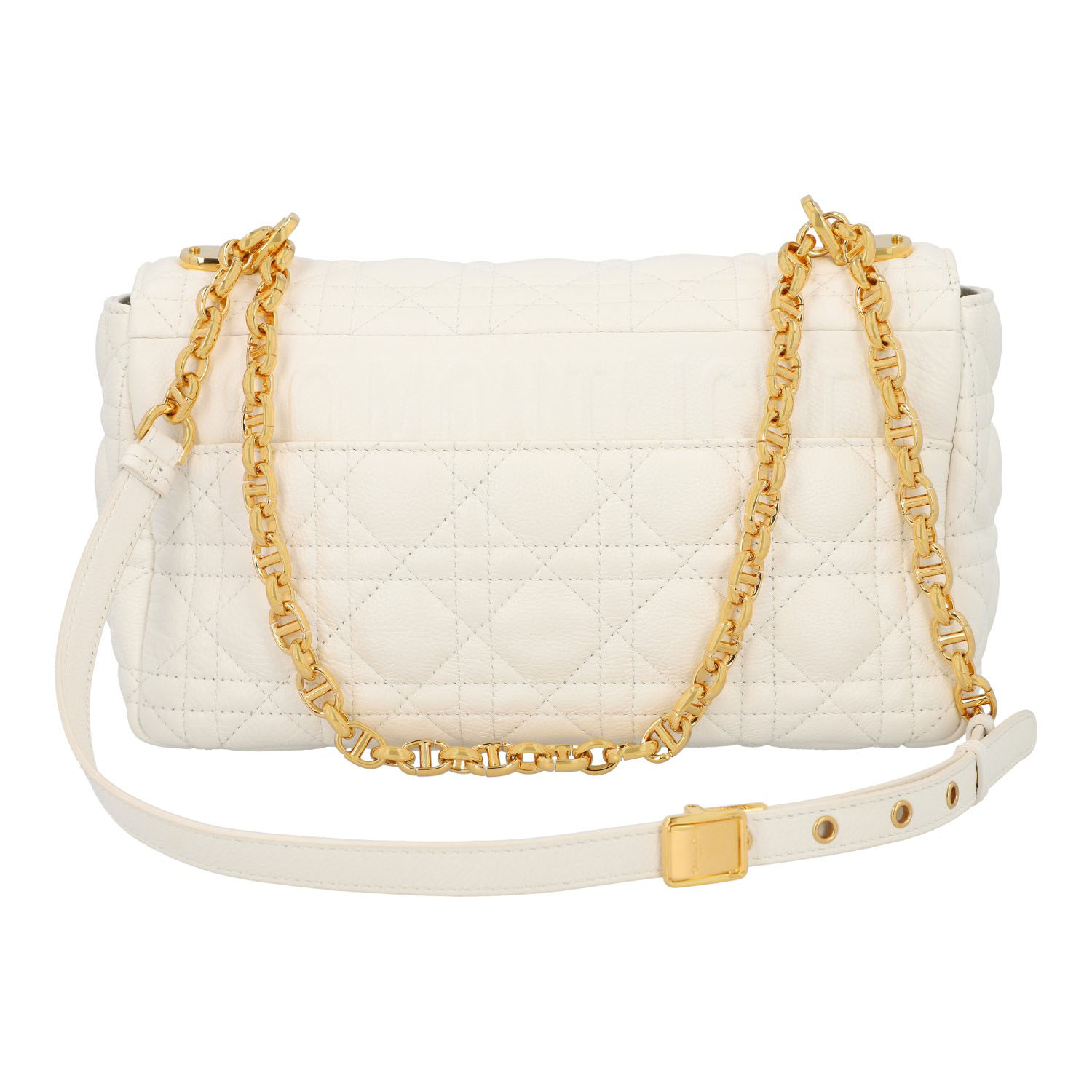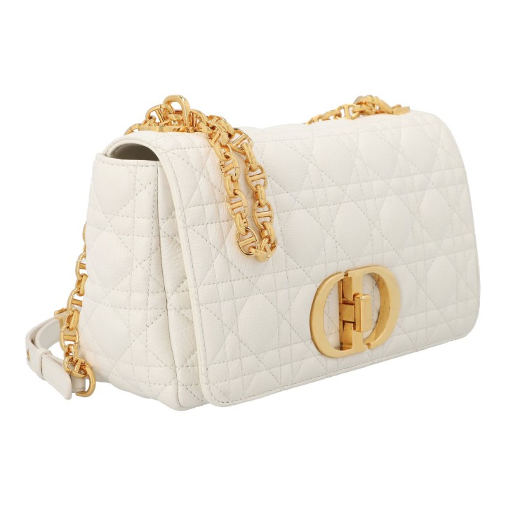 Koll. 2023. NP.: 3.950,-€. Fein genarbtes Leder in Weiß mit Cannage Steppung und goldfarbener Hardware. Überschlag mit CD-Drehverschluss, Innenfutter aus Leder. Leichte Gebrauchsspuren vorhanden. Rechnung anbei. 25x9x15cm.