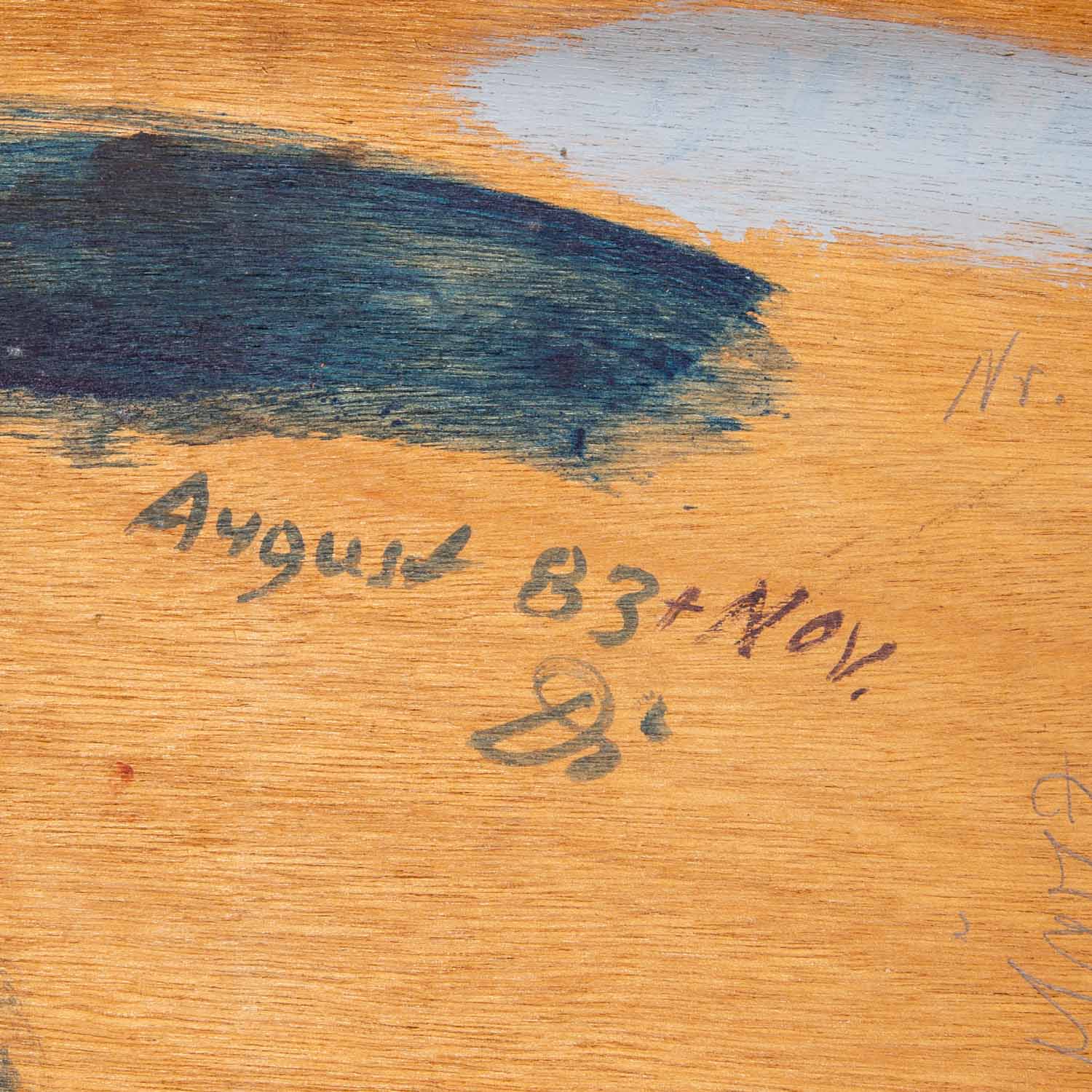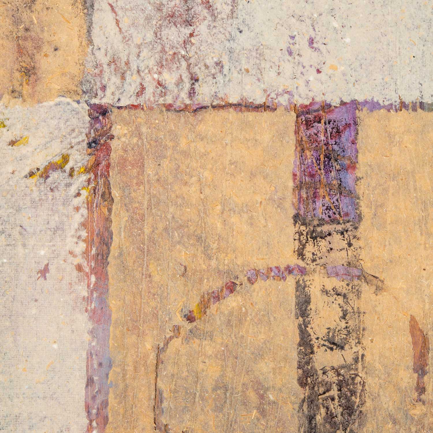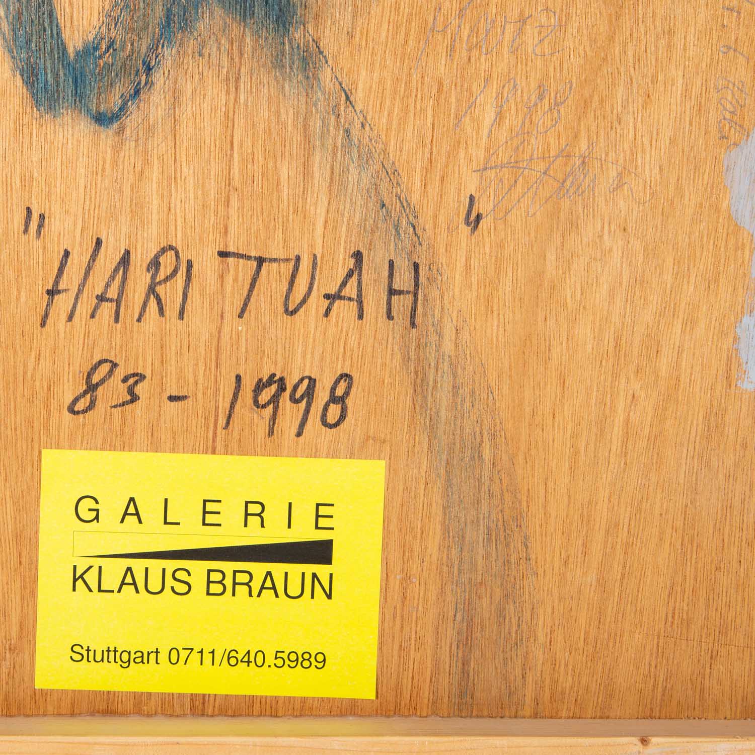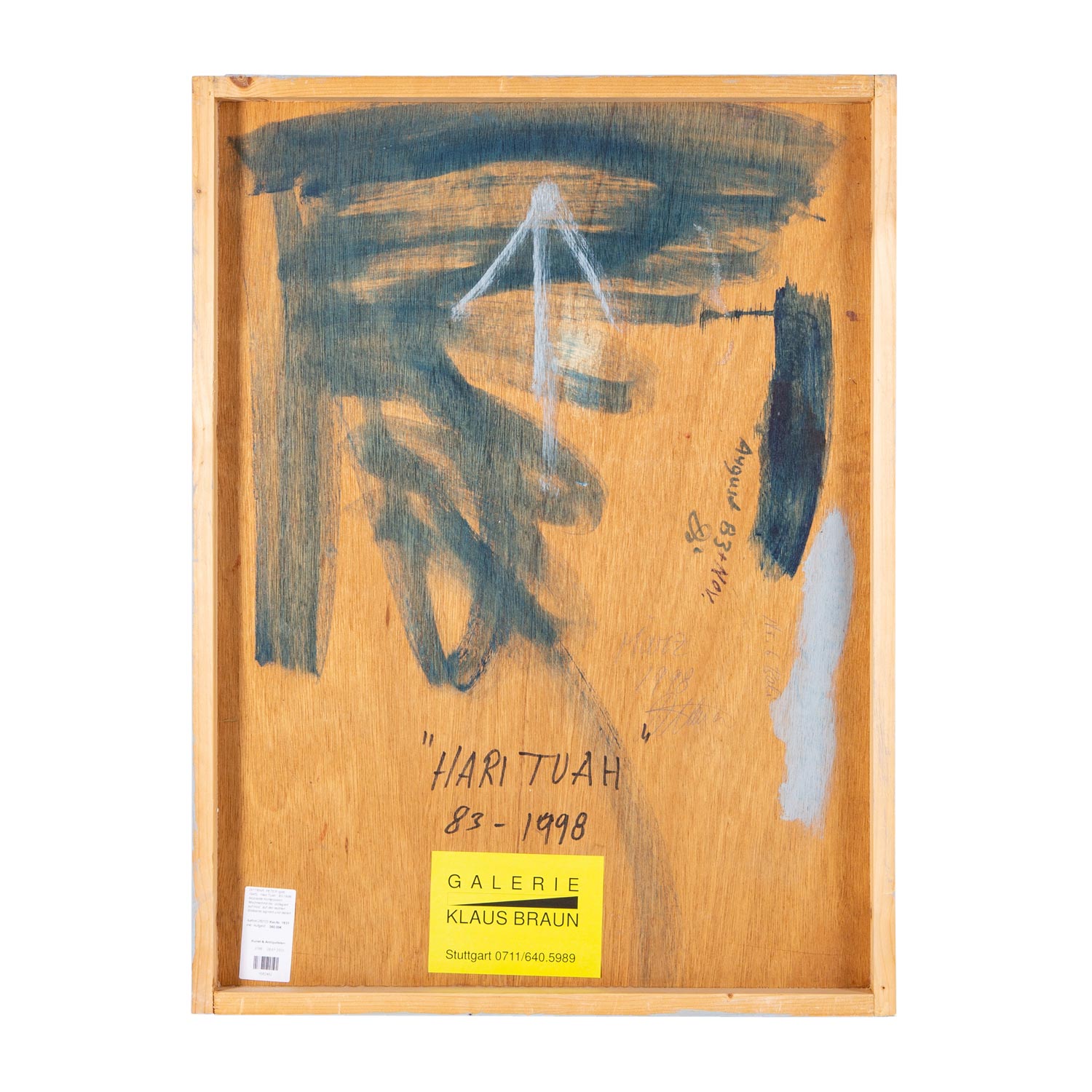 Abstrakte Komposition, Mischtechnik tlw. collagiert auf Holz, auf der rechten Bildkante signiert und datiert (19)98, rückseitig signiert, betitelt und datiert `Hari Tuah, 83-1998´, HxB: ca. 80x60 cm. Leichte Altersspuren. VERSO Etikett Galerie Klaus Braun, Stuttgart.