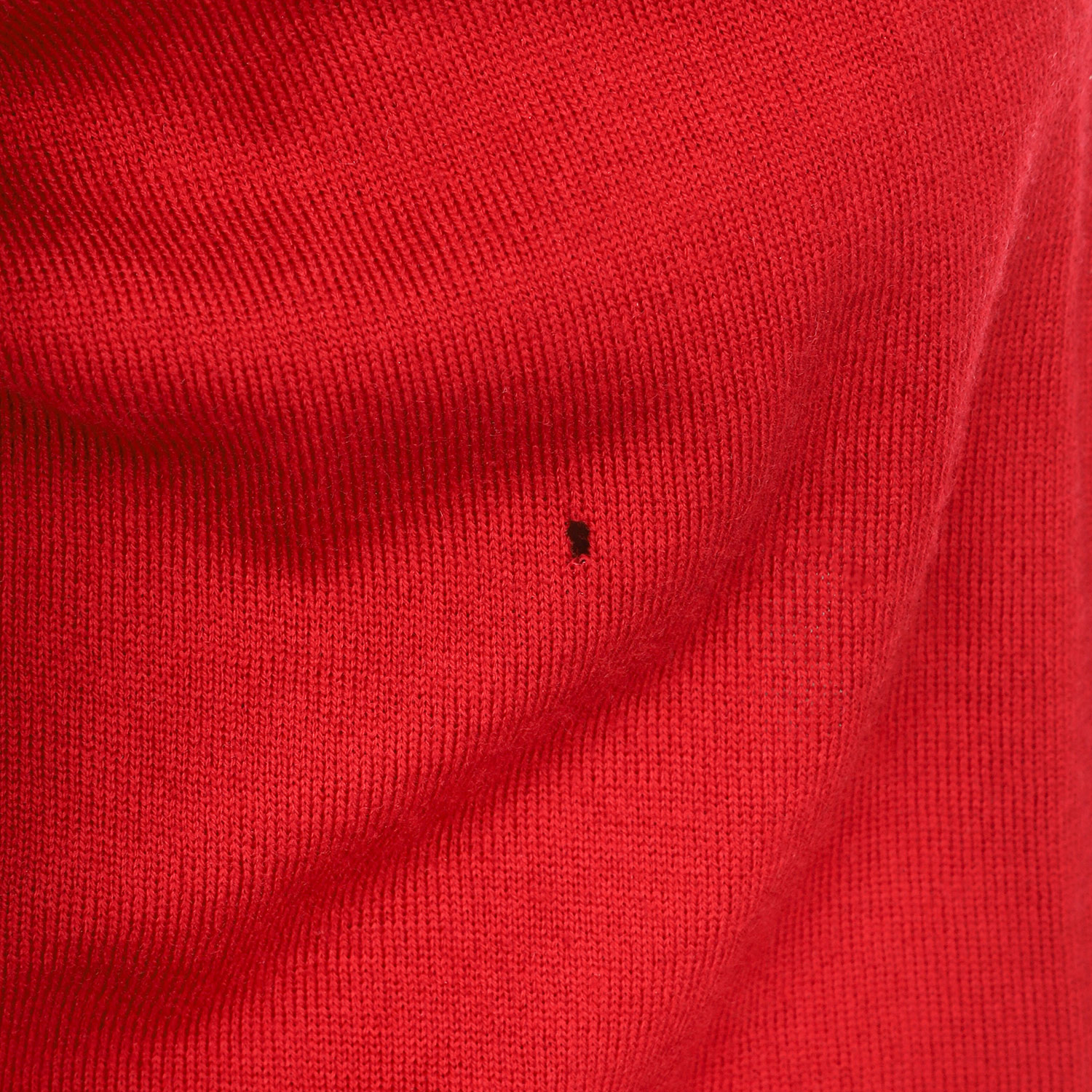 Rotes Modell mit dekorativem Knopfverschluss und leichten Puffärmeln. Loch auf der Front, Tragespuren vorhanden.
