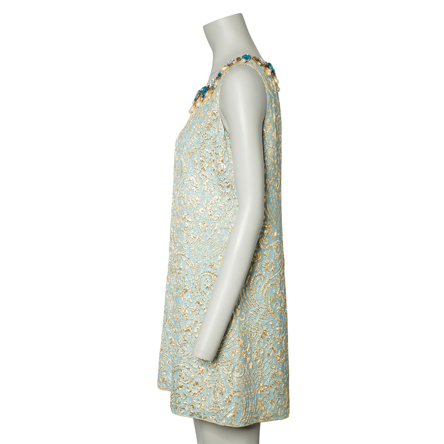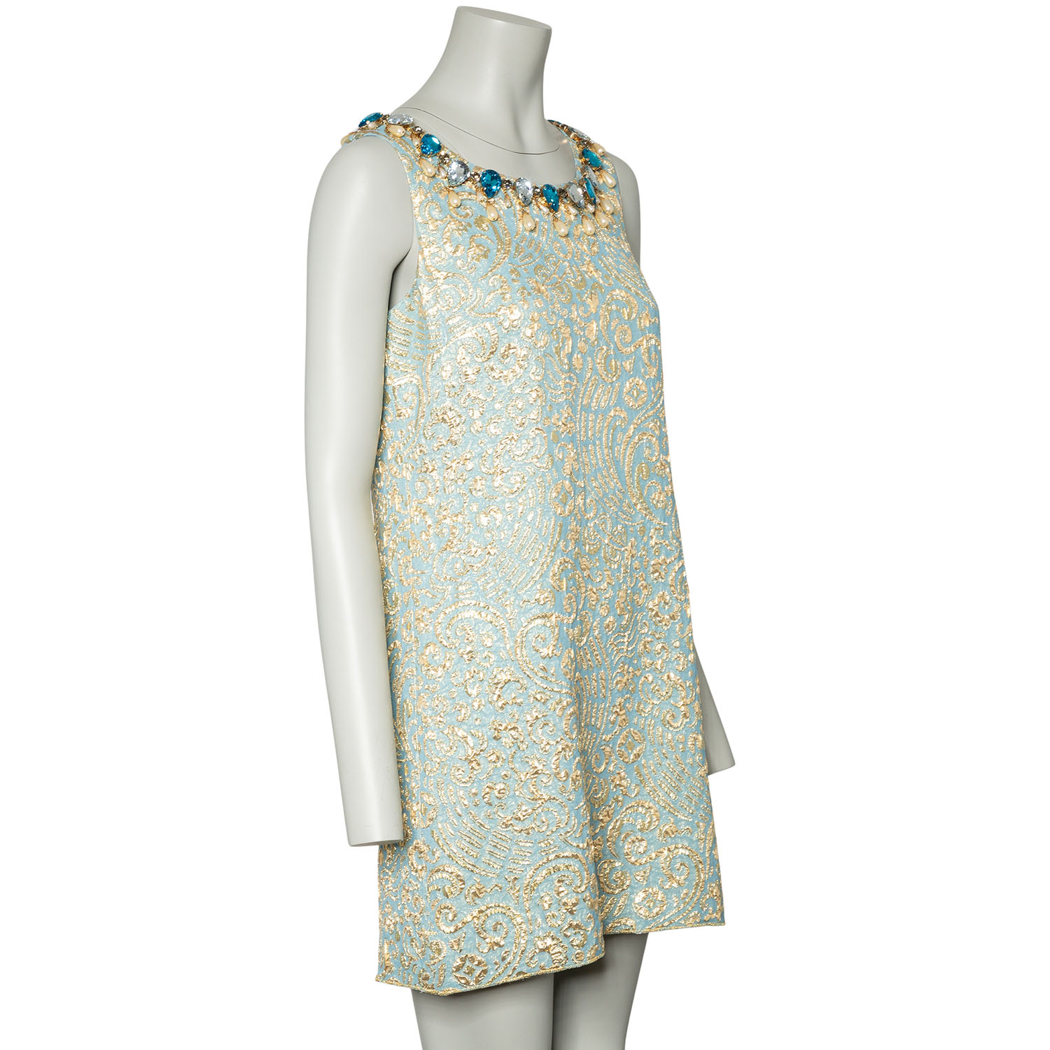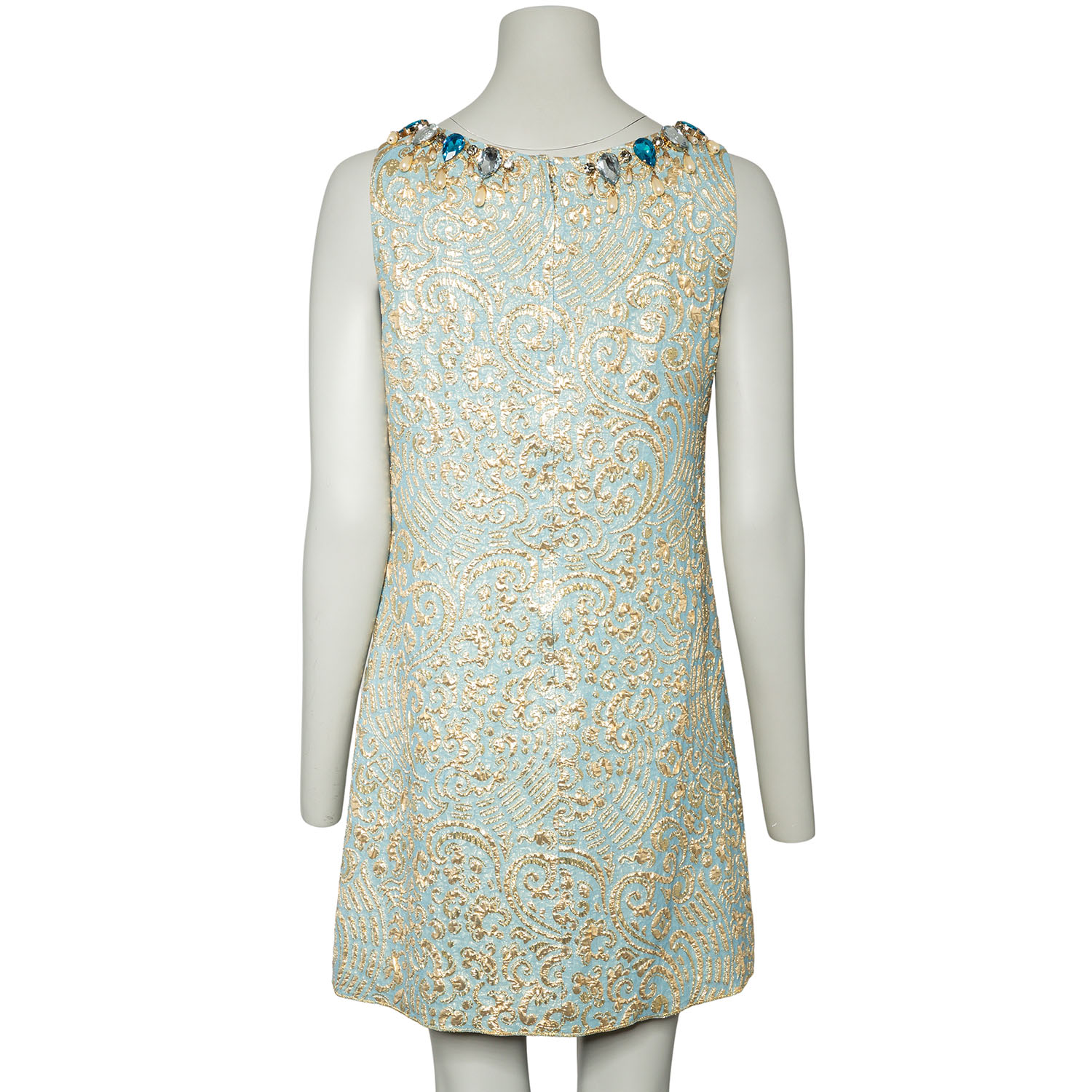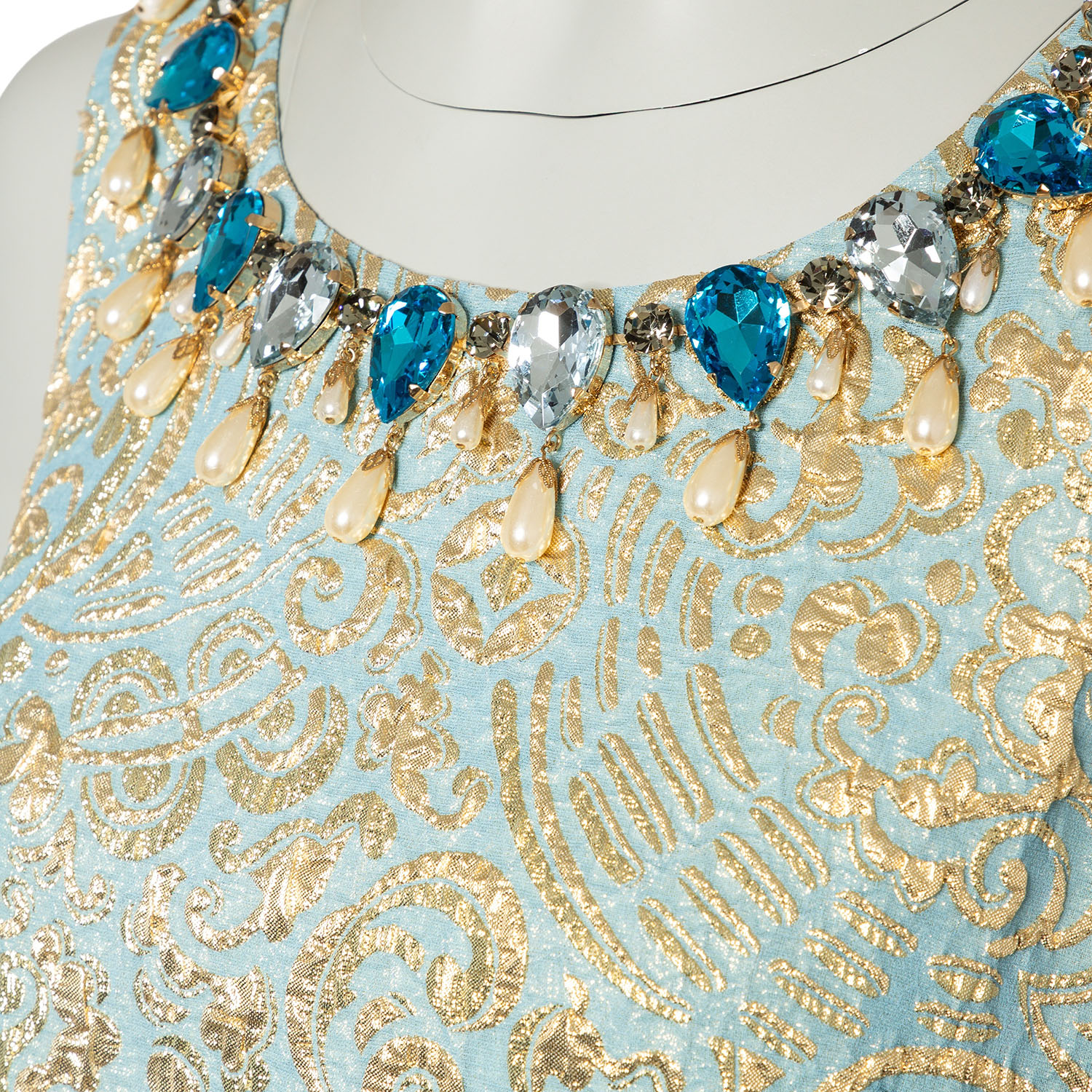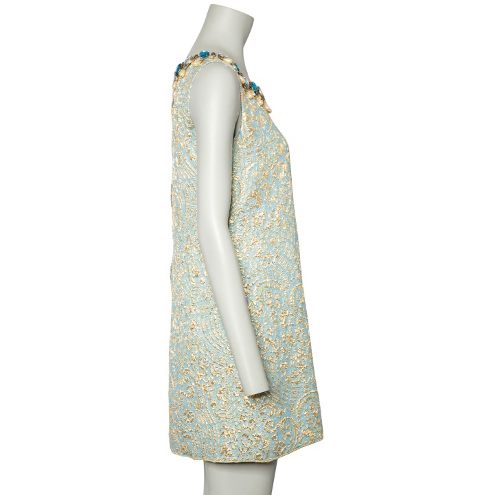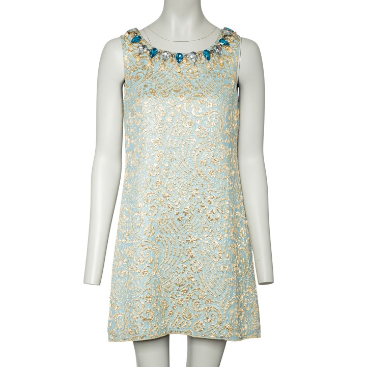 Hellblaues Brokat-Kleid mit goldfarbener Musterung. Ausschnitt mit dekorativer Kunststein- sowie Kunstperlen Applikationen. Guter Erhalt.