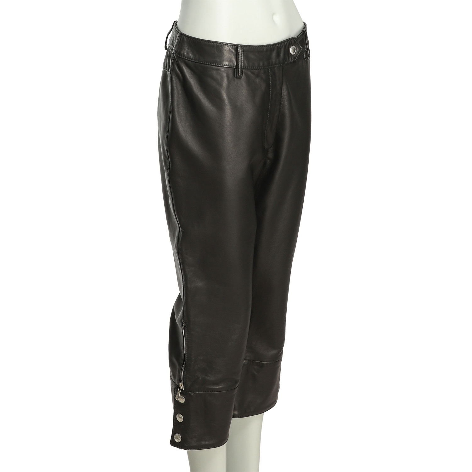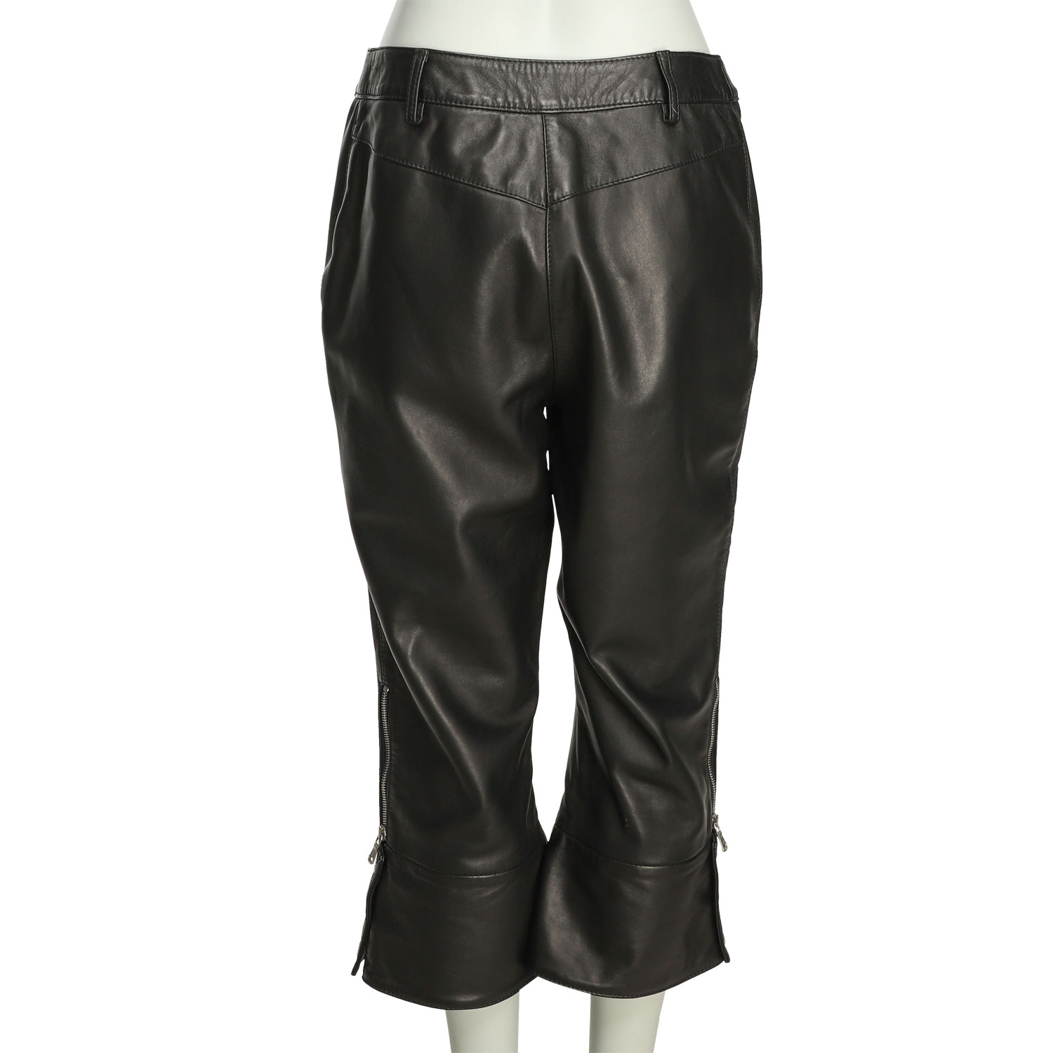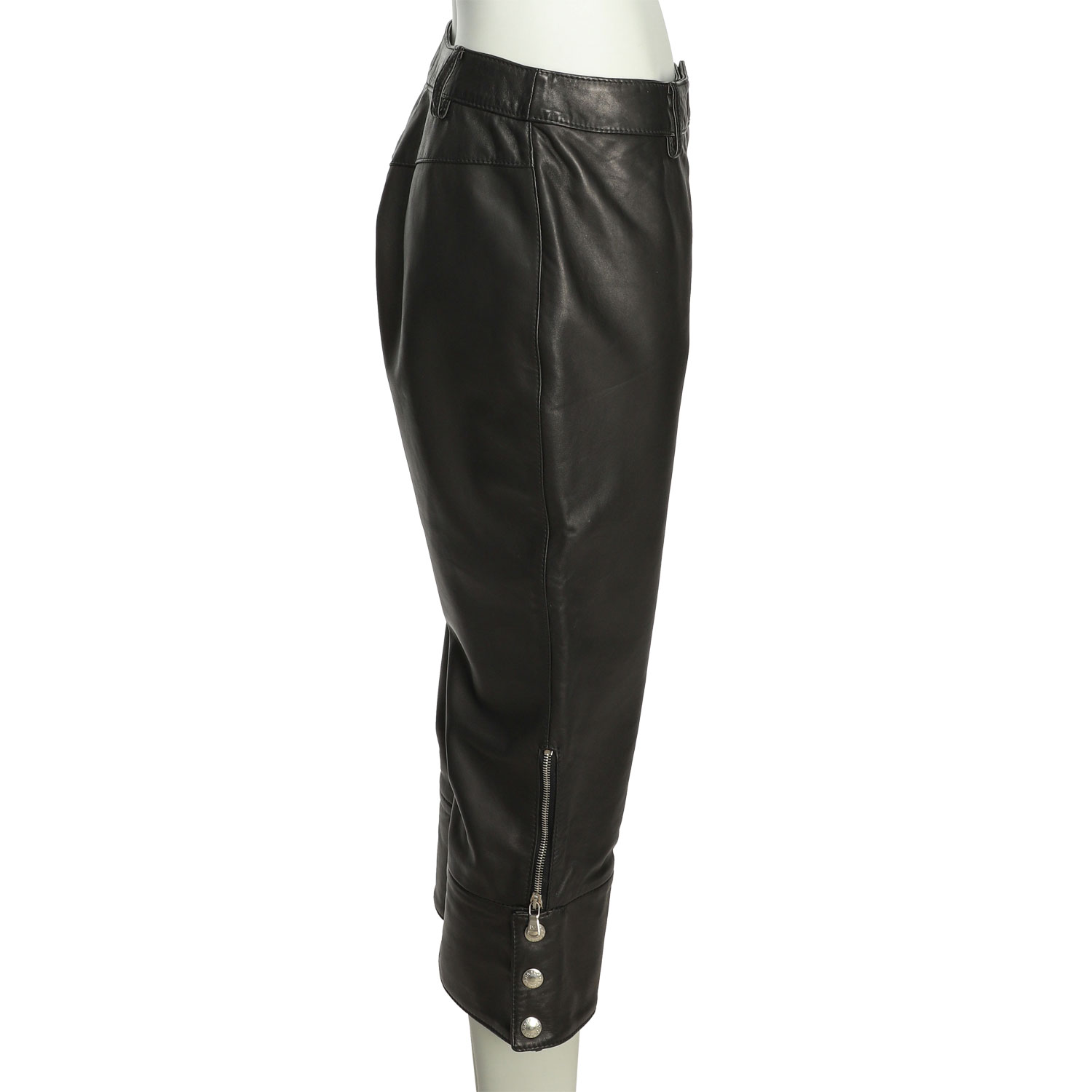 Capri Modell aus schwarzem Lammleder mit silberfarbener Hardware, aufgesetztem Bund, Knopf- und Reißverschluss, Druckknopfdetails und Gürtelschlaufen. Tragespuren vorhanden.