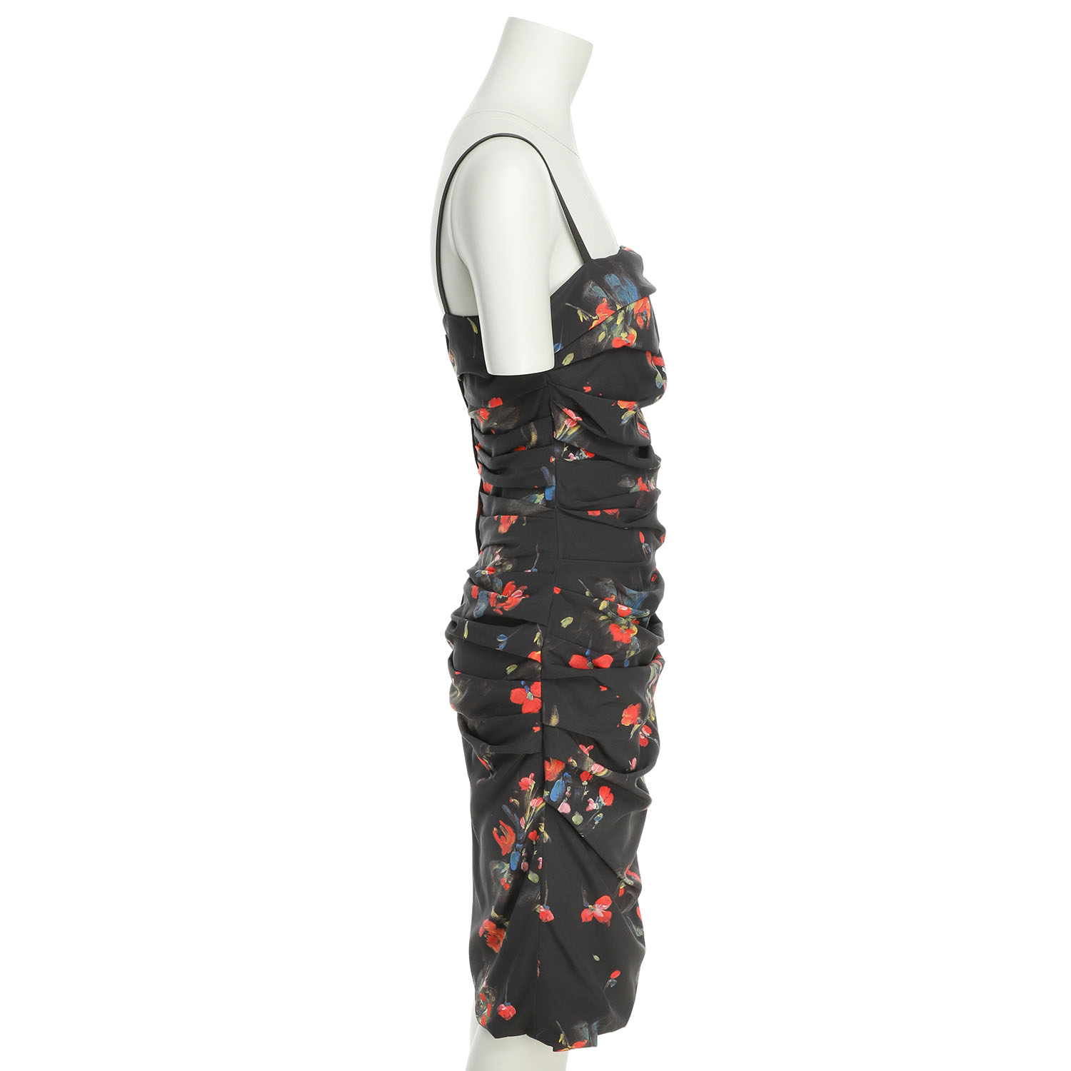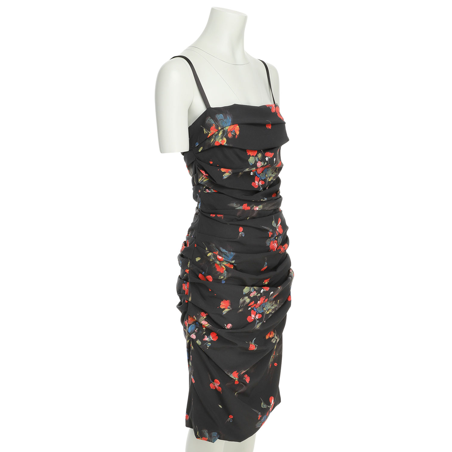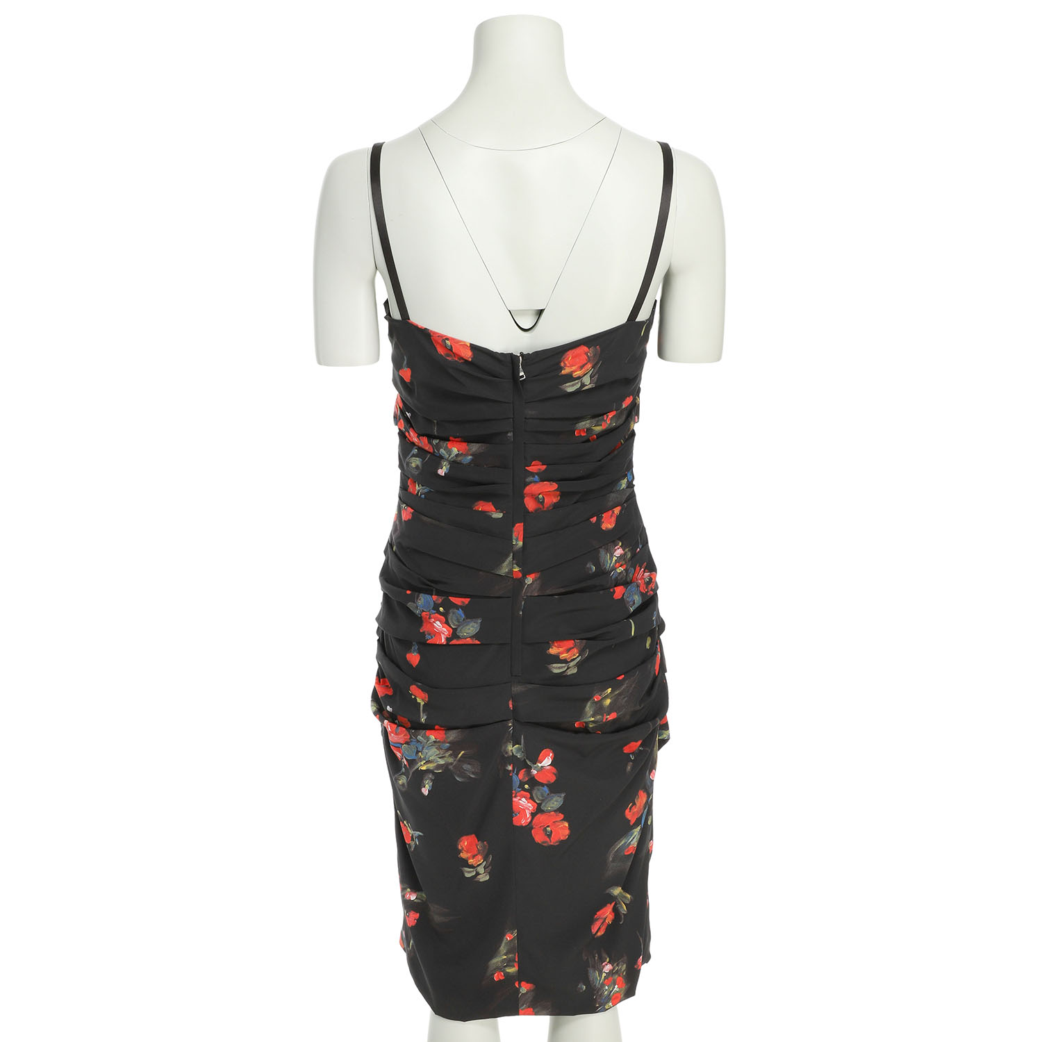 Seidengemisch. Schwarzes Modell mit Raffungen, schmalen Trägern, floralem Design und Reißverschluss im Rückteil. Sehr guter Zustand.