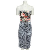 Seidengemisch. Tragerloses Modell mit Bustier Oberteil, Raffung, schwarz mit floralem Motiv und Rock leicht ausgestellt mit blauem Leopradendesign. Änderungen vorhanden, Verlängerung.
