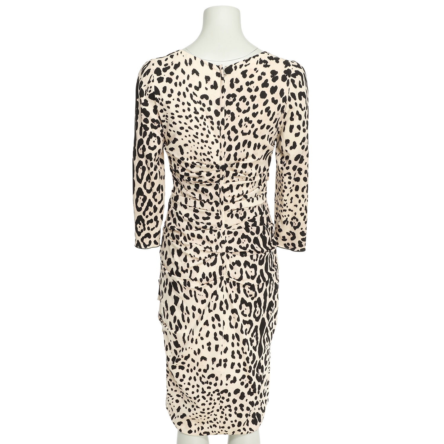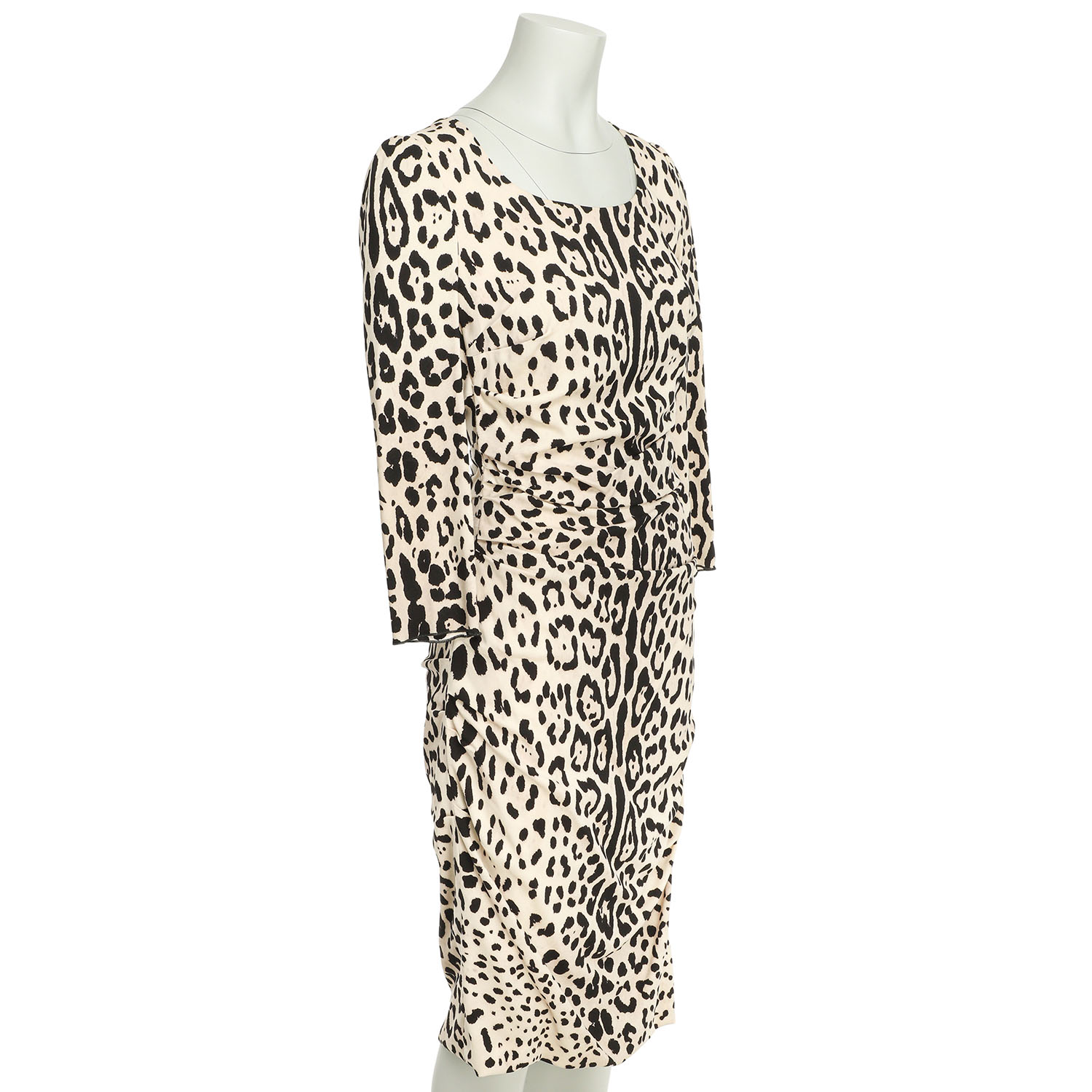 Seidengemisch. Cremefarbener Grund mit Leoparden-Design, Raffung an der Taille und Reißverschluss im Rückteil. Saum wurde verlängert.